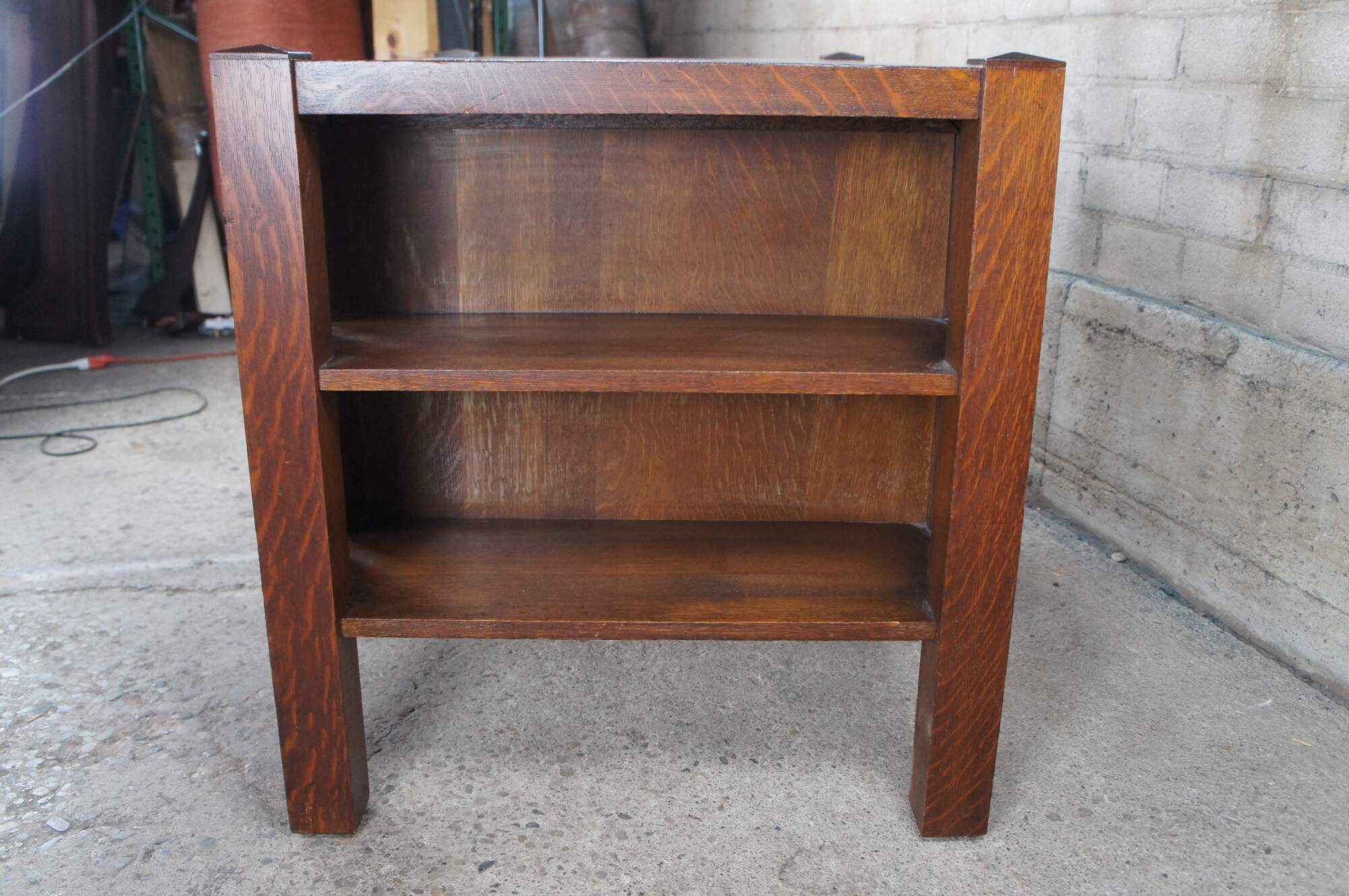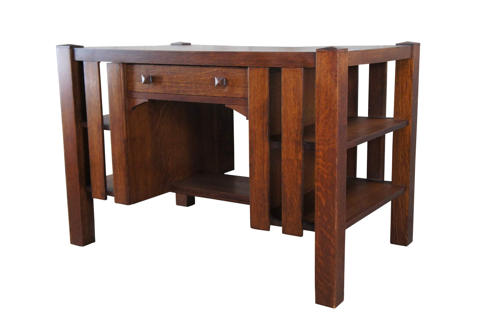 An early 20th Century Mission / Arts & Crafts / Craftsman library table. Features a rectangular form made from quartersawn oak with a dovetailed drawer flanked by bookshelves on the outside. The desk is finished on all sides allowing for use in the middle of any room or library.