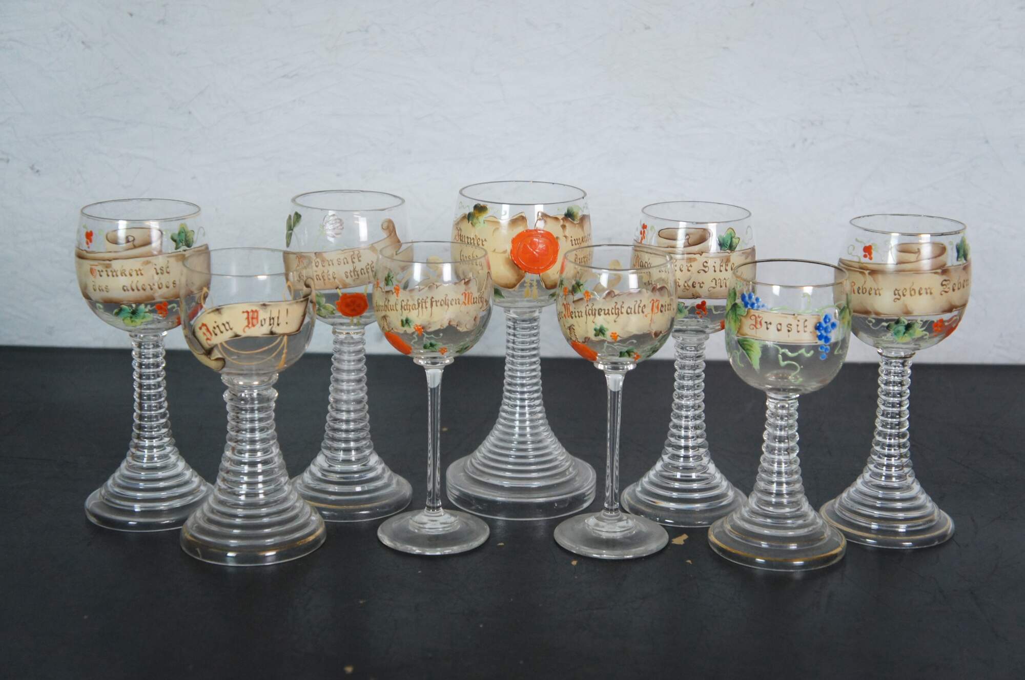 Immense and rare 83 piece lot of antique Bohemian / German glassware / bar glassware - clear hand blown glass with hand painted enamel mottos and beehive designs. Some with gilt details. Most also feature red / orange wax seal. Set includes: 2 Coasters, 6 Shot Glasses, 6 Schnapps / Cordial Glasses, 4 Mugs, 26 Tumblers / Beer Glasses, 20 Goblets, 1 Lidded Stein, 12 Decanters, 3 Pitchers, and 3 Tall Lidded Canisters / Celery Vases.