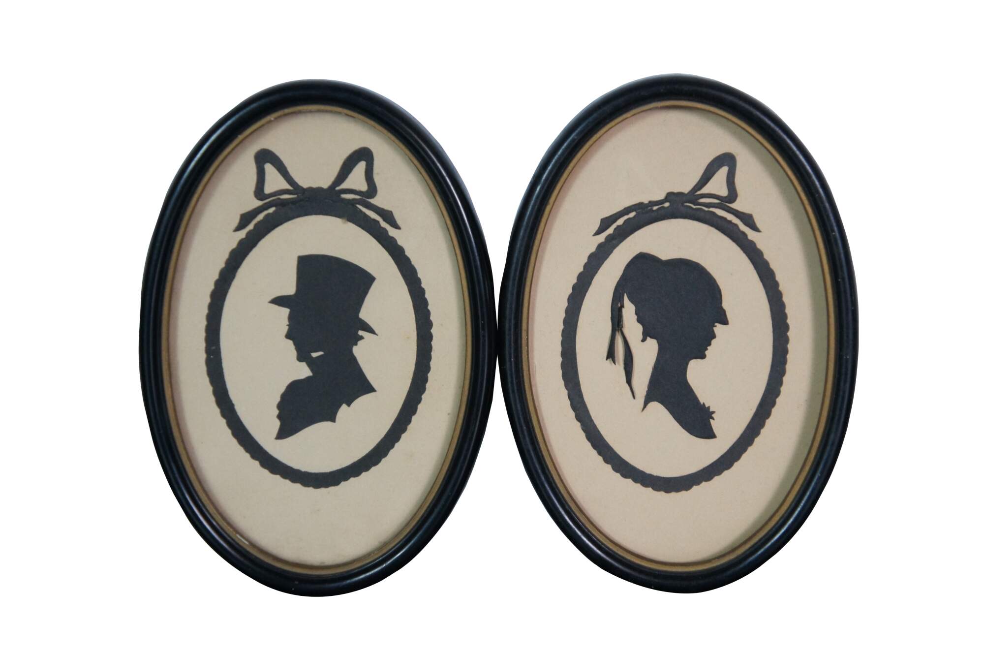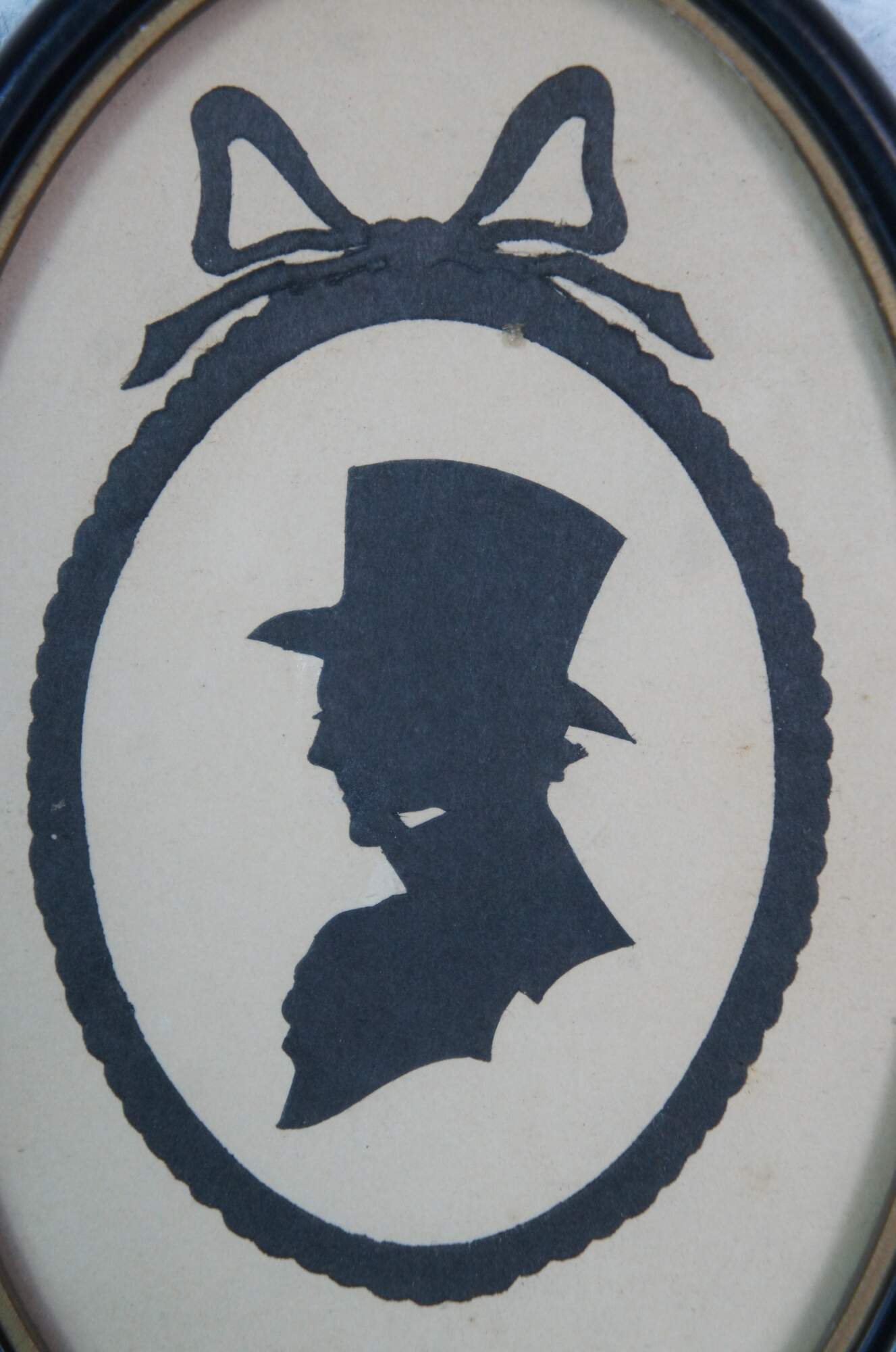 Set of three framed black cut paper silhouettes. Victorian / Edwardian pair in oval frames depicting a gentleman in top hat and a woman in a rounded hat, surrounded by wreaths. Rectangular framed gentleman in glasses and tie; pencil signed in lower left corner.
