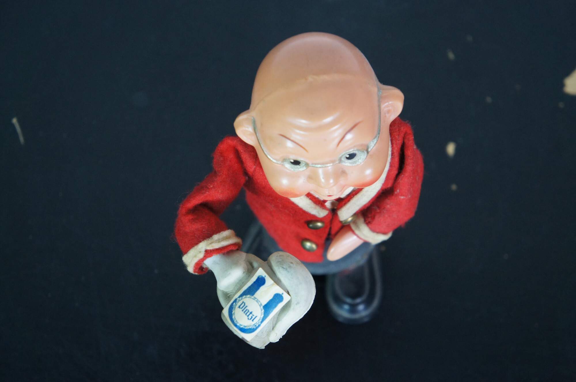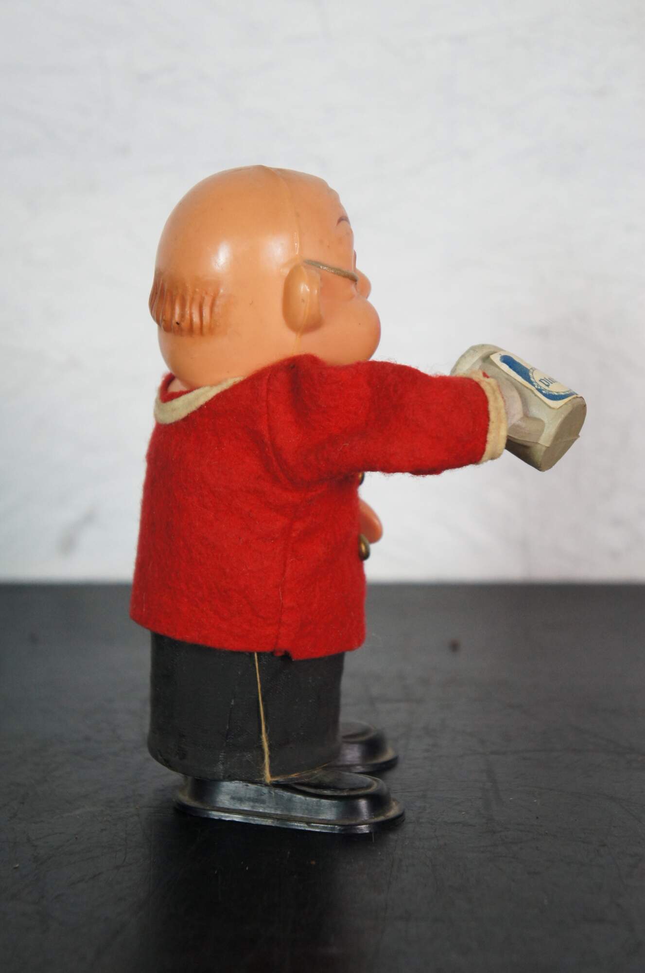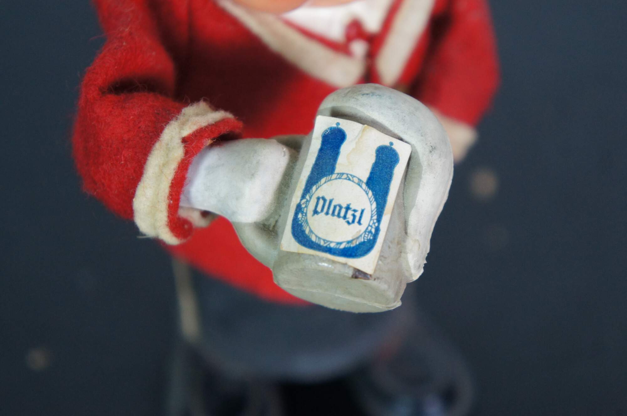 Mid 20th century bouncing drinking man toy with celluloid / plastic head, hands and feet and a felt outfit, holding in one hand a stein of Platzl beer. Made in Western Germany by Rolly Toys.