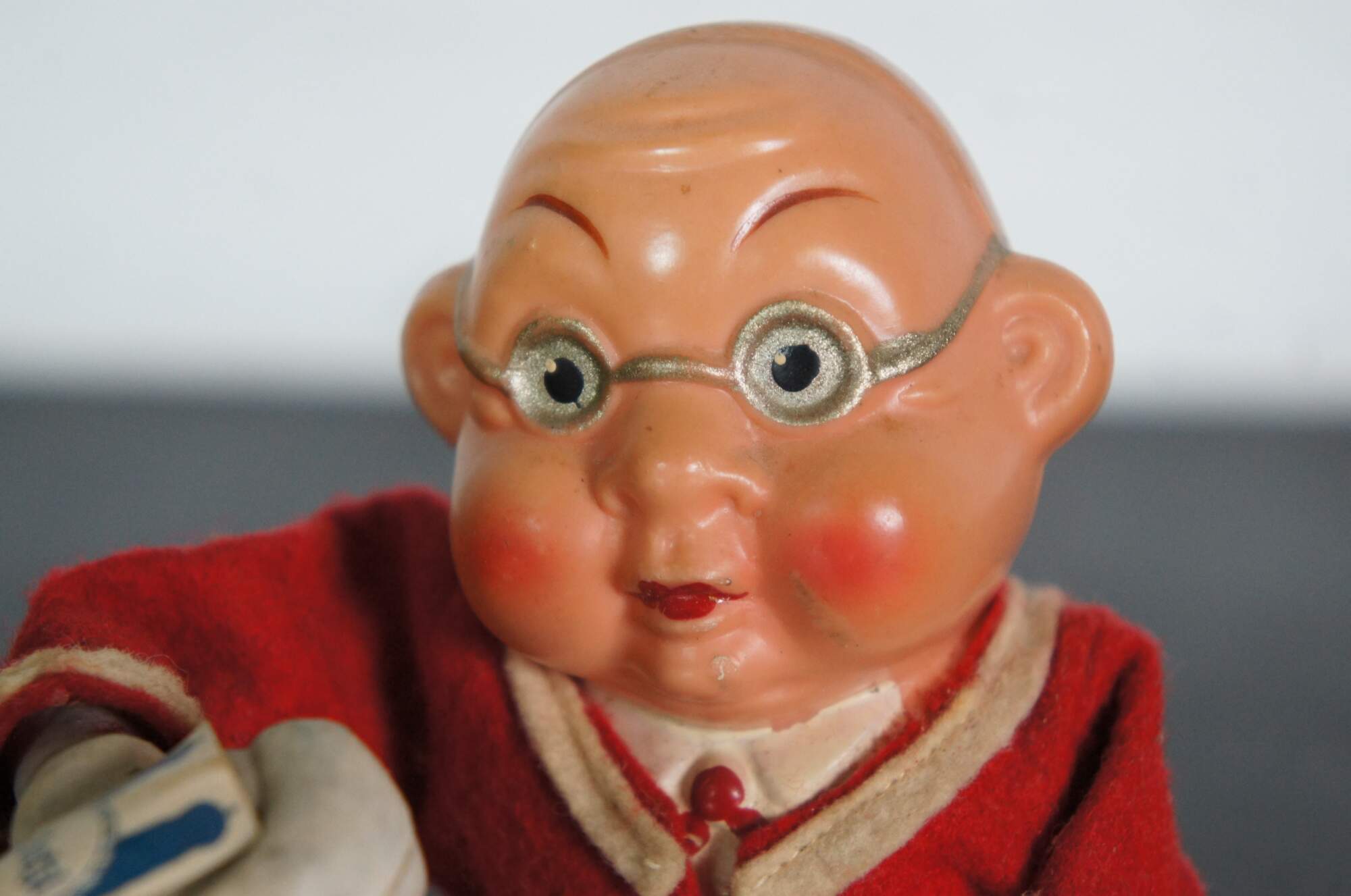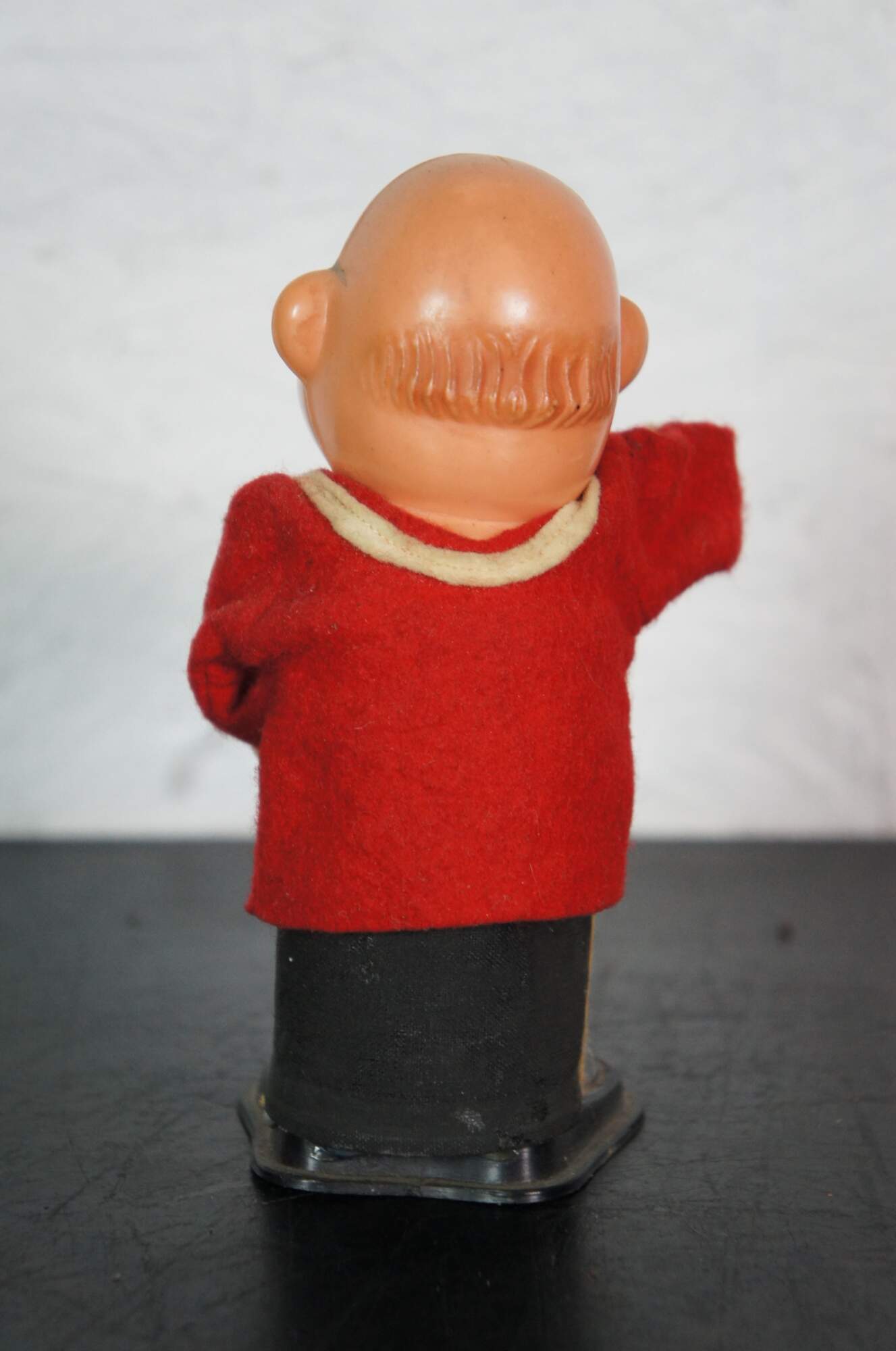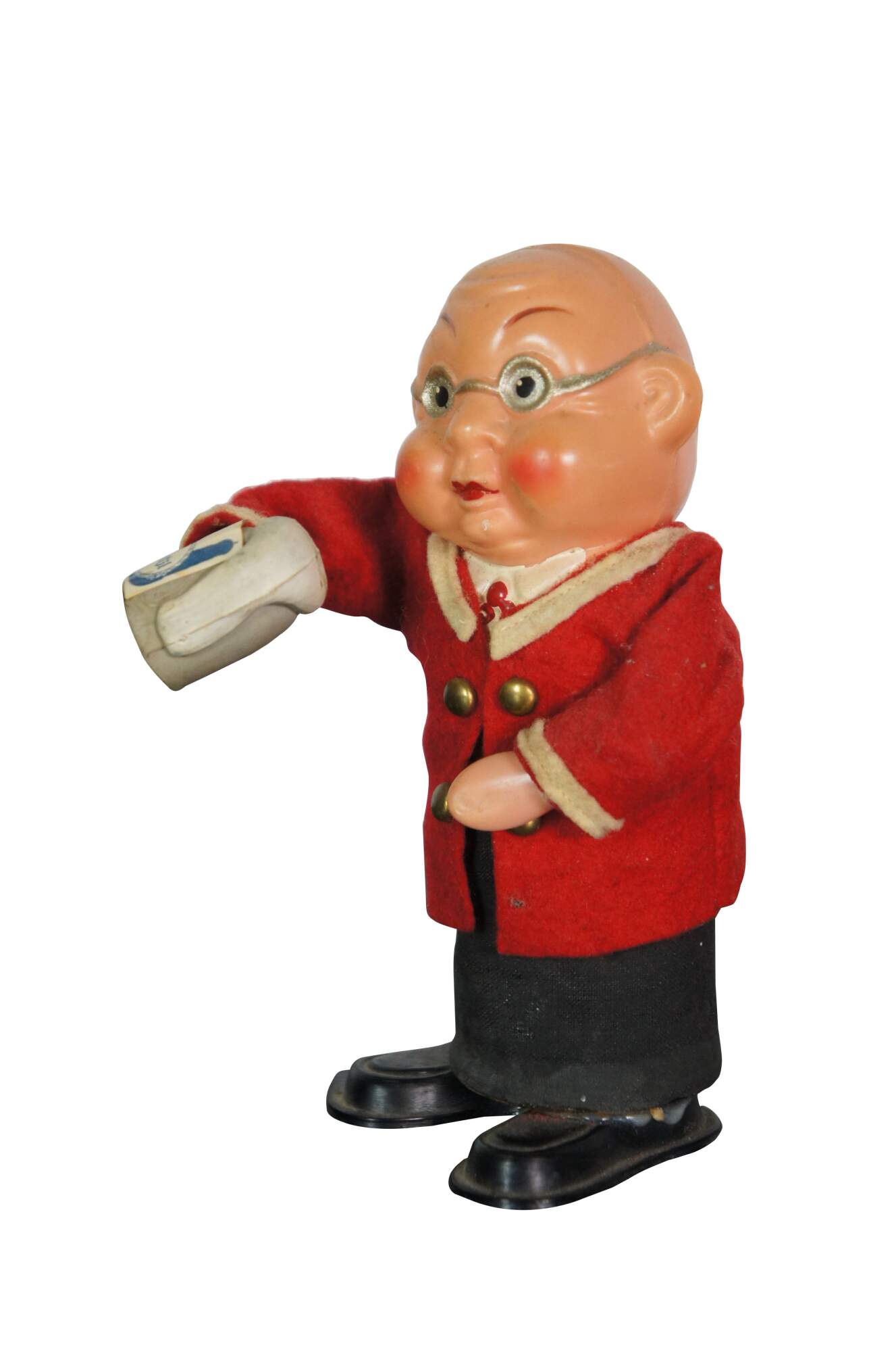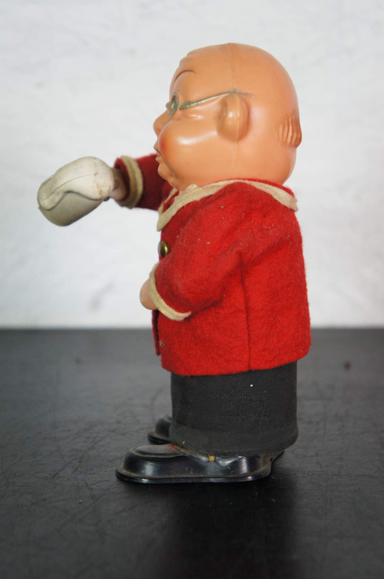 Mid 20th century bouncing drinking man toy with celluloid / plastic head, hands and feet and a felt outfit, holding in one hand a stein of Platzl beer. Made in Western Germany by Rolly Toys.