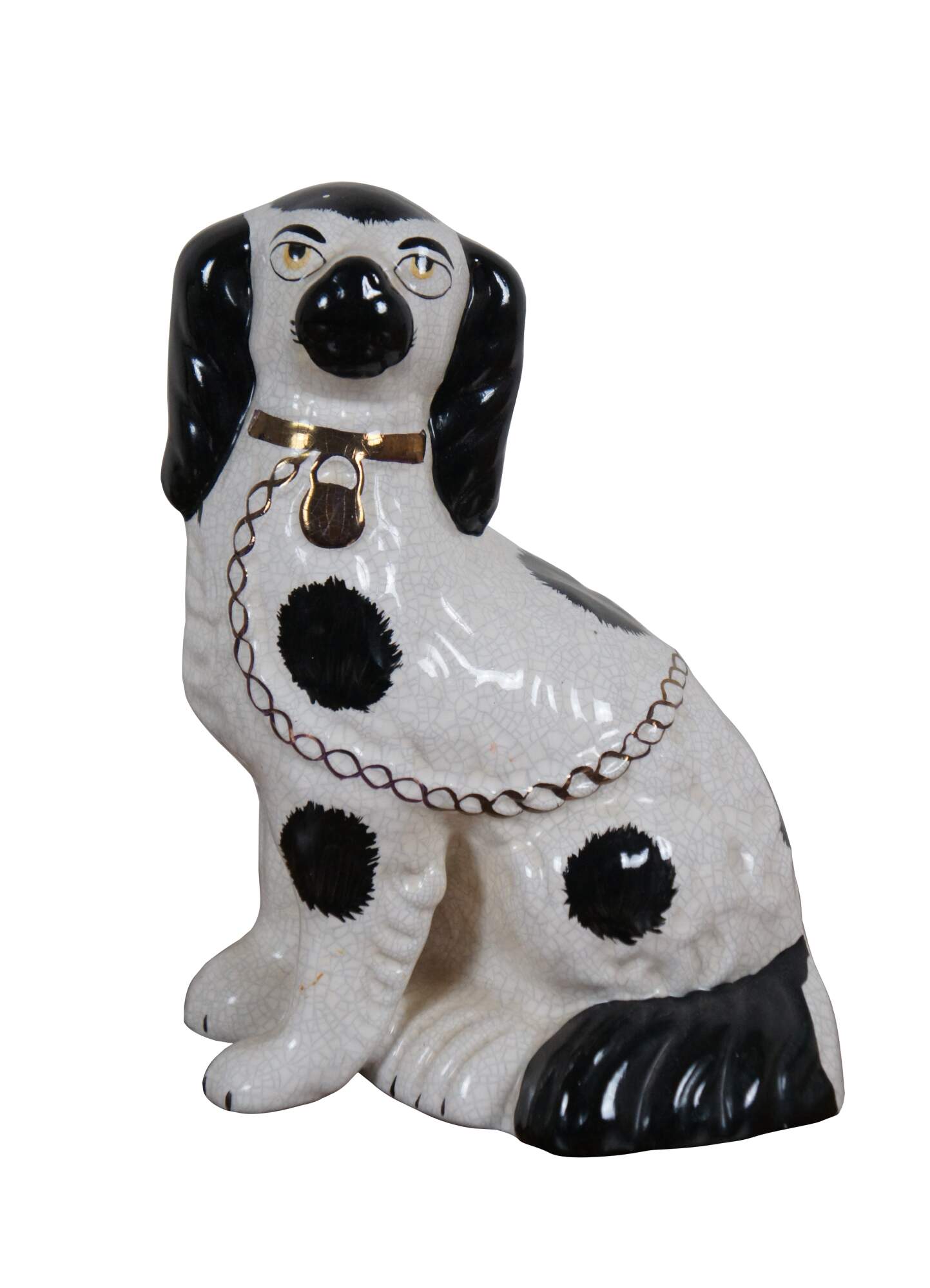 Pair of late 20th century reproduction Staffordshire style figurines - black and white spotted King Charles Spaniels with painted features, gilt collars / chain leashes, and factory distressed crazing. Stamped on base "Fine Staffordshire Earthenware Made in England.