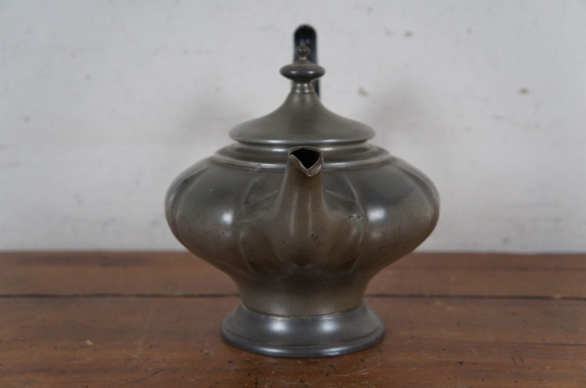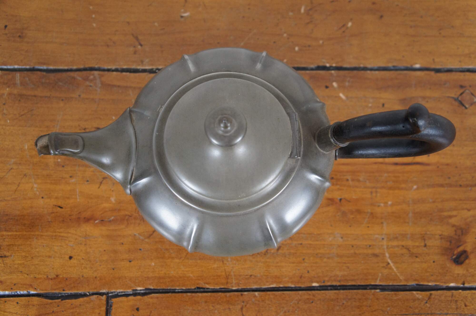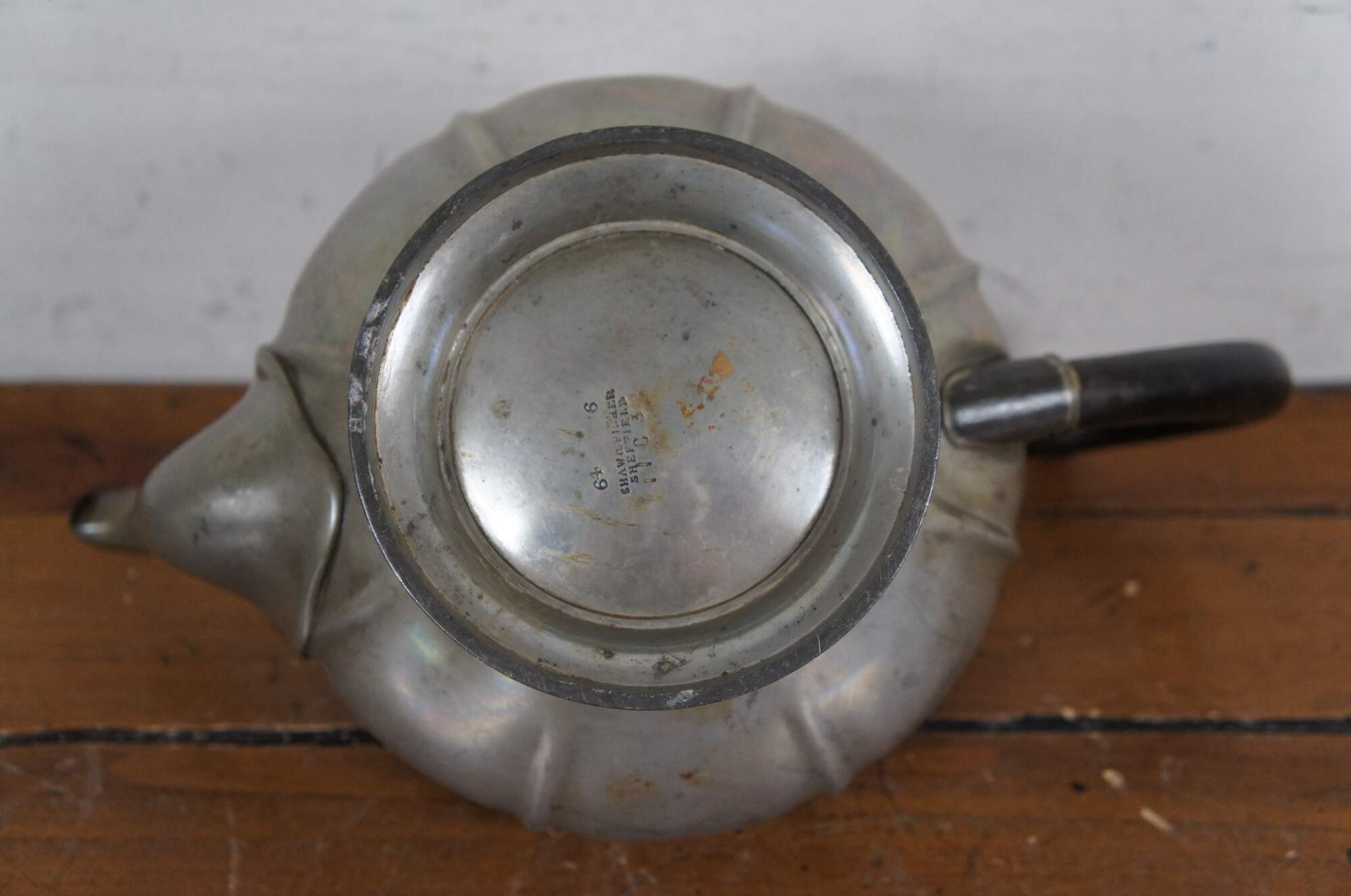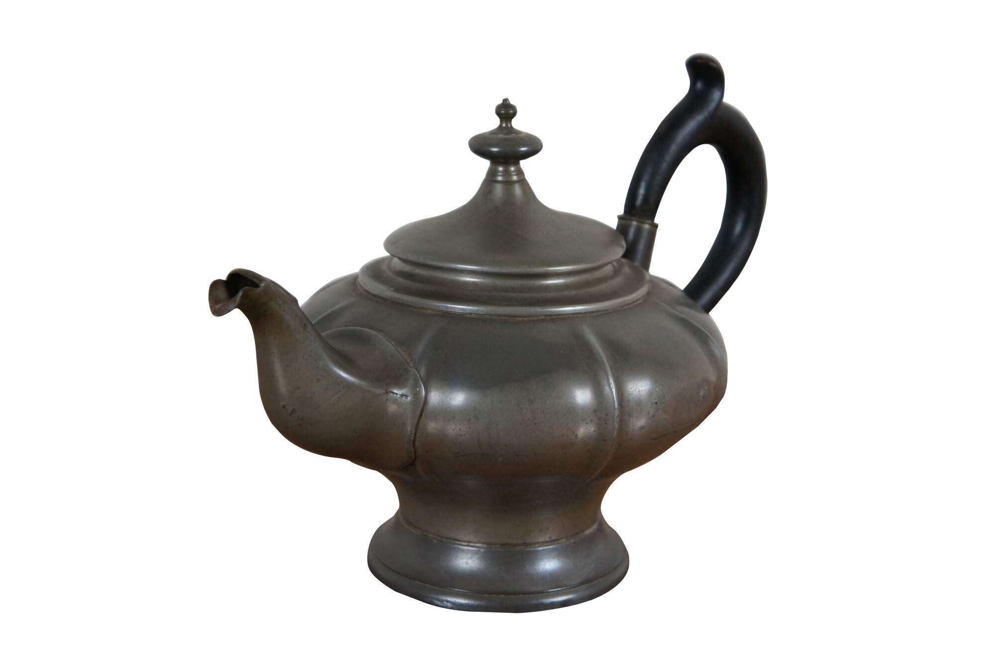 Mid 19th century English pewter teapot by Shaw and Fisher (mark used until 1872). Onion shaped body with footed base and top shaped finial. Dark wood handle.