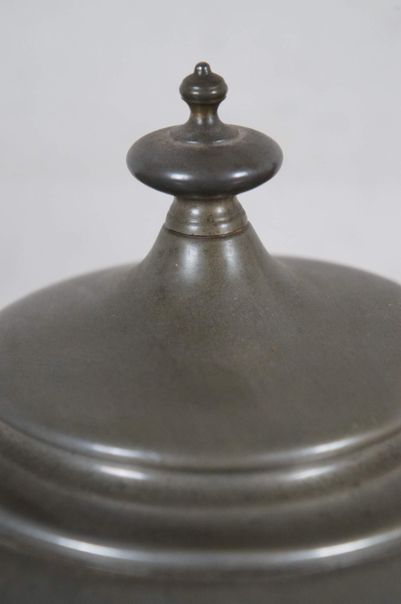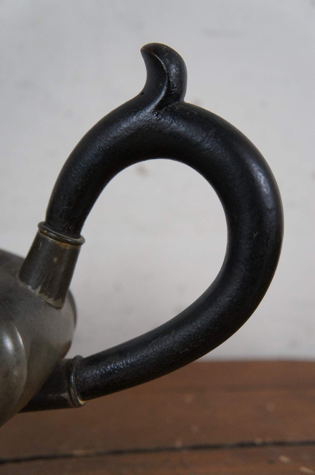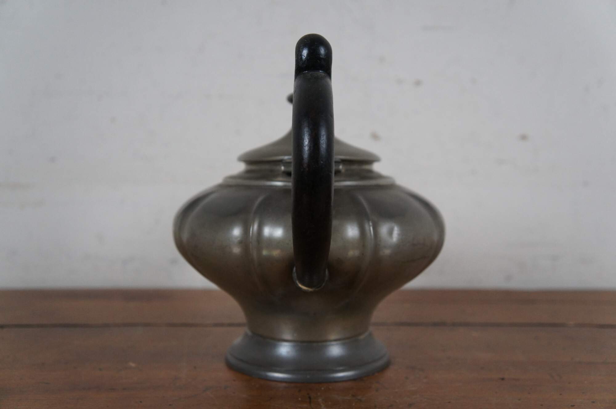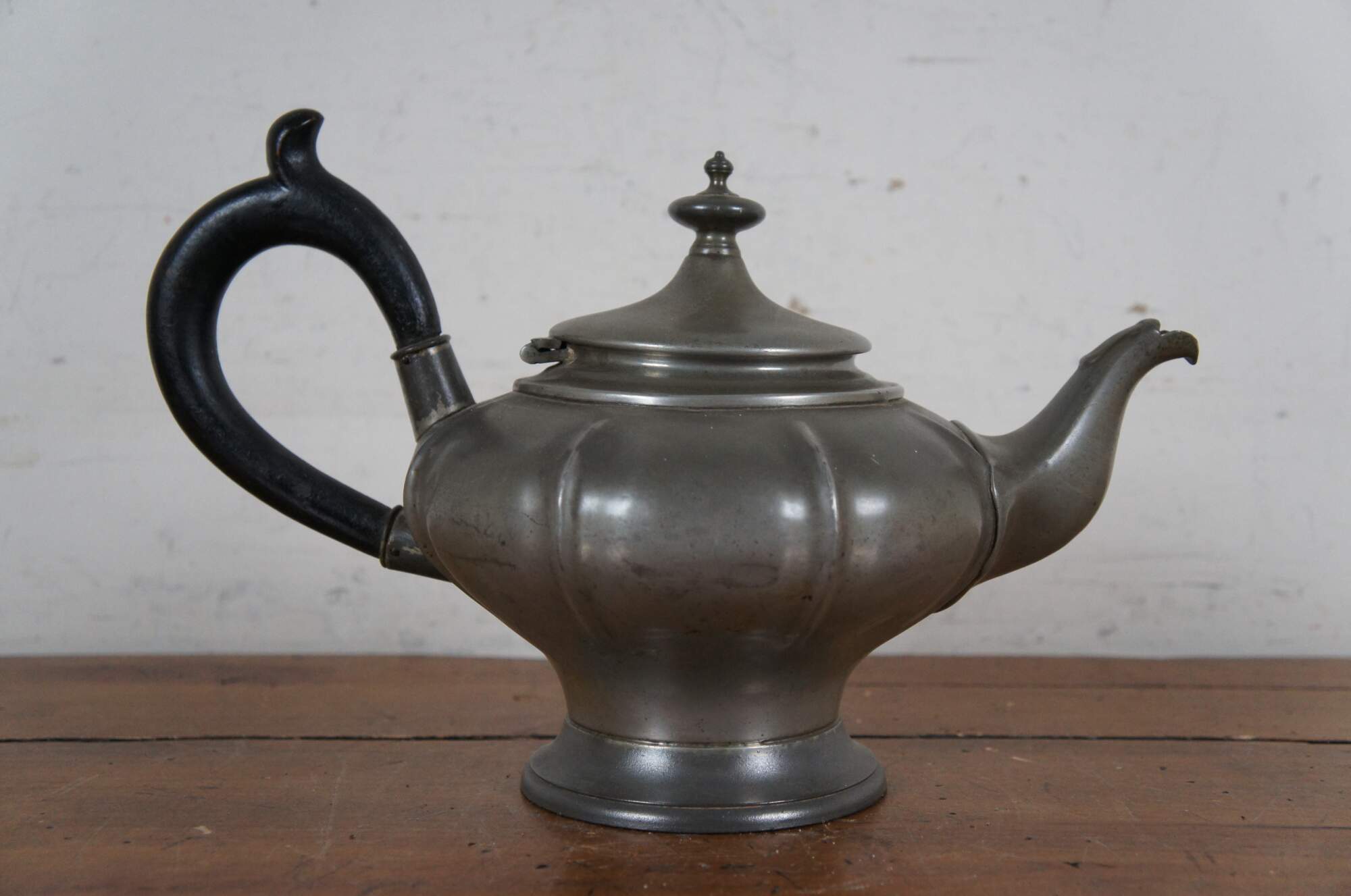 Mid 19th century English pewter teapot by Shaw and Fisher (mark used until 1872). Onion shaped body with footed base and top shaped finial. Dark wood handle.