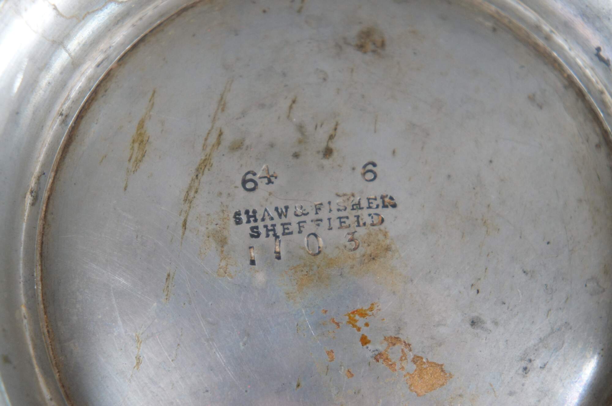 "The Shaw family specialised in the manufacture of Britannia metal goods. The business was originally based in Whitecroft and Pea Croft, where Matthew Shaw was a whitesmith. In 1821, he was listed at Whitecroft as a table knife, silver and brass bolster manufacturer. His death at the age of 55 was reported in The Sheffield Independent on 3 May 1823. Two of his sons – George Shaw (1798-1861) and James Shaw (1800-1878) – continued to trade in Britannia goods. George Shaw & Co was listed at Pea Croft in the early 1820s. By 1828, George had been joined by his brother James at Kellam’s Wheel. Their partnership had ended by 1829, when George relocated to Allen Street. James Shaw had married Matilda Fisher and by 1833 was in partnership with her brother, Thomas Fisher (1803-1870). Shaw & Fisher traded at Kelham Works, Kelham Island (in premises later covered by Kelham Rolling Mills). In 1835, Shaw & Fisher moved to Howard Place, Eyre Lane. In about 1842, the partners relocated to Norfolk Place, Suffolk Road. The firm’s specialities were tea and coffee sets, and dishes and covers. Apparently, James Shaw was the traveller, who began by journeying by stagecoach to local markets, then extended his travels to London and the Continent. In the early 1850s, extensive dealings were conducted through their agent in New York, Charles Congreve. By the 1870s, Shaw & Fisher goods were sold in Australia and New Zealand. Shaw retired to France in about 1860, and later lived in Jersey and Brighton. He died on 1 March 1878. Thomas Fisher died on 24 September 1870. In his last years, Thomas Fisher increasingly relied upon his son, Henry (1832-1878). The latter was joined by Frederick Hall (c.1826-1893), who was the firm’s long-serving bookkeeper and traveller (Century’s Progress, 1893). He was the youngest son of John Hall, who had been a cutlery manufacturer at Cornhill. However, Henry Fisher died at his residence Norwood Grange on 21 December 1878. Frederick Hall and his son, William Wootton Hall (1852-1899), became the owners of Shaw & Fisher. The firm held patents for seamless Britannia metal dish-covers and Hall’s teapot infuser. Other articles were an improved hydrostatic percolator and a range of earthenware jugs, with Britannia and electro-plated covers. The company registered a silver mark ‘FH’ in 1884, which highlighted its involvement in the electro-plate trade. Hard white-metal goods were also produced. ‘SHAW & FISHER’ had been stamped on the firm’s products until 1872, when a cross-arrows mark (with the letters ‘S F’) was adopted. Frederick Hall died from influenza and pneumonia at Oak Grove, Collegiate Crescent on 12 June 1893. The business had probably been contracting since the 1870s, when Britannia metal was increasingly superseded by electro-plate. Shaw & Fisher had only slowly embraced this technology, perhaps because the Suffolk Road workshops were too small to install electro-plating tanks (though the firm did have melting furnaces). In 1894, Shaw & Fisher’s assets, goodwill, stock-in-trade and tools were offered for sale as a going concern or in separate lots (Sheffield Independent, 1 May 1894). The firm was broken up. The cross arrow trade mark was acquired by James Deakin & Sons Ltd, which used it prominently. That mark later passed to I. S. Dearden, when it acquired Deakin. The firm also used the trade mark BRISBANE SILVER." (Source: Hawley Sheffield Knives / Silver Collection)