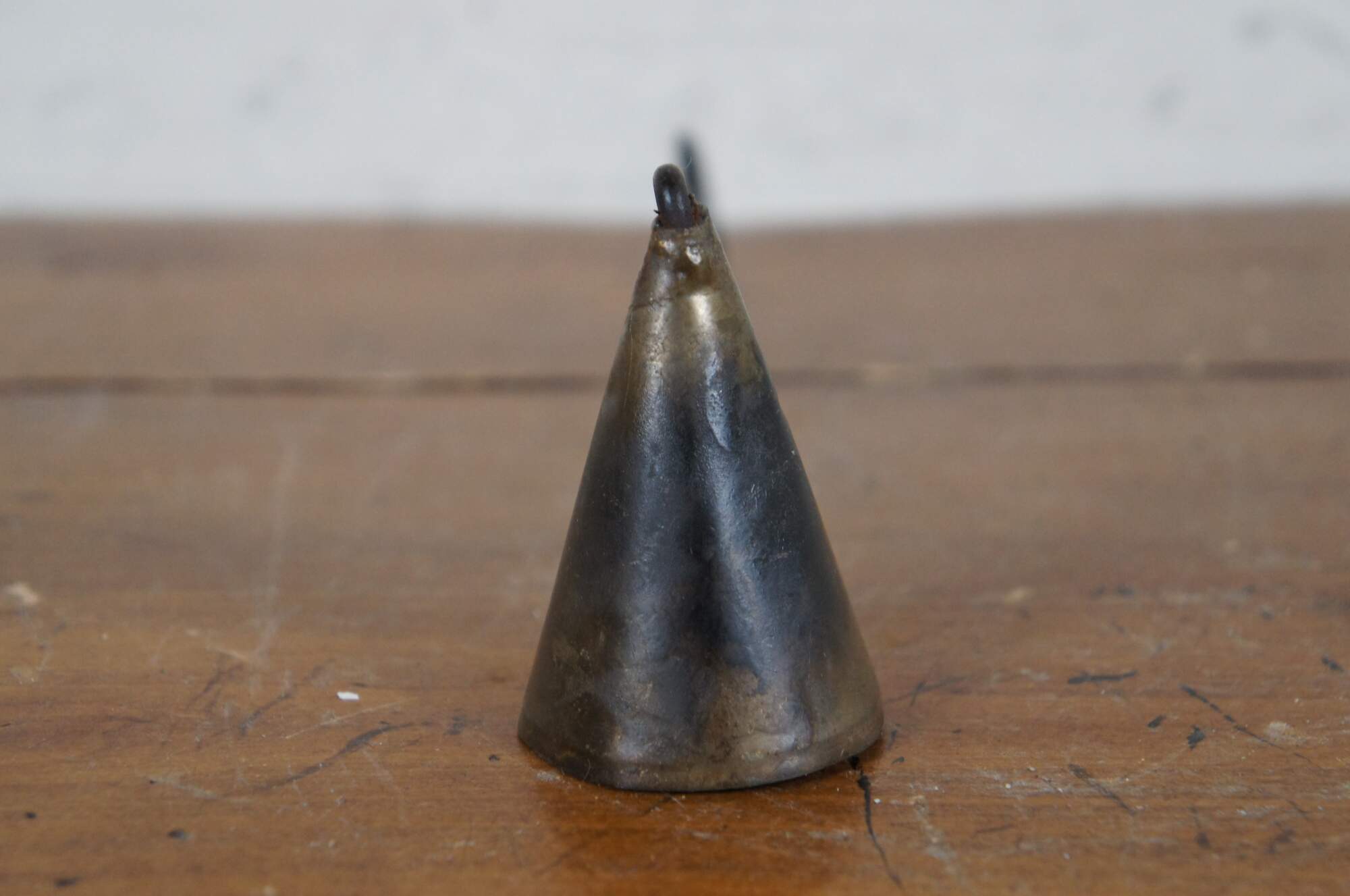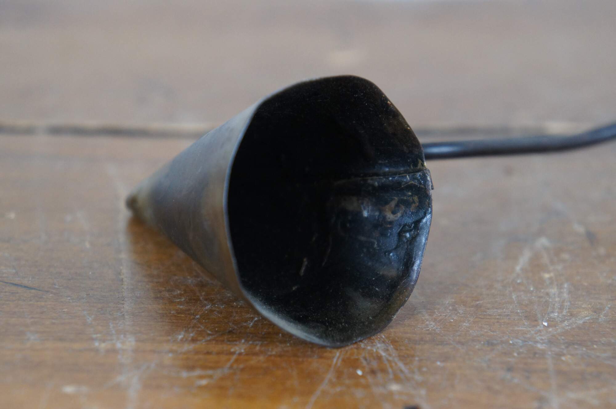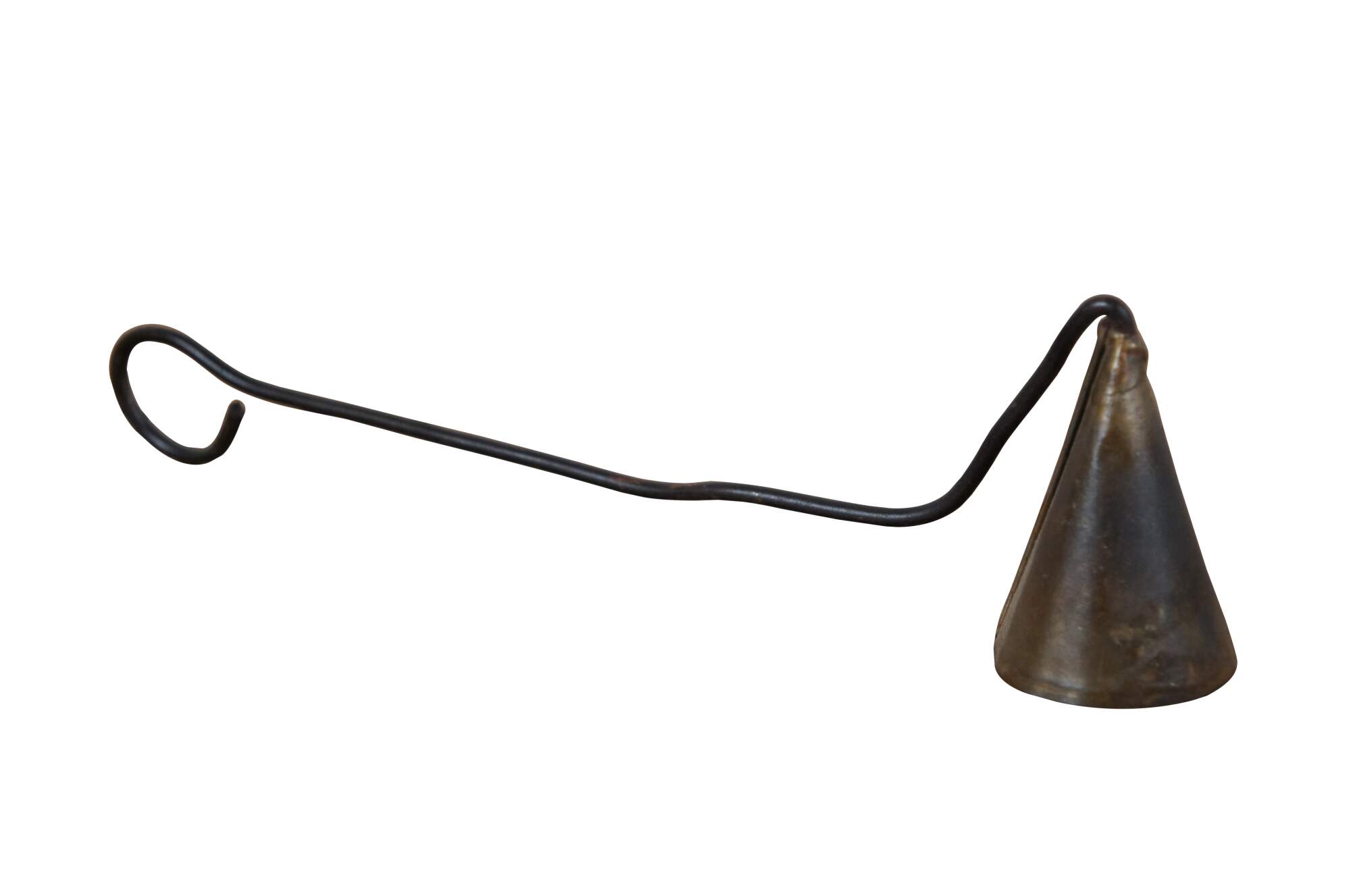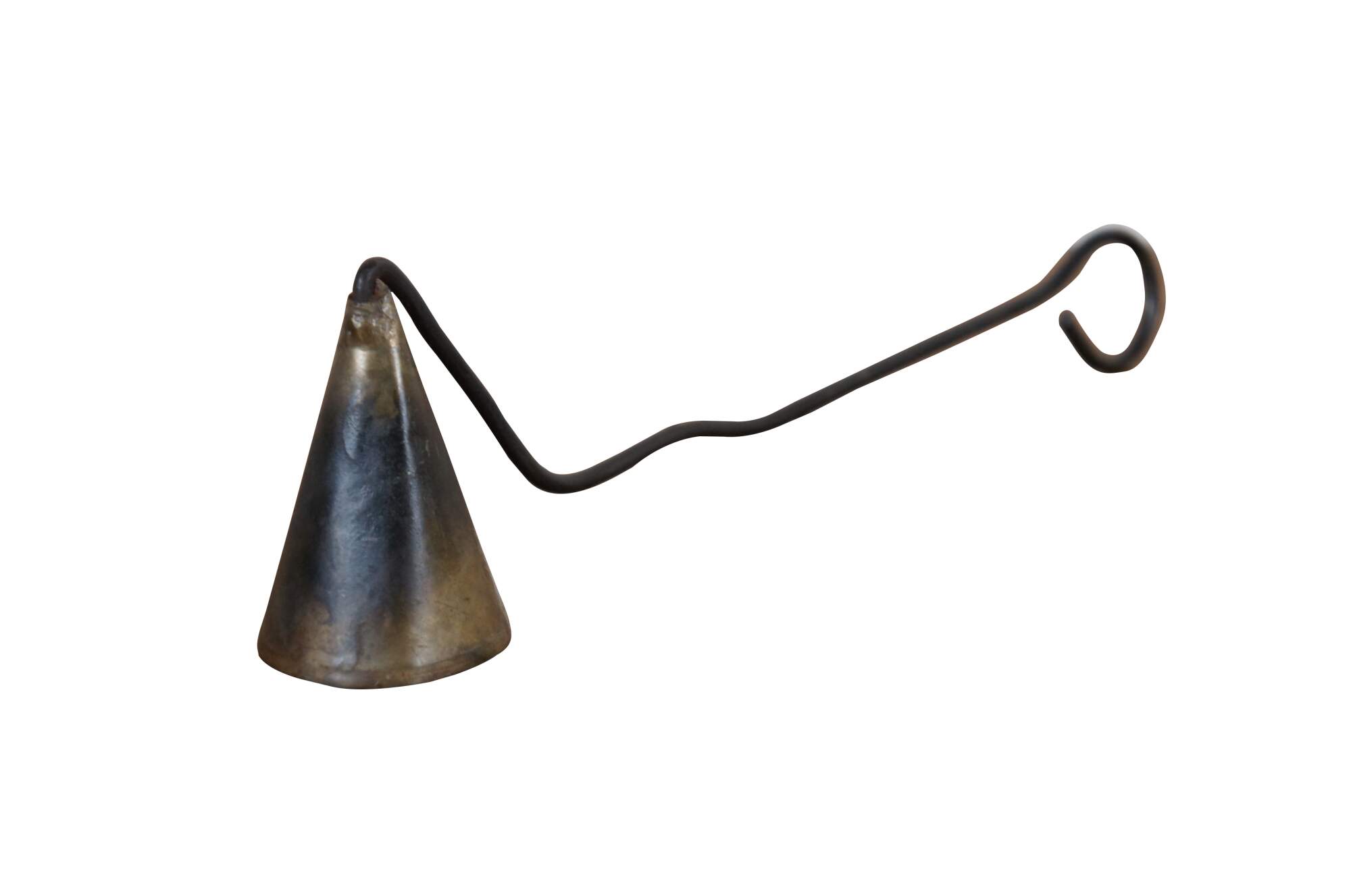 Antique 20th century Early American style tin candle snuffer featuring a triangular bell and slim wrought iron handle.