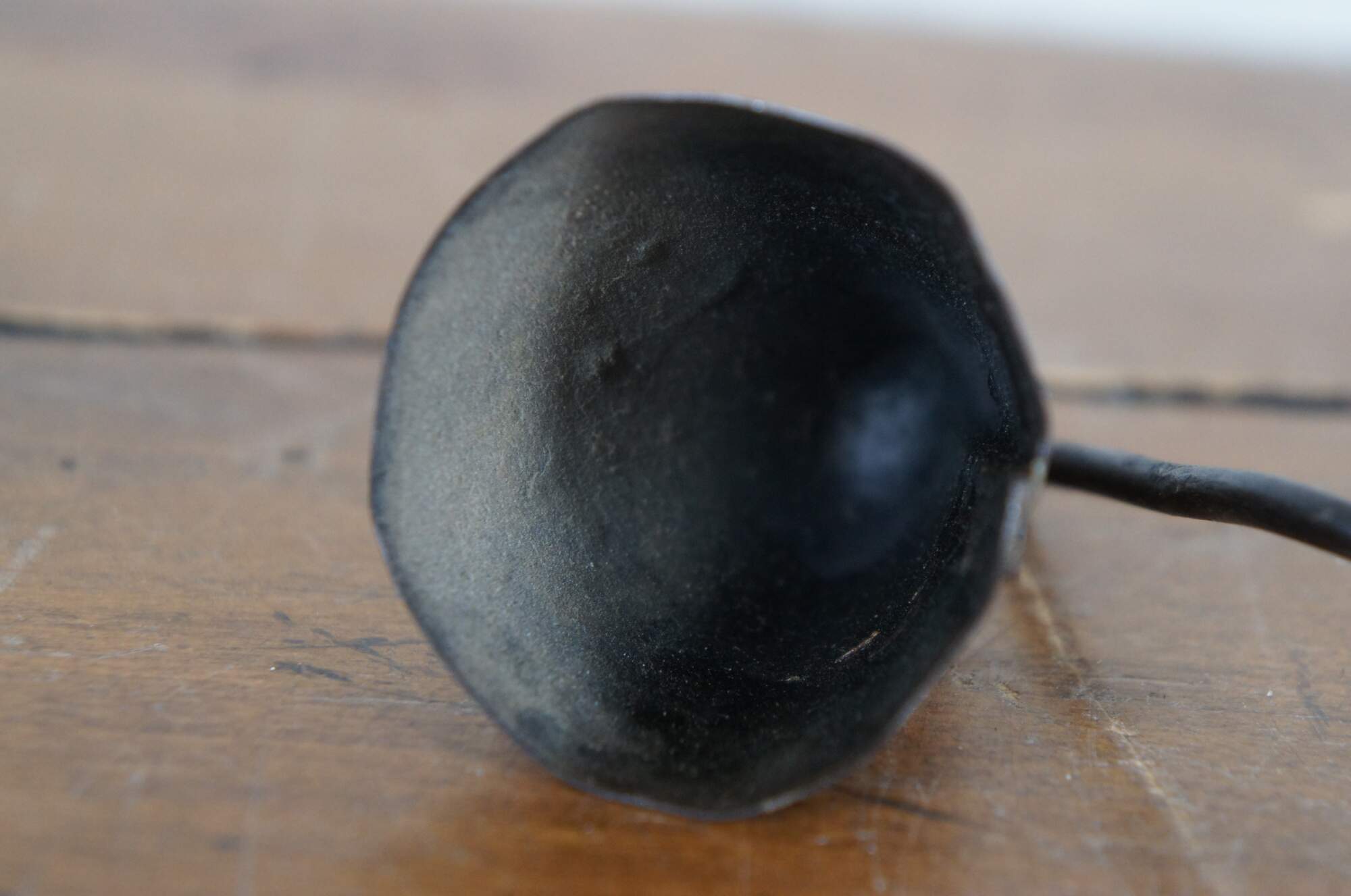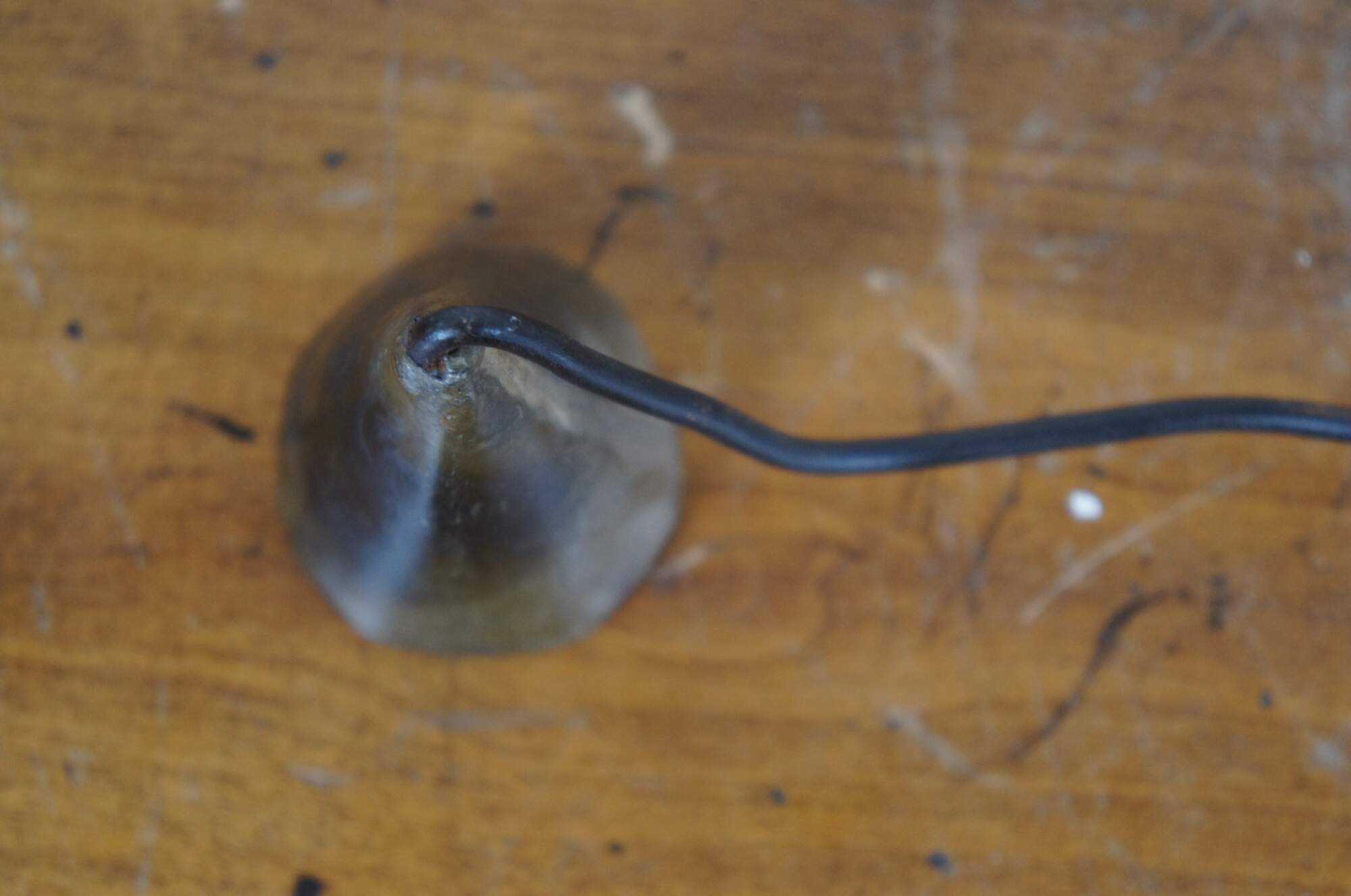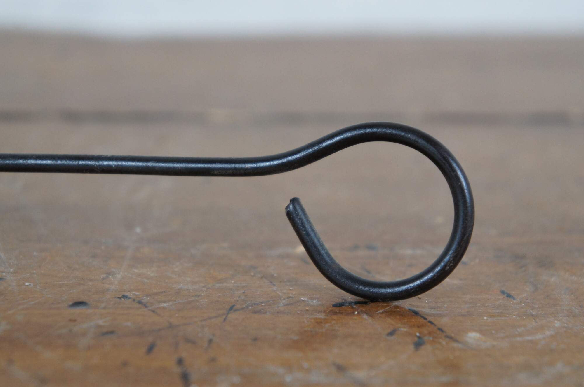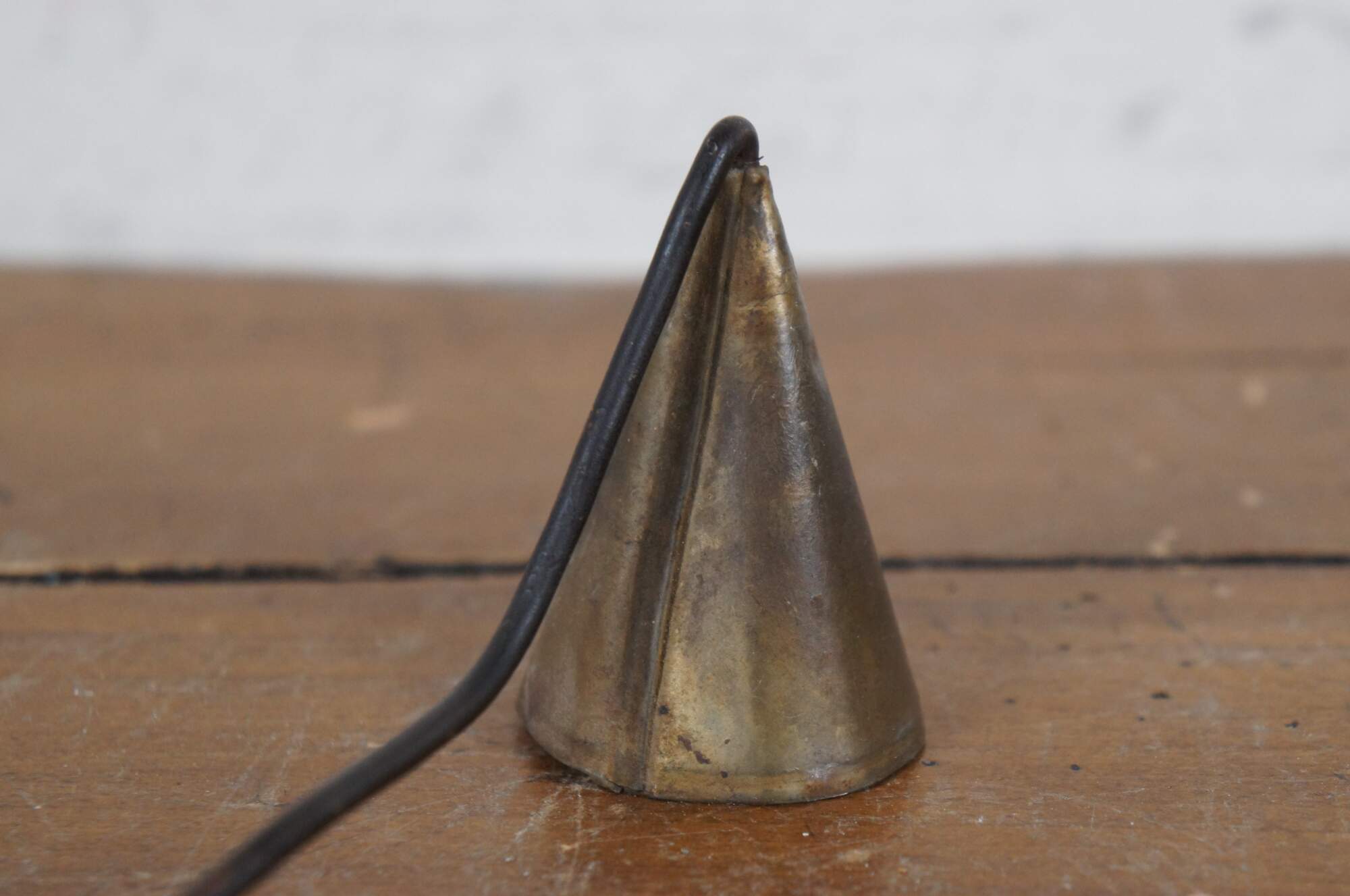 Antique 20th century Early American style tin candle snuffer featuring a triangular bell and slim wrought iron handle.