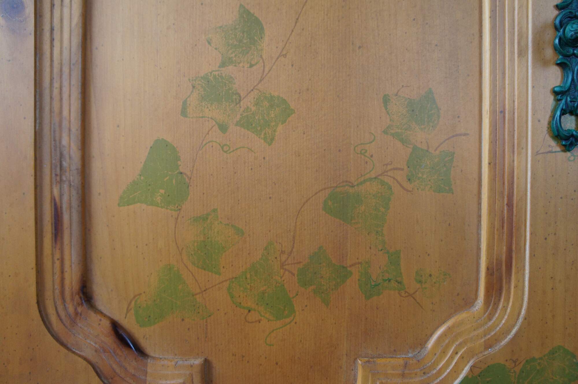 Vintage French Provincial pine console cabinet / cupboard / entry table / drybar featuring rectangular form with paneled doors, painted ivy / vine design, serpentine apron and chunky cabriole legs.
