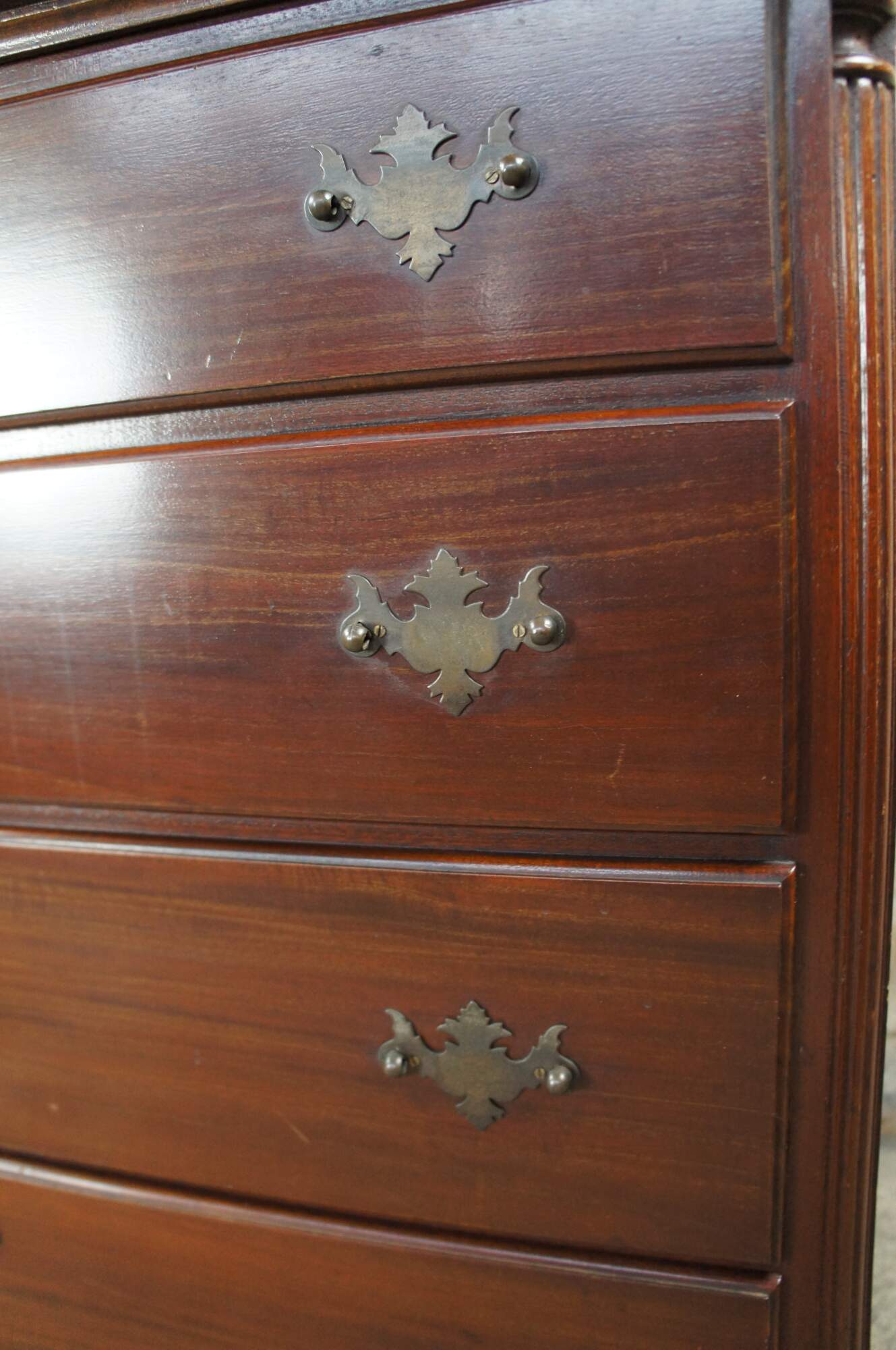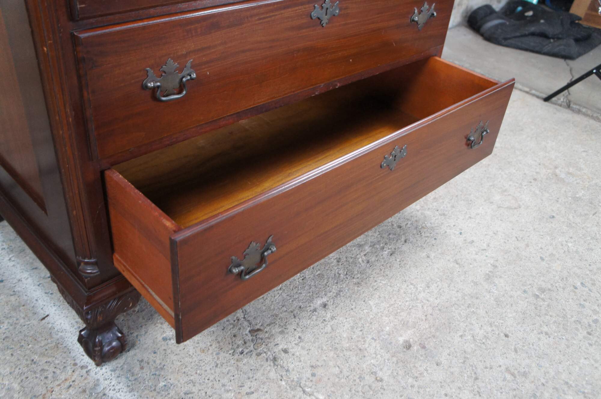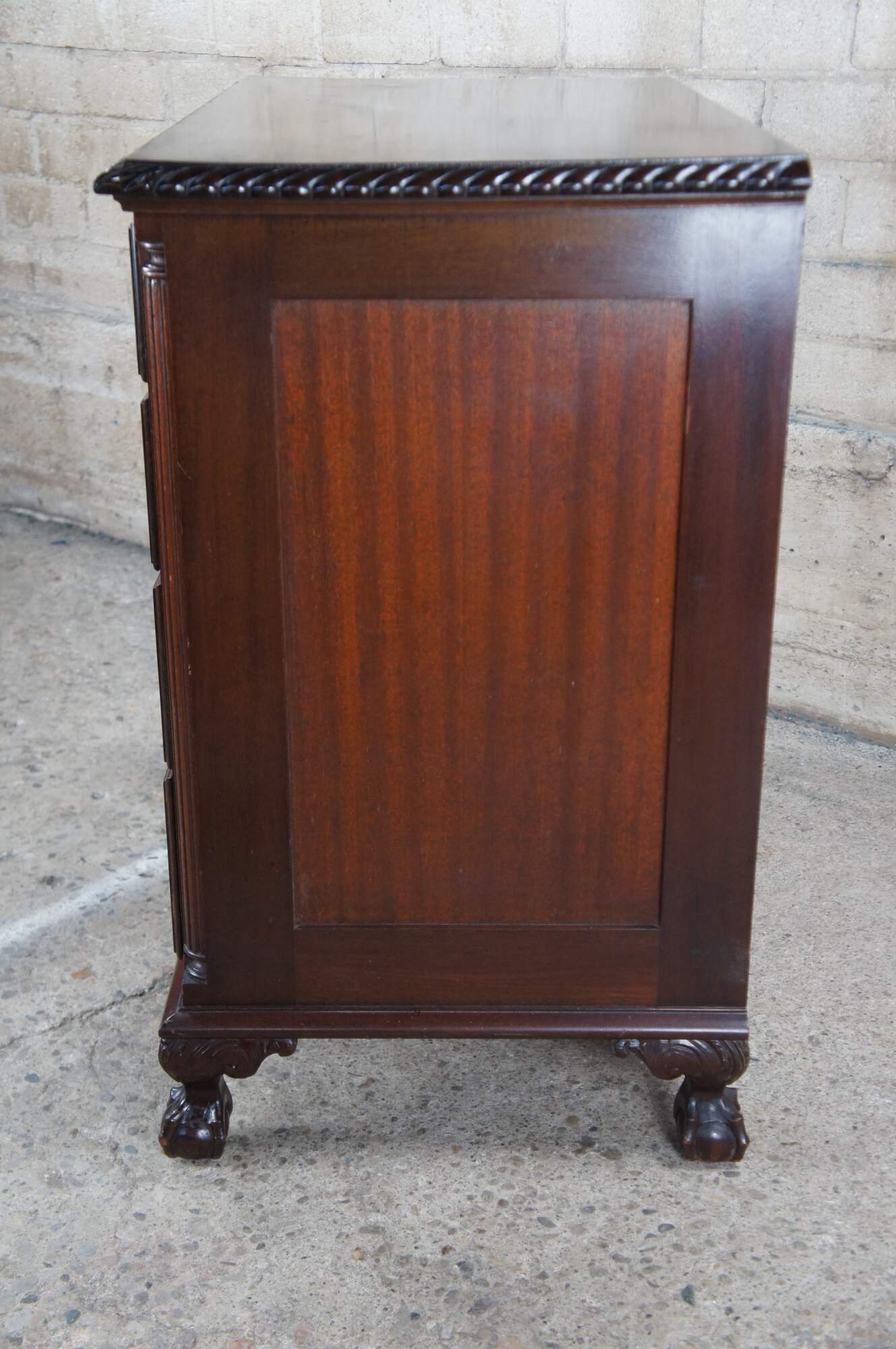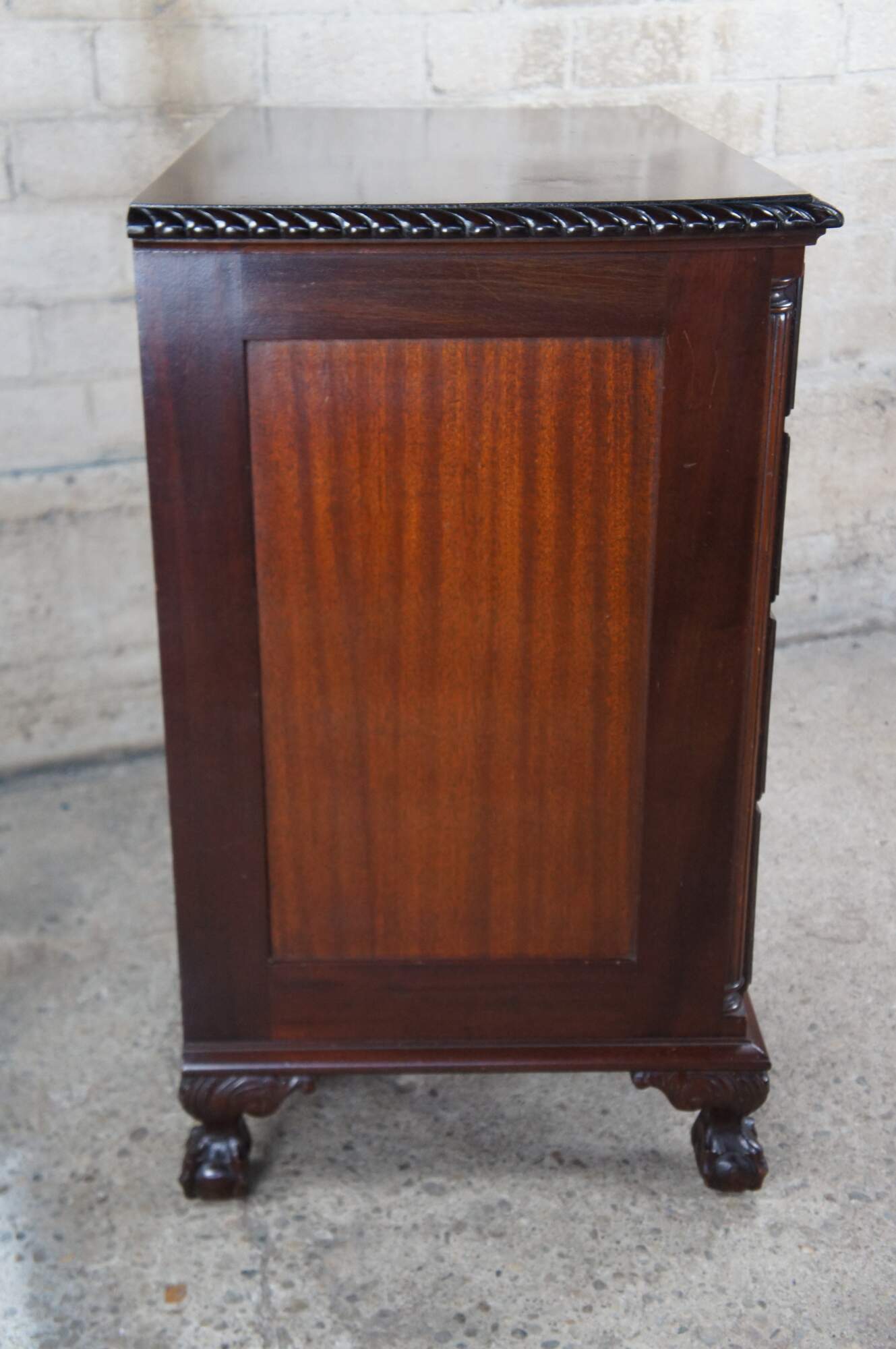 Vintage Feldenkreis Reproductions bachelors mule chest or trunk console. Made of mahogany and cedar featuring Chippendale styling with fluted columns, paneled sides, hinged lid that opens to large storage area, large bottom drawer, Federal style brass hardware, and ball and claw feet.