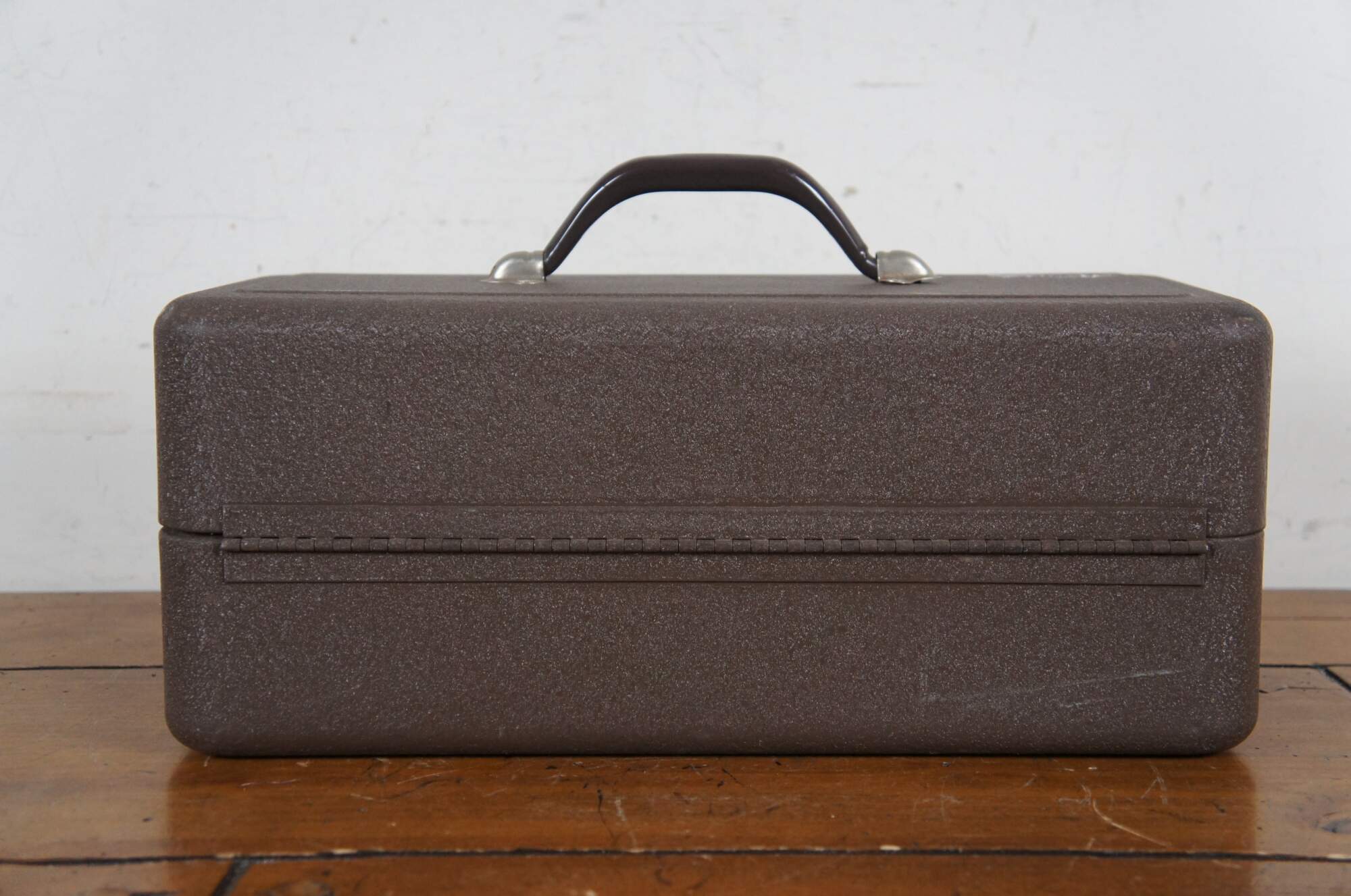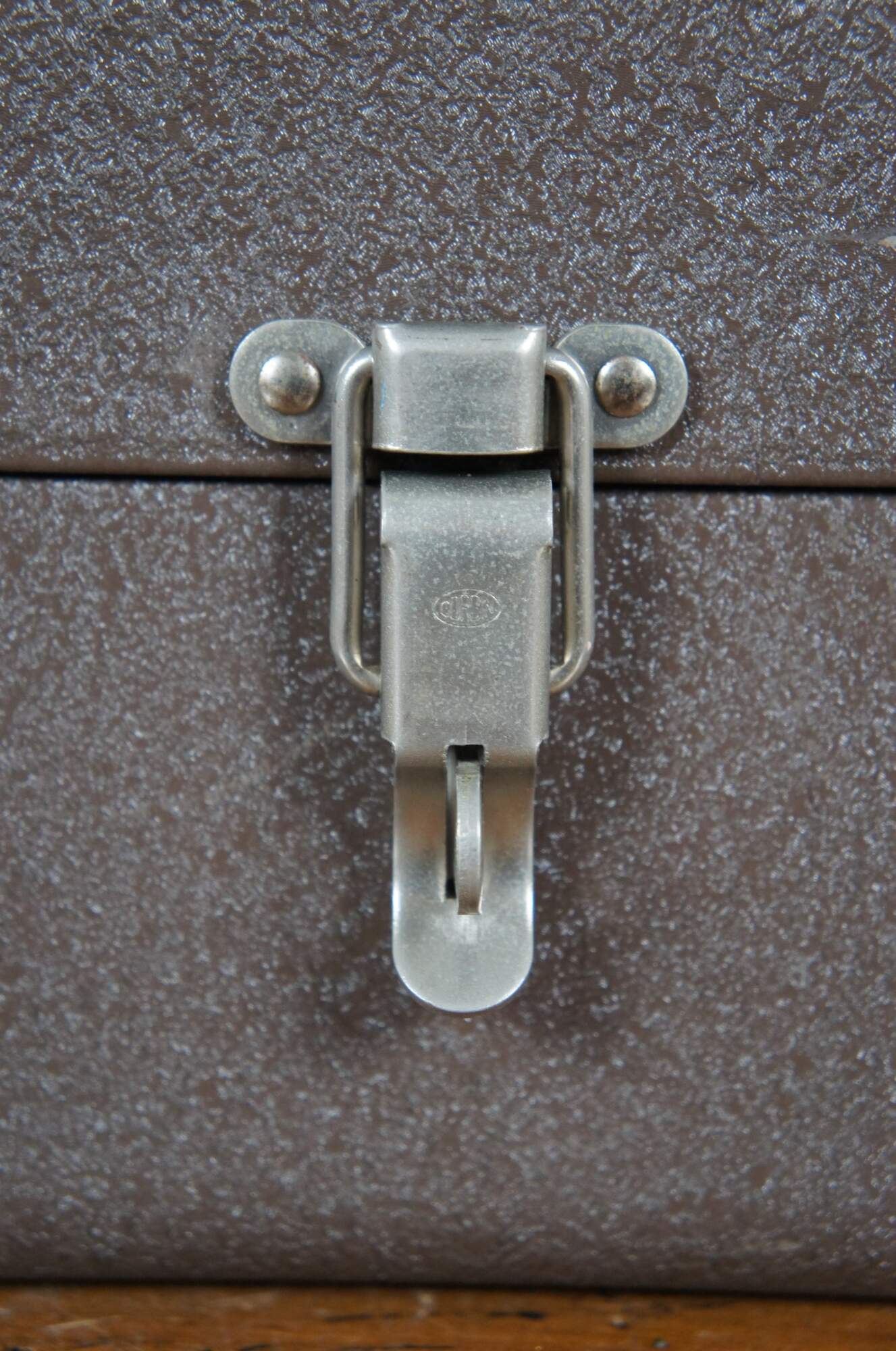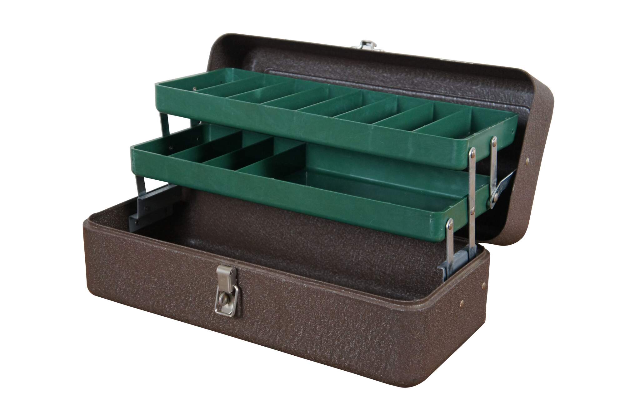 Mid 20th century Kennedy Kits fishing tackle box, style number BC-155. Brown textured metal construction with fixed plastic handle and lockable hasp / latch. Opens to two cantilevered green plastic divided trays. Made in USA by Kennedy Manufacturing Company of Van Wert, Ohio.