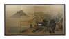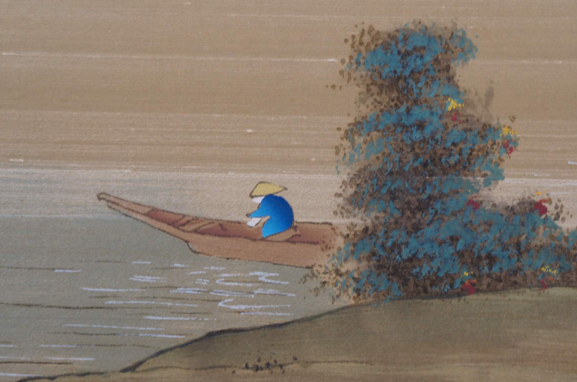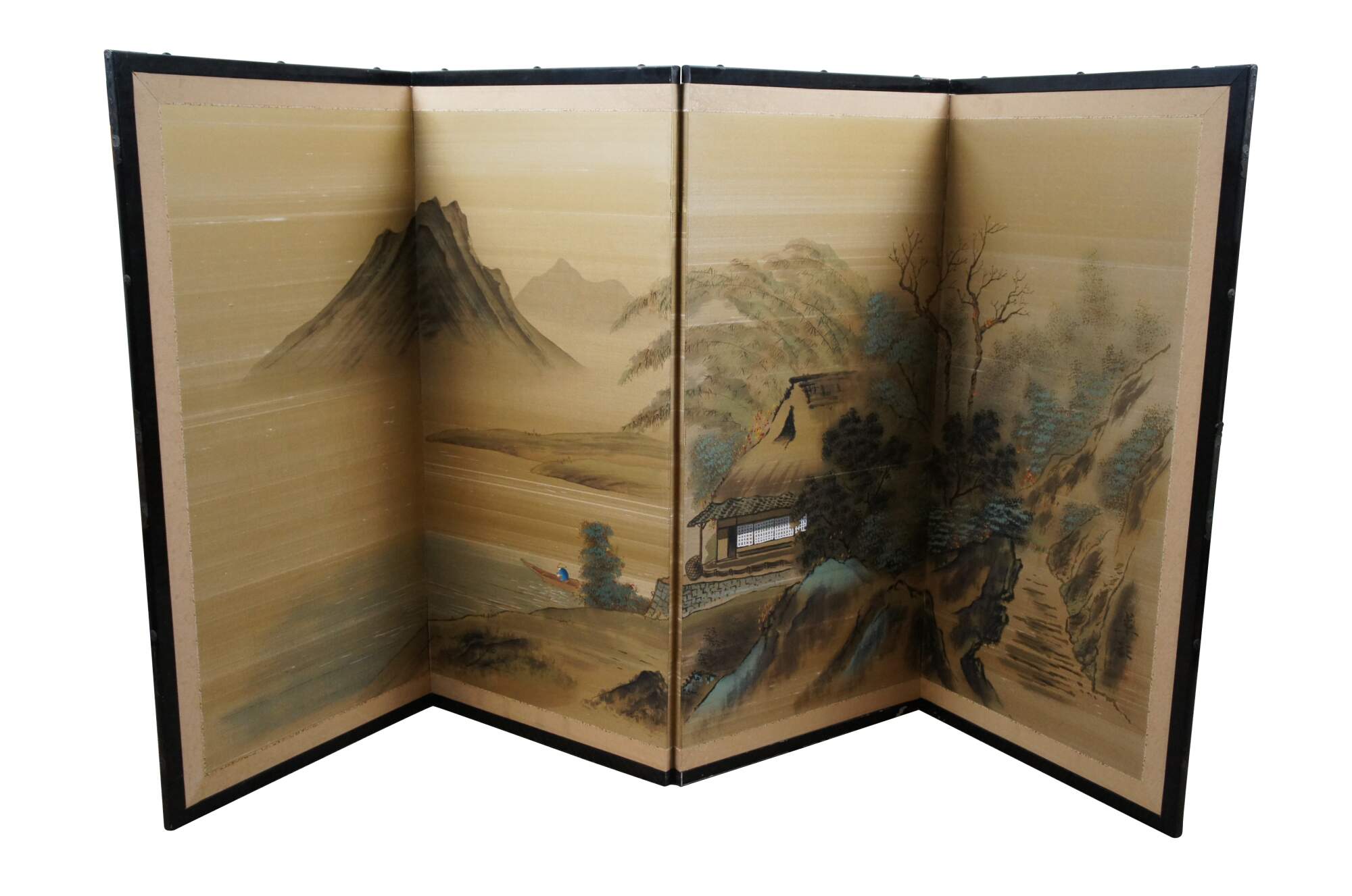 Circa mid 20th century Japanese four panel folding screeen / room divider, Hand painted watercolor on silk landscape of mountains and lake with a cottage / fishing hut and figure in a boat; signed and stamped along right side. Floral silk border; black lacquer frame; linen back.