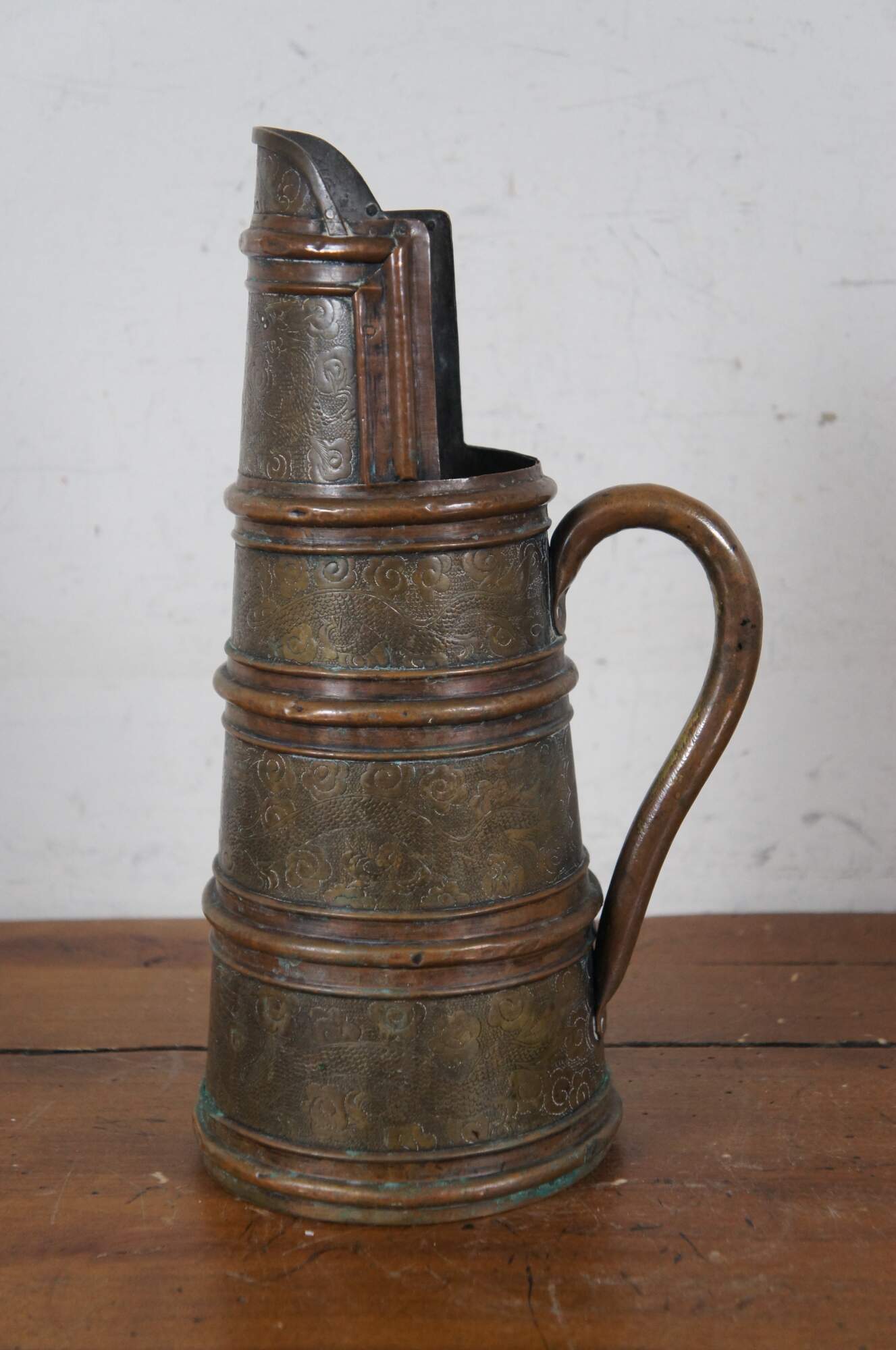 Rare early 20th century copper Mongolian dombo teapot / jug / pitcher (a traditional vessel used to serve milk tea). Round pitcher shaped vessel with tapered body with copper bands between brass panels stamped with phoenixes and dragons among swirling clouds, ear shaped fixed handle, and tall semi-circular spout decorated with a bat.