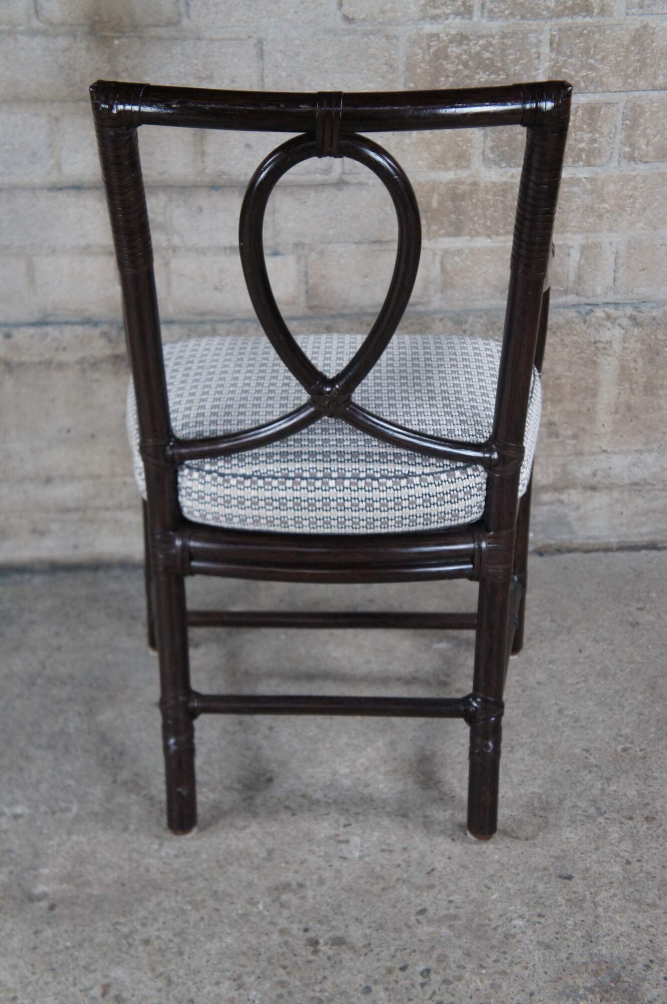 Vintage McGuire organic modern breakfast / dining / card / game arm chairs. Made of tubular bamboo and rattan construction featuring a sinuous looped back splat and sloped arms with dark finish.