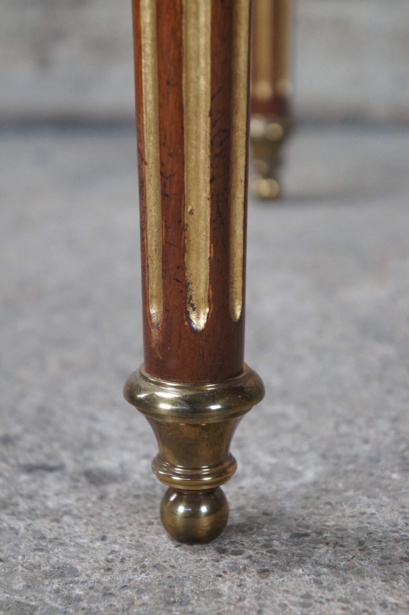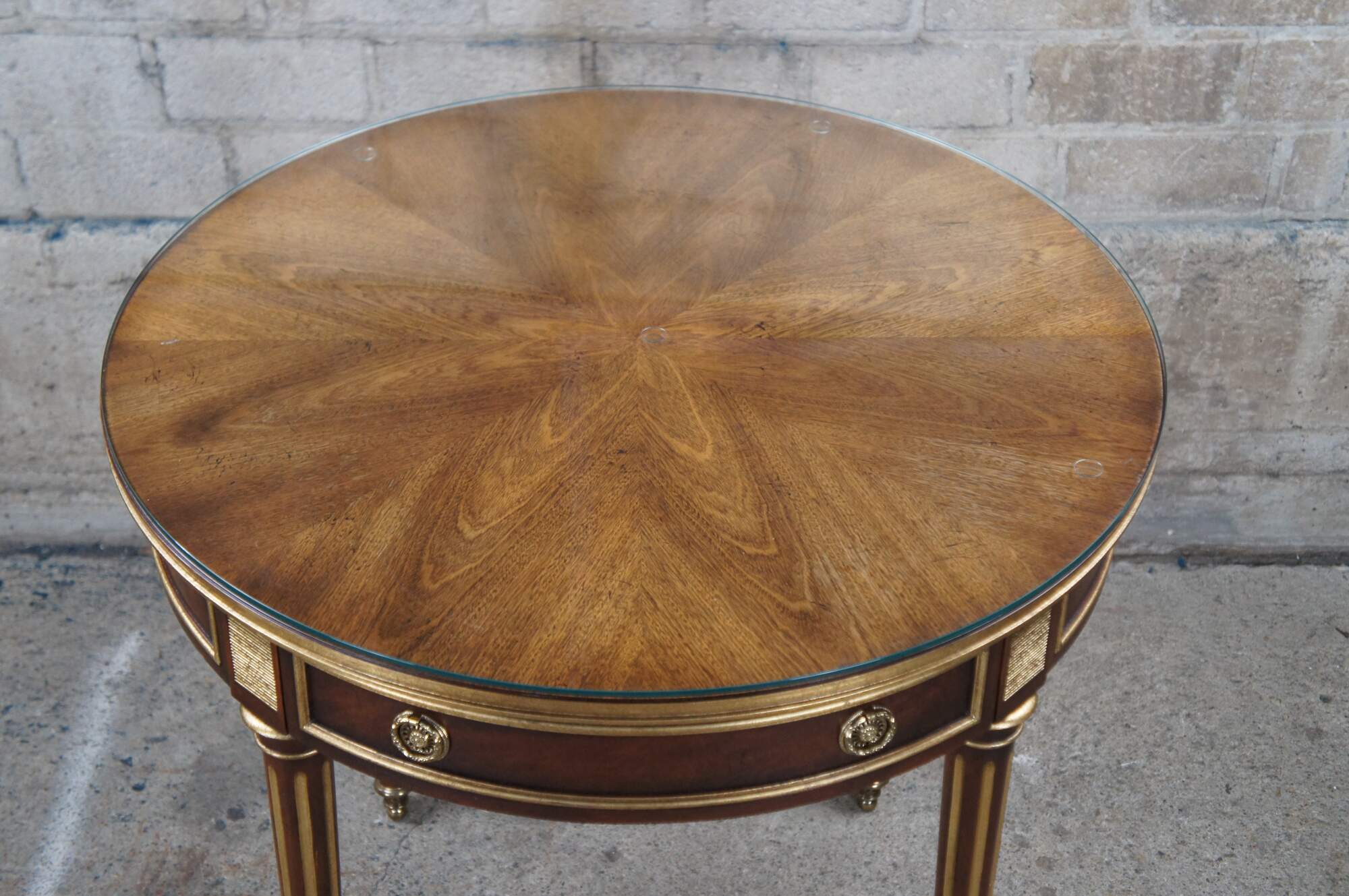 Vintage Baker Furniture English Sir Humphry Wakefield Collection French Louis XVI bouillotte style side accent table. Made of mahogany and satinwood featuring round form with sunburst bookmatch top, one drawer with brass hardware, gold gilt accents, and round tapered fluted legs with brass capped feet. Includes glass top.