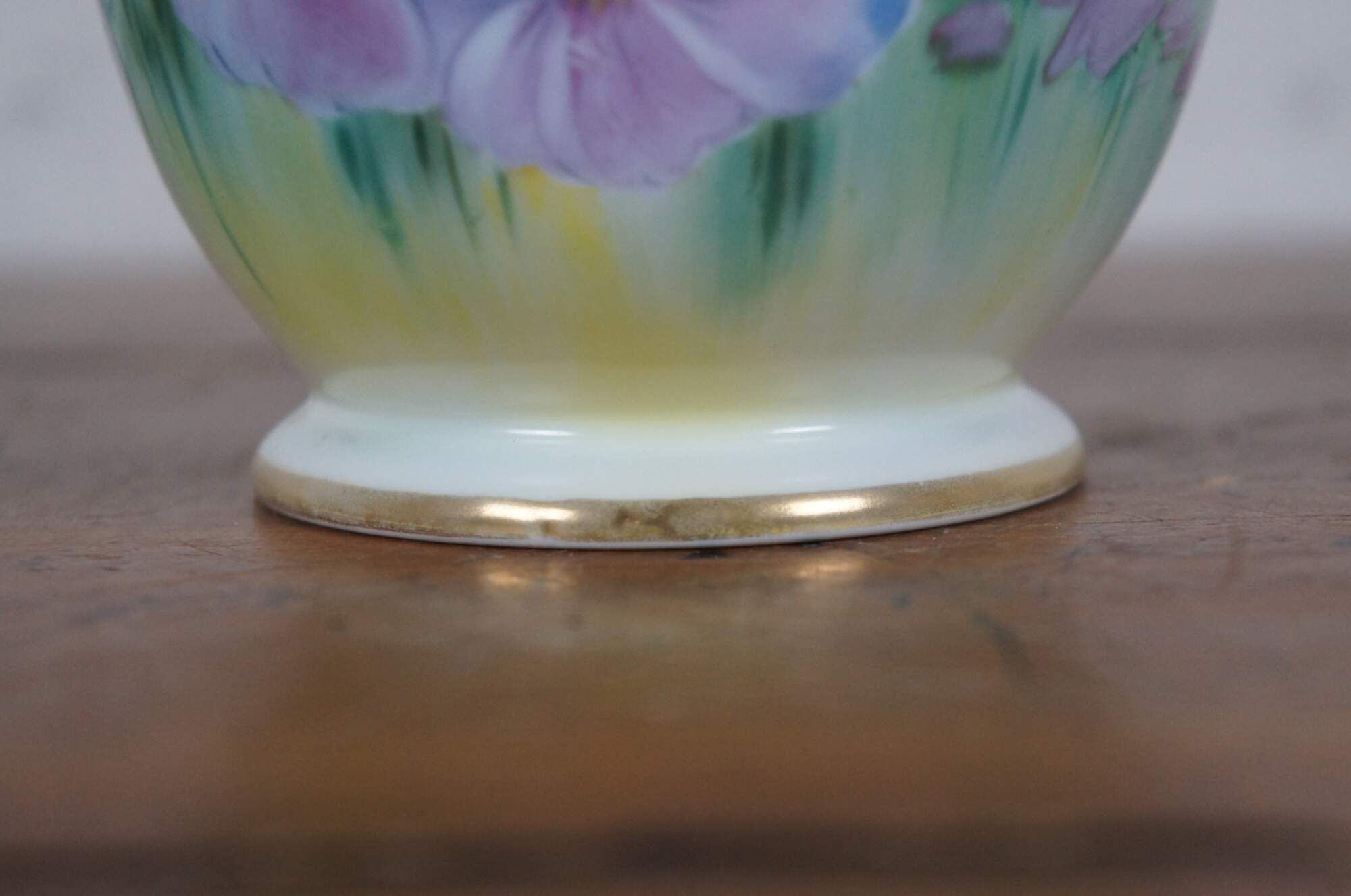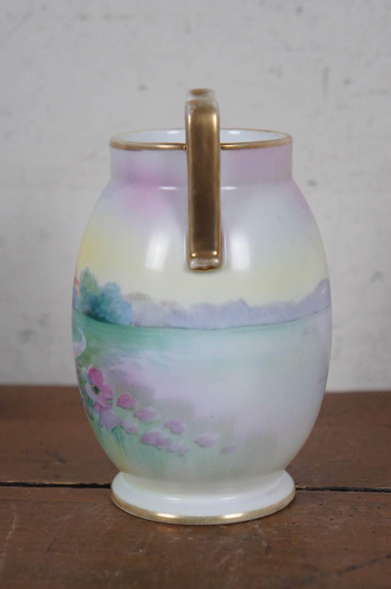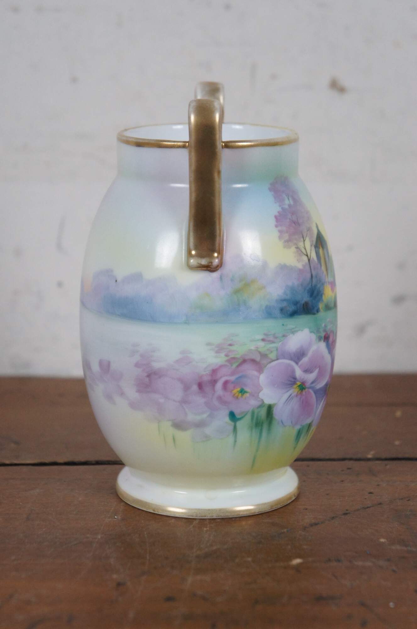 Antique early 20th century Notitake porcelain vase with gilt art deco style handles, hand painted with a pastel country landscape with a village church / barn with silo beyond a foreground of pansies. Mark used circa 1911-1921.