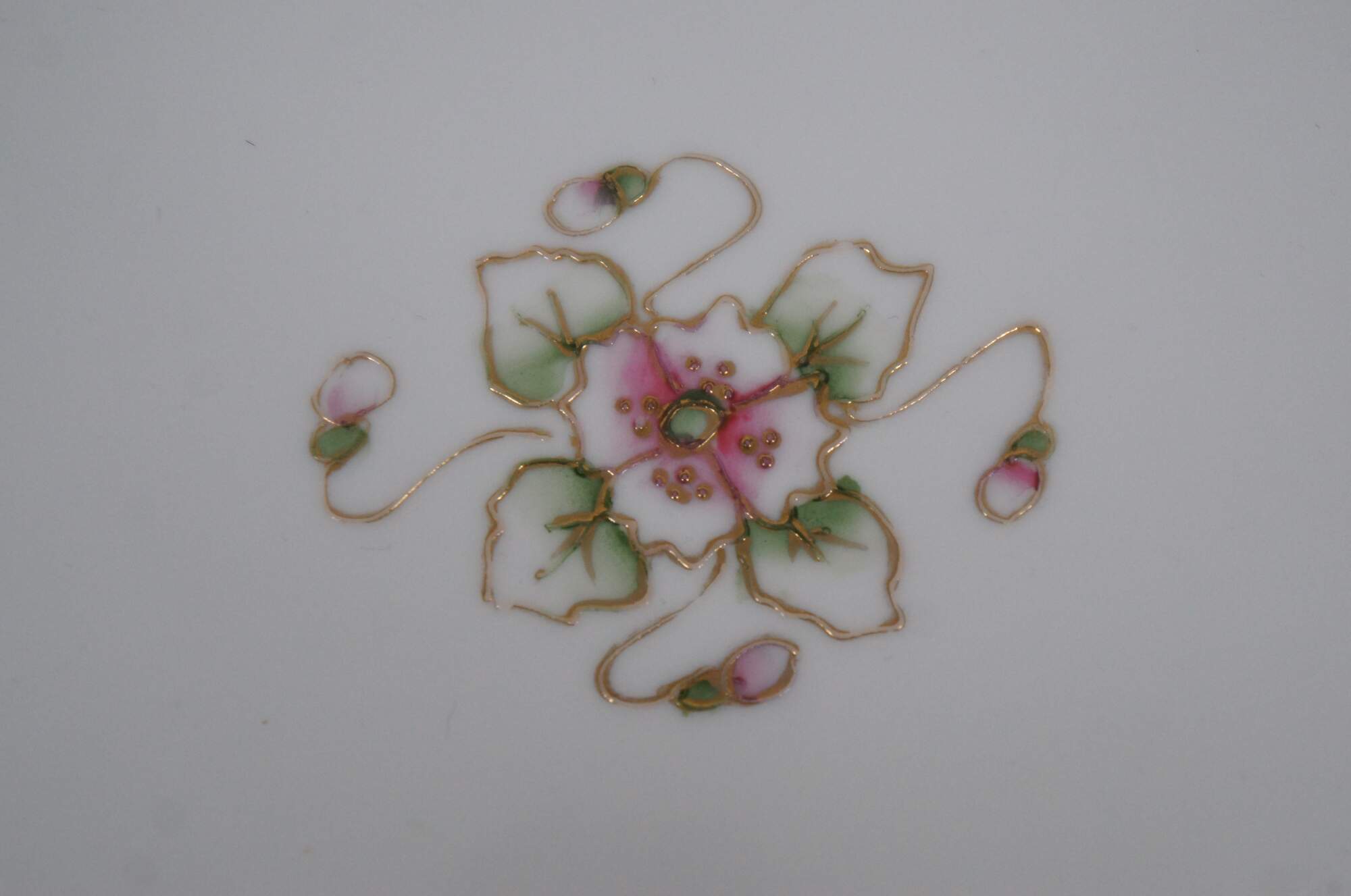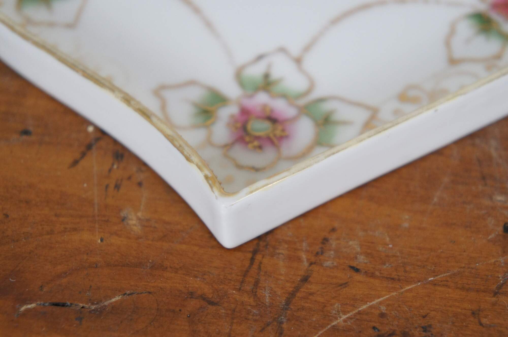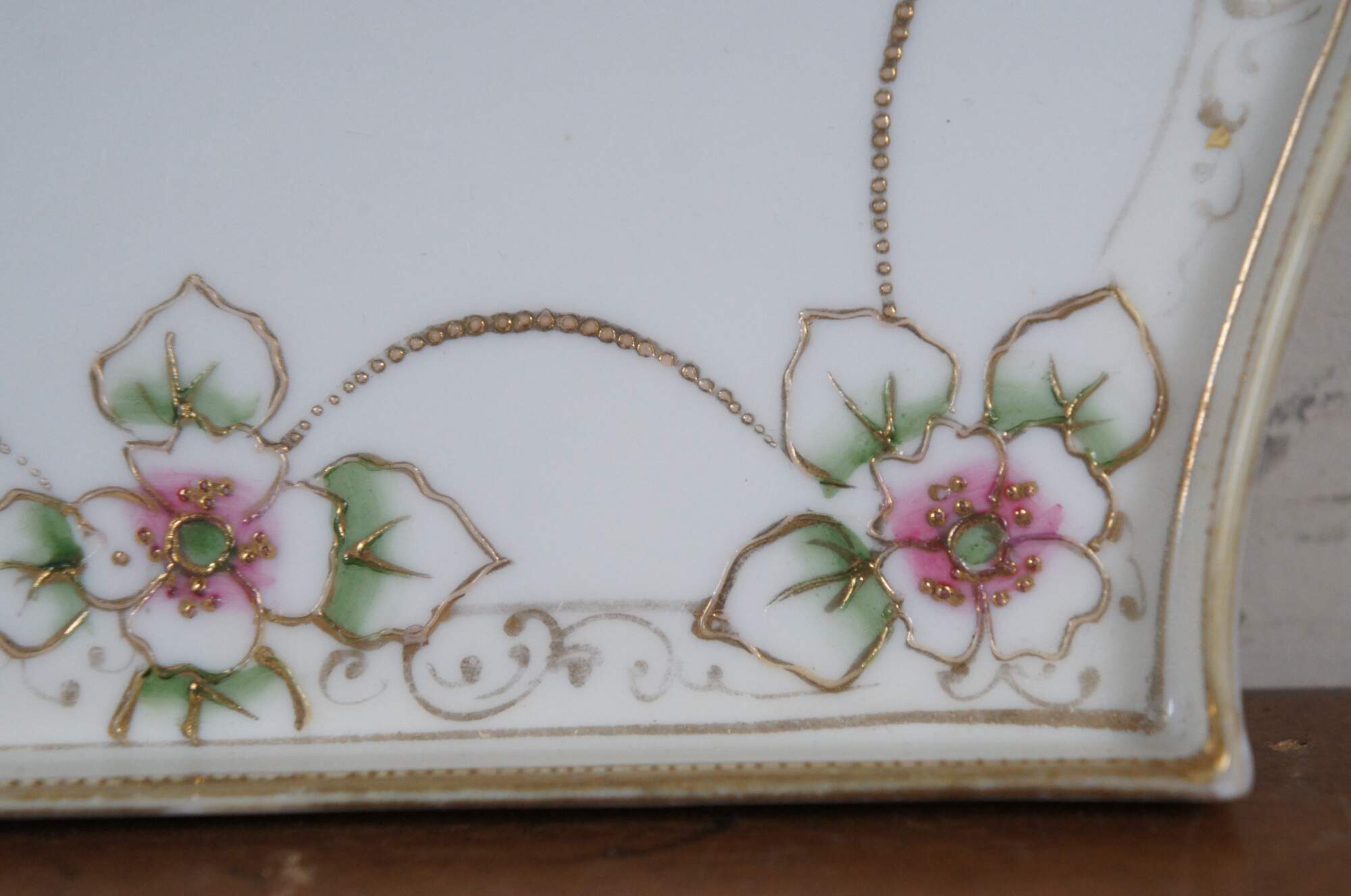 Antique early 20th century Noritake porcelain vanity tray. Rectangular shape with oxbow ends and raised edge, hand painted with pink and green roses connected with beaded gilt swags. Mark used circa 1911-1921.
