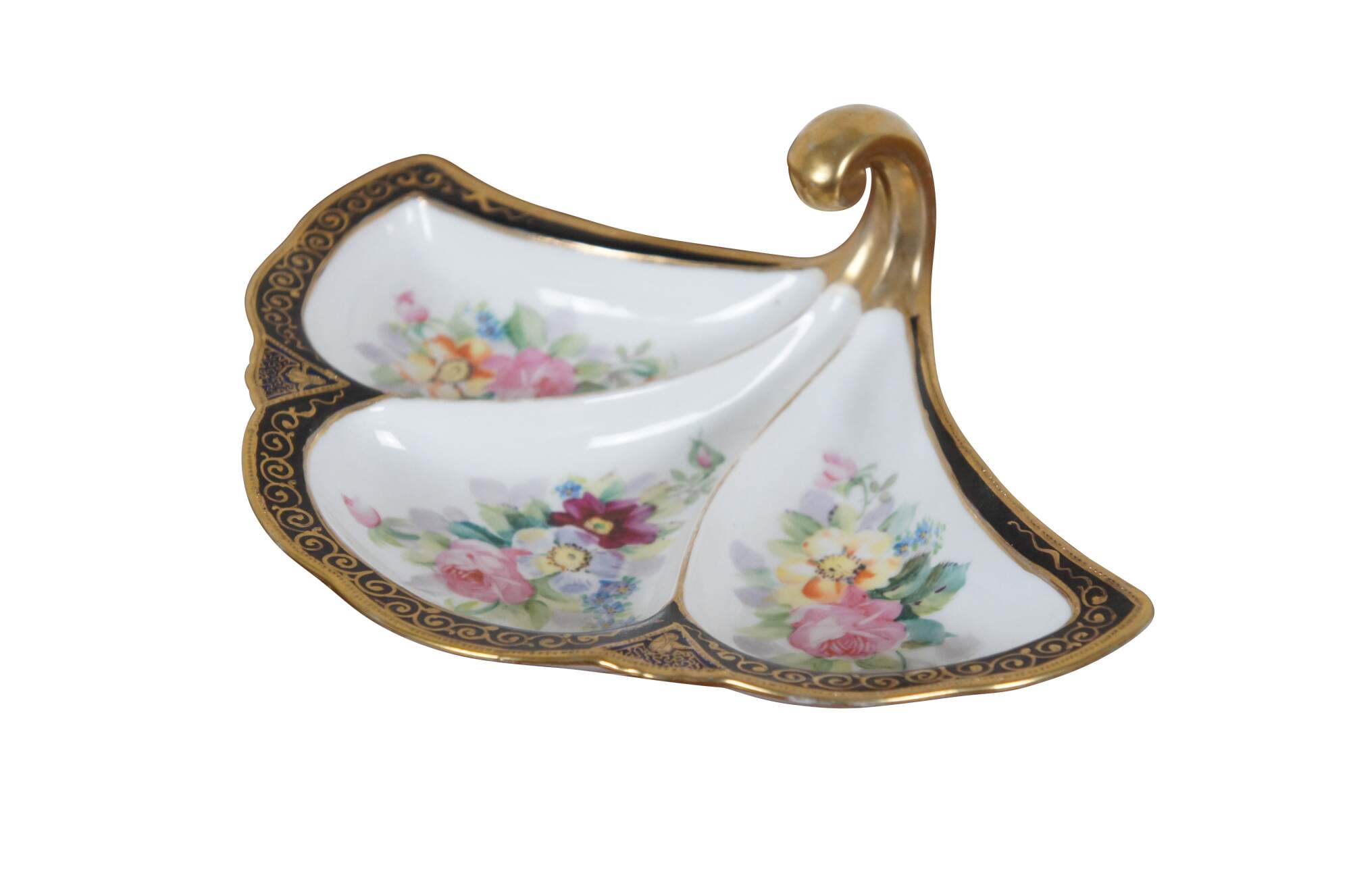 Antique early 20th century Noritake porcelain three section bon bon / trinket dish. Fan shaped bowl with curled handle, hand painted with sprays of flowers, edges painted black with gilt details. Mark used circa 1911-1921.