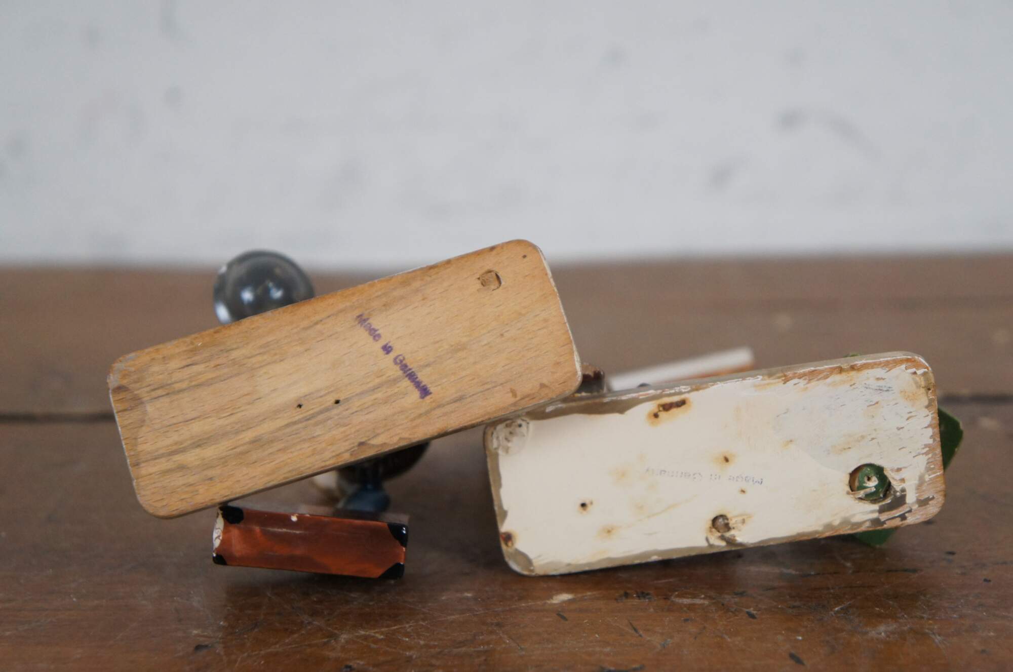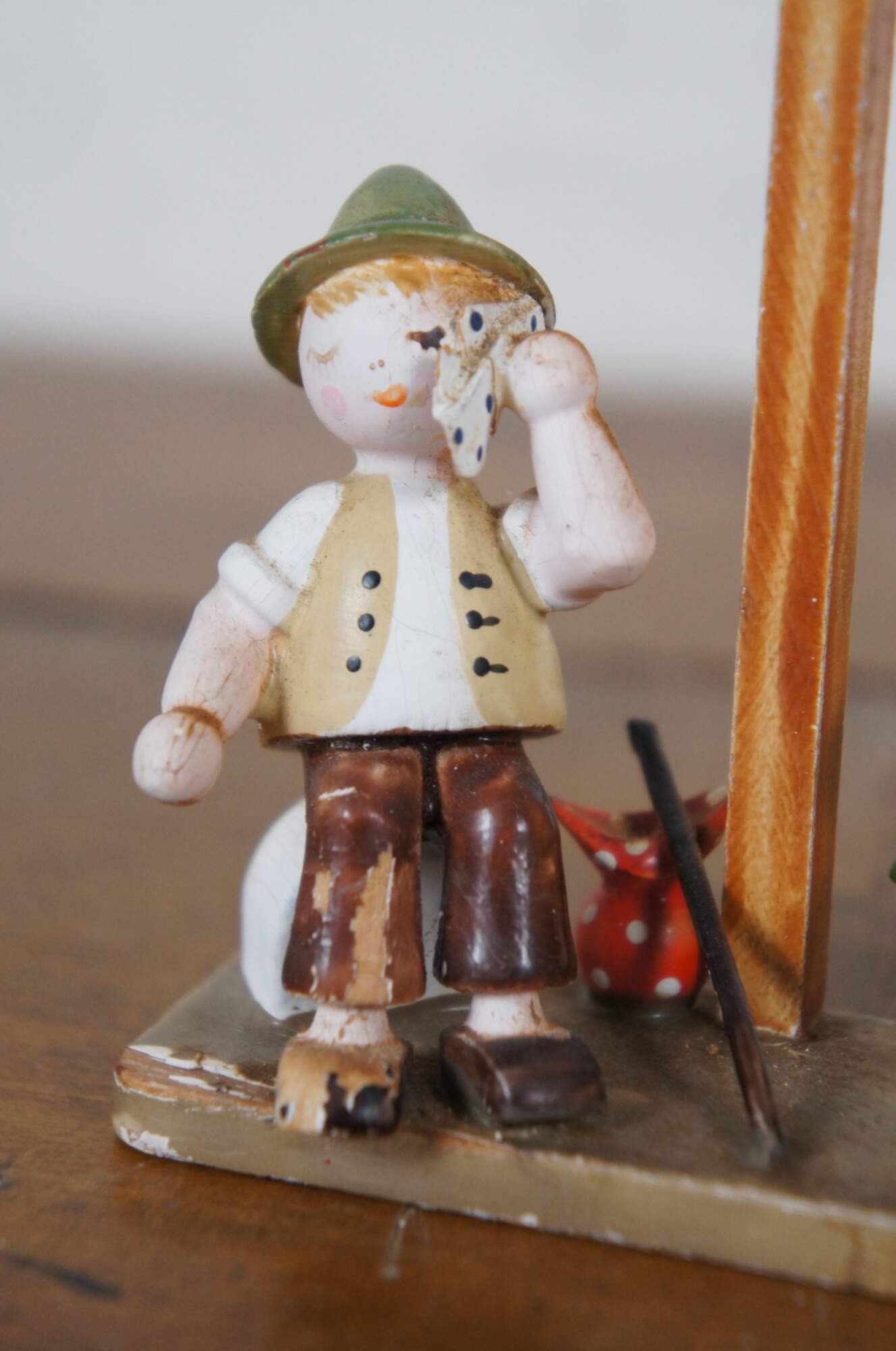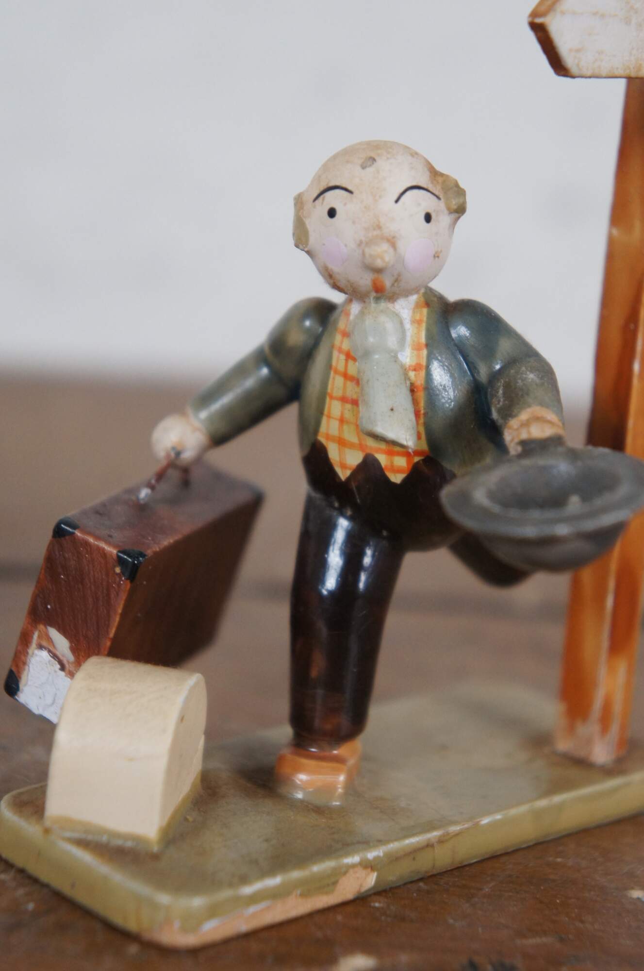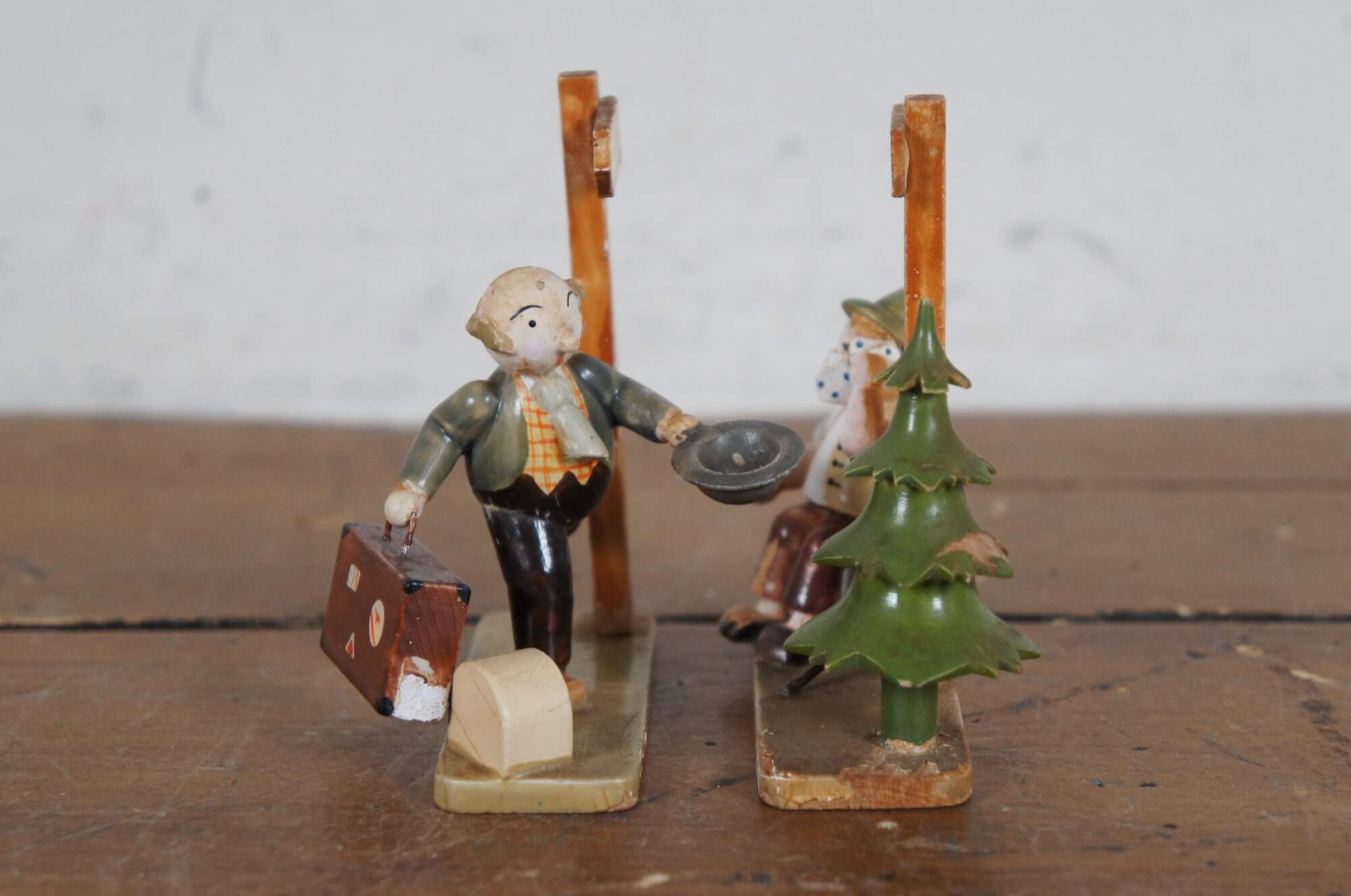 Pair of circa mid 20th century wooden German / Erzgebirge folk art figurines attributed to Hedo. One depicts a balding man with suitcase and hat, running past a signpost. The other shows a young hitch hiker in Bavarain / Tyrolean hat, wiping the sweat from his face as he rests beside a sign post and pine tree.