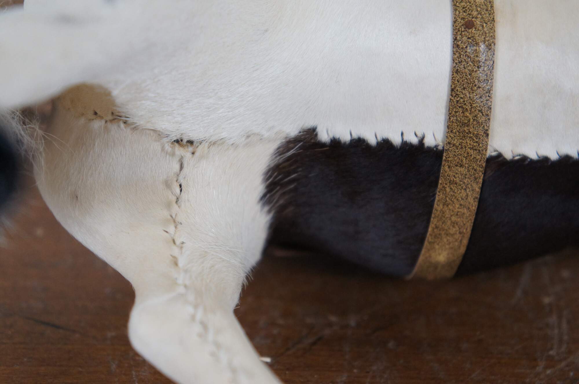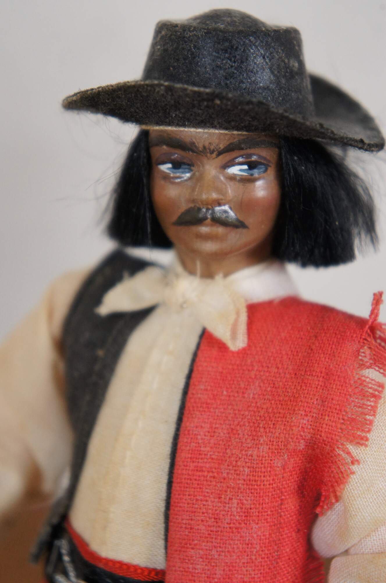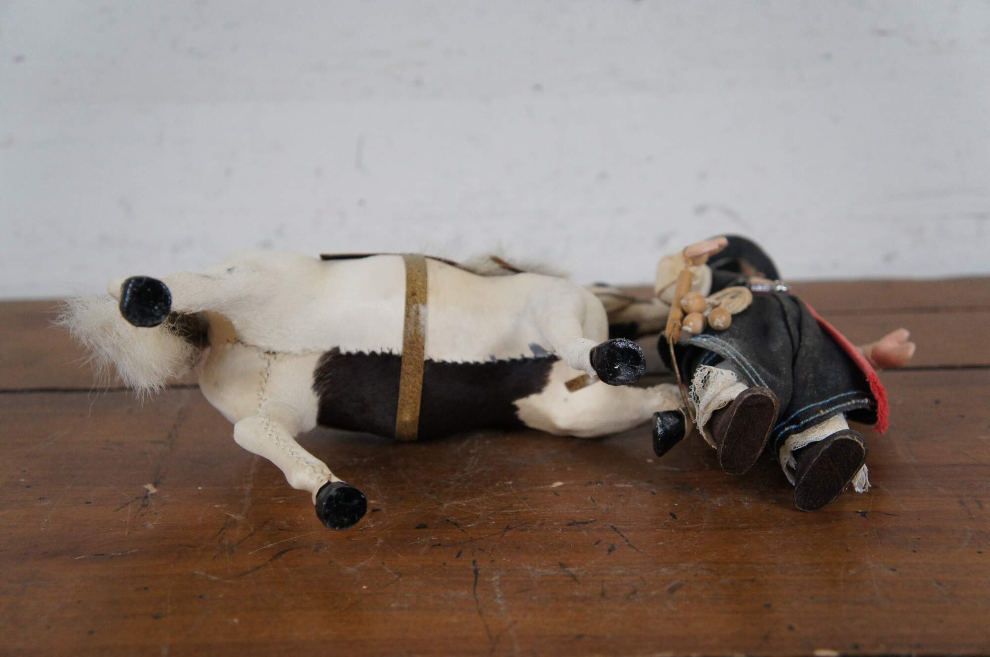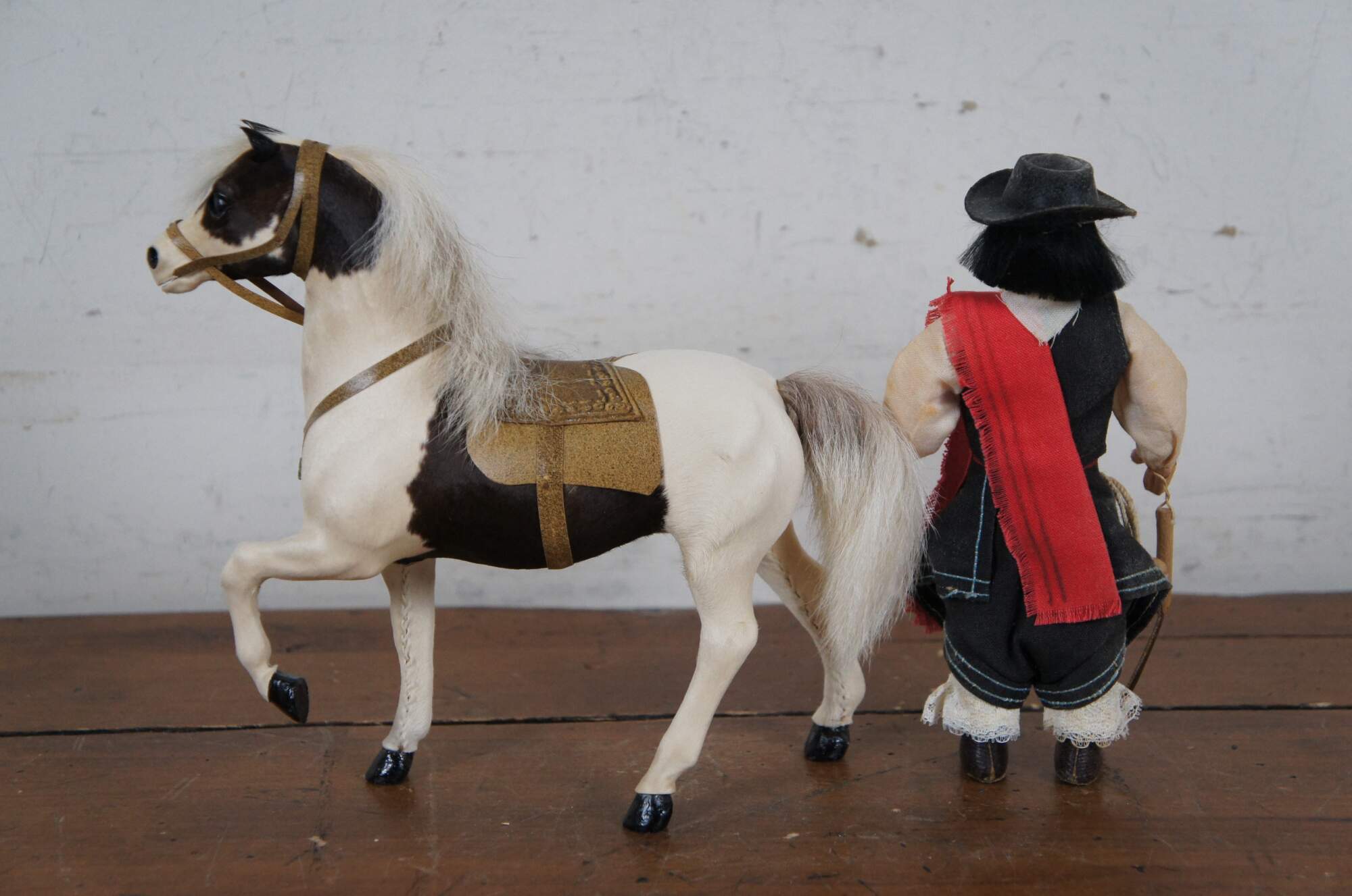 Circa mid 20th century Argentinian folk art guacho doll - wire framed cloth body with hand painted face, traditional clothing, rope and riding crop - and natural leather wrapped brown and white horse with hair mane and tail and stamped leather saddle.