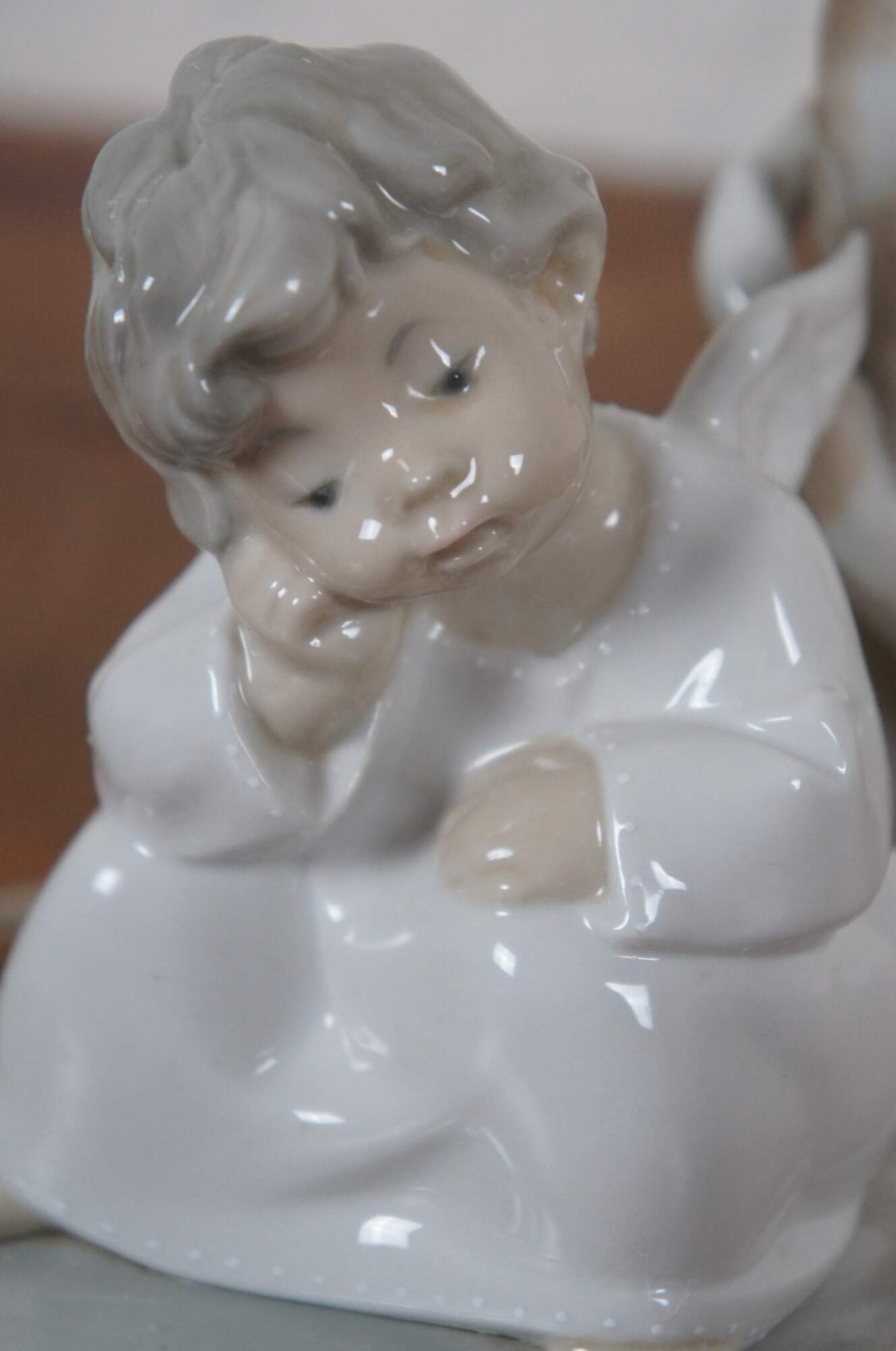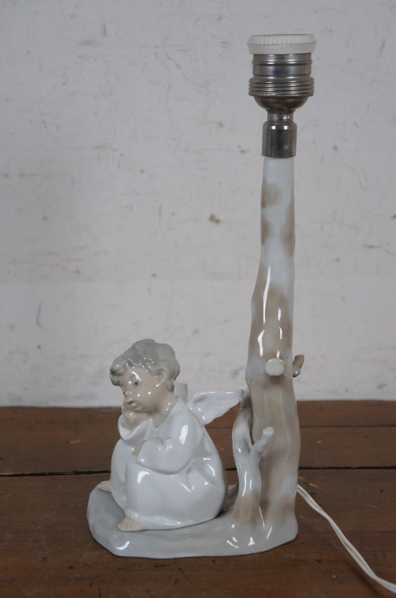 Circa 1970's Lladro porcelain table lamp designed by Fulgencio Garcia titled "Angel Pensando Lampera" or Angel Thinking Lamp, depicting a young angel in thought, seated at the foot of a bare tree trunk. First issued 1969; retired 1976. 4539. 4546.