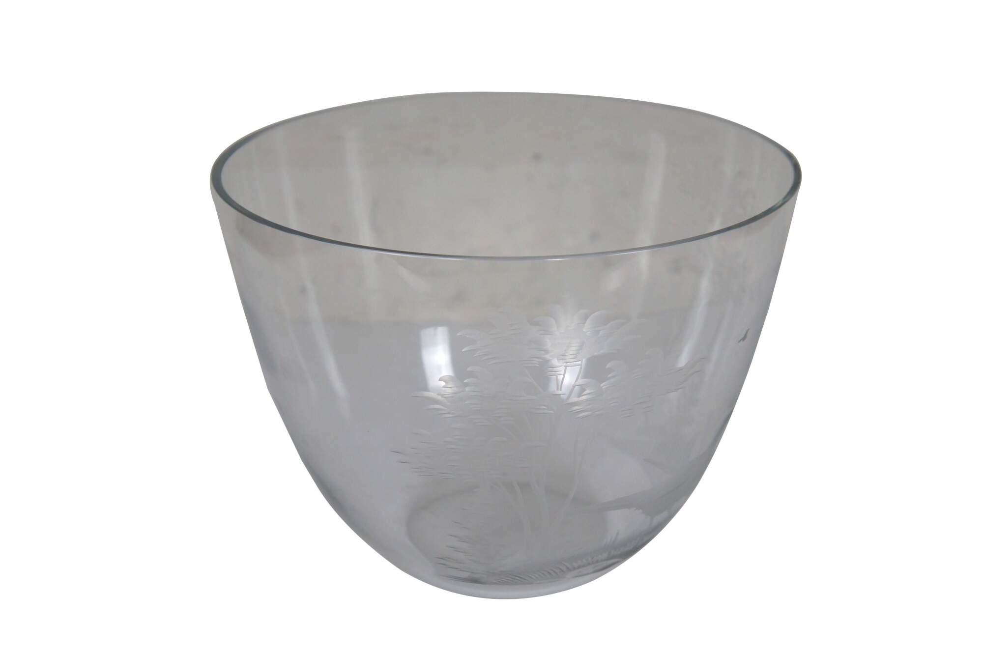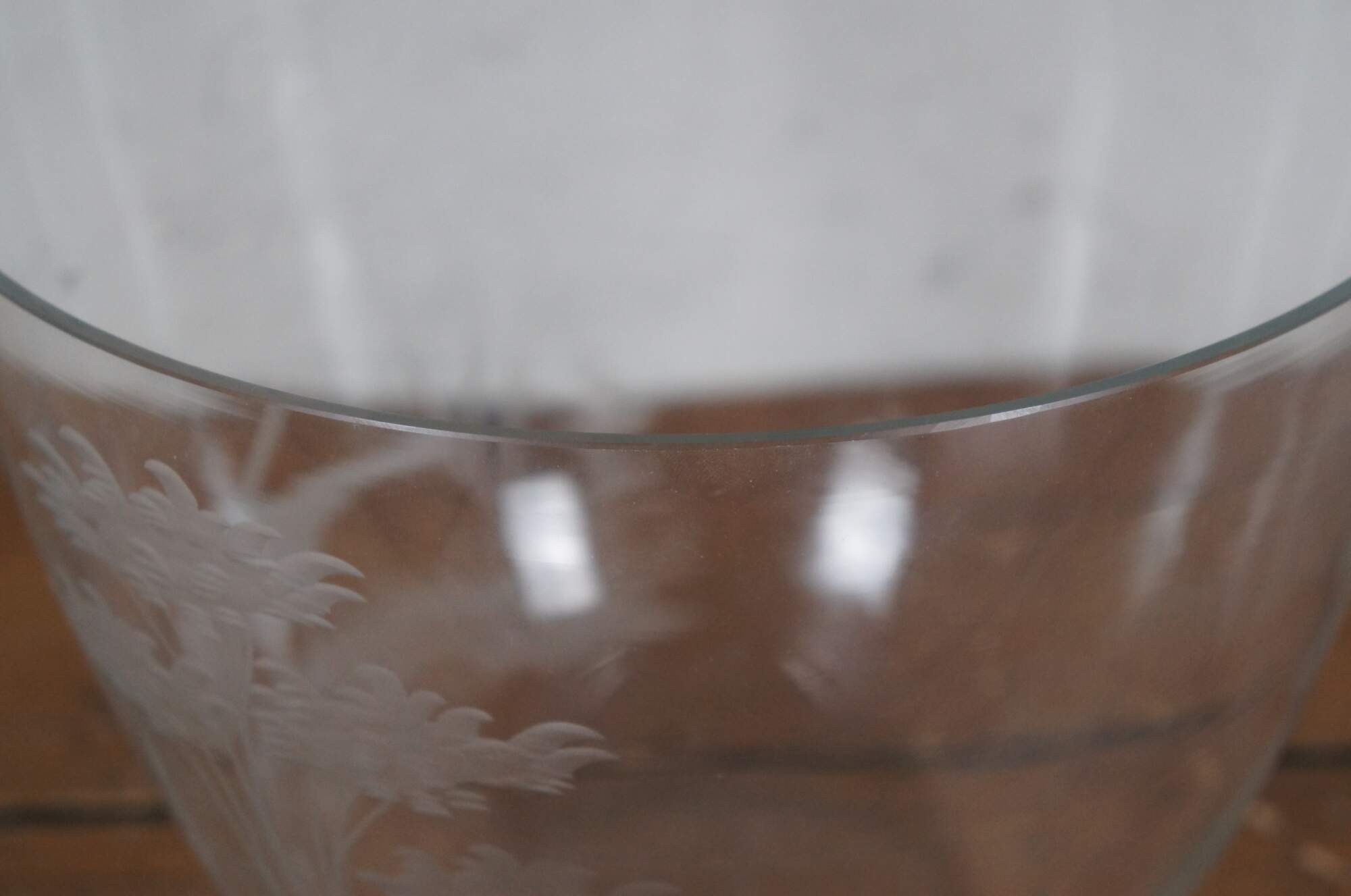 Vintage German Queen Lace clear crystal centerpiece / serving bowl etched with a hunt scene / landscape of trees and two pheasants.