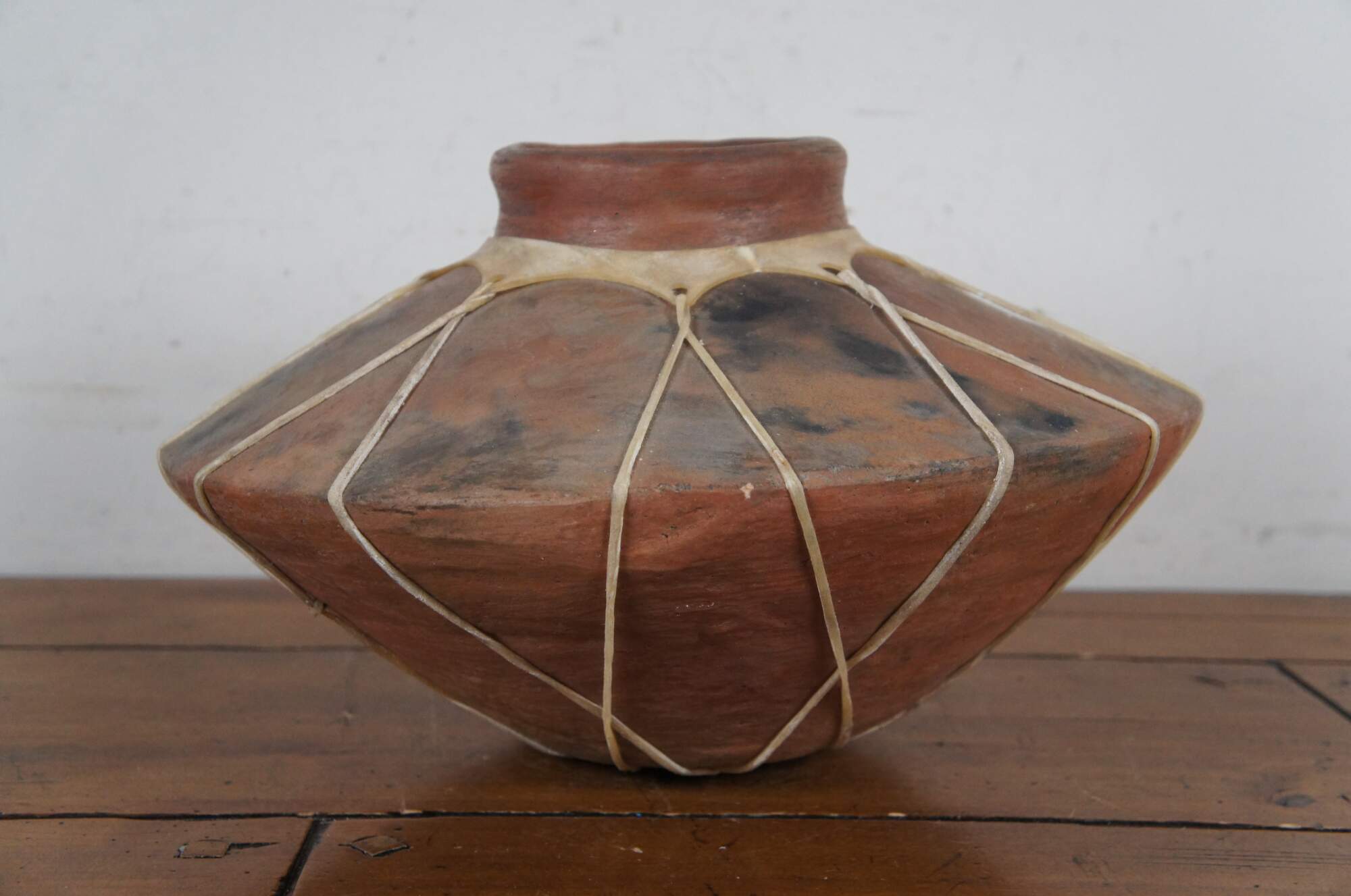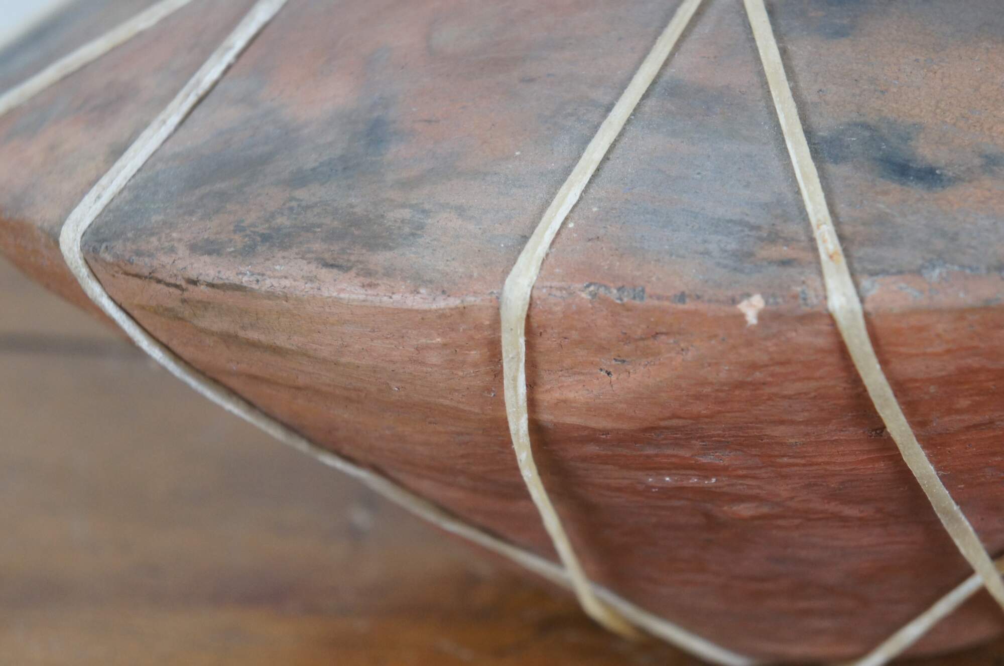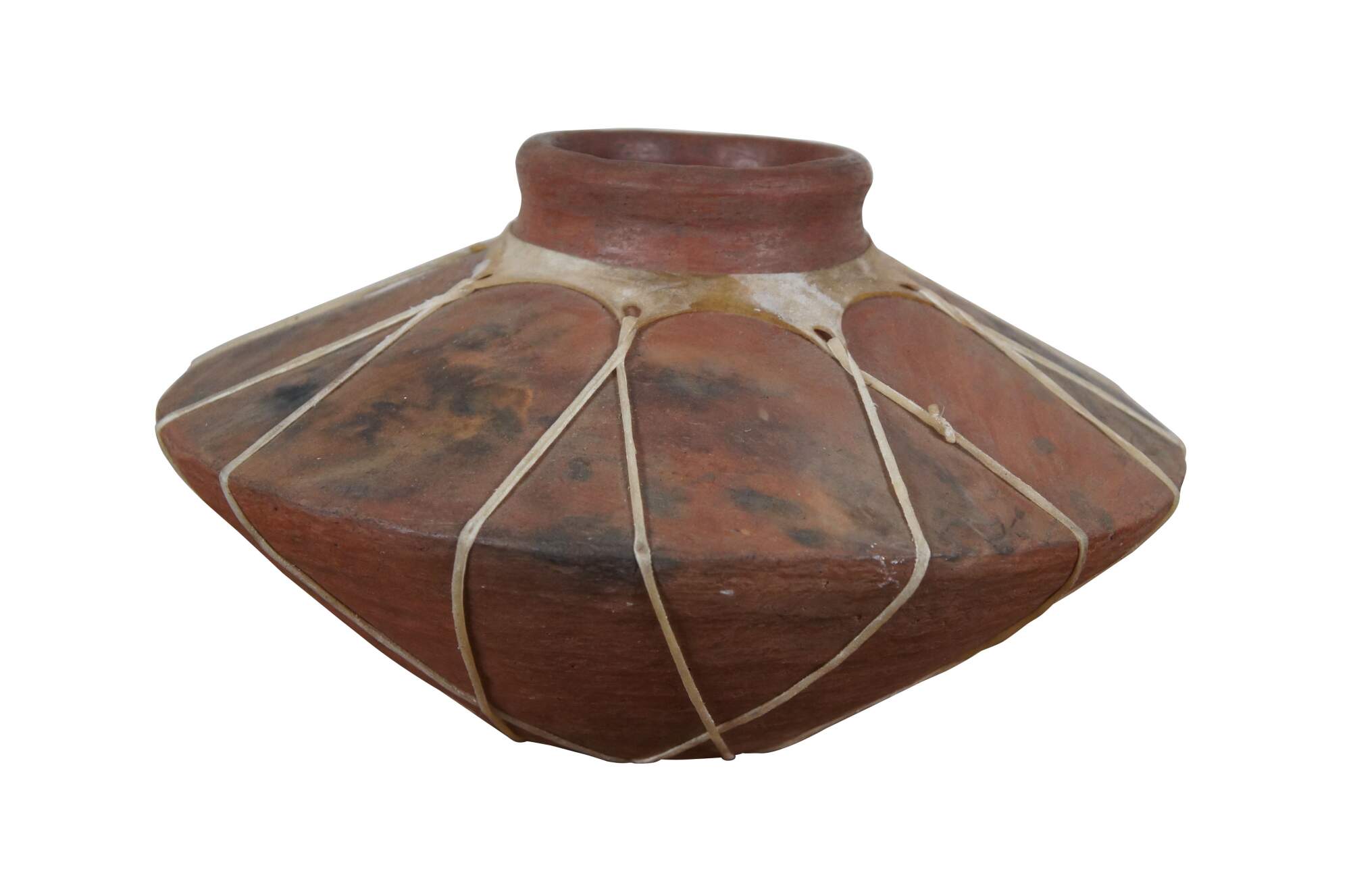 Vintage 20th century Native Tarahumara Mexican / Southwestern olla / water pot. Made of red clay / terracotta by the indigenous tribal Indians, it features a round, saucer-like form with tapering triangular base and top, bound with stretched pieces of leather / sinew.