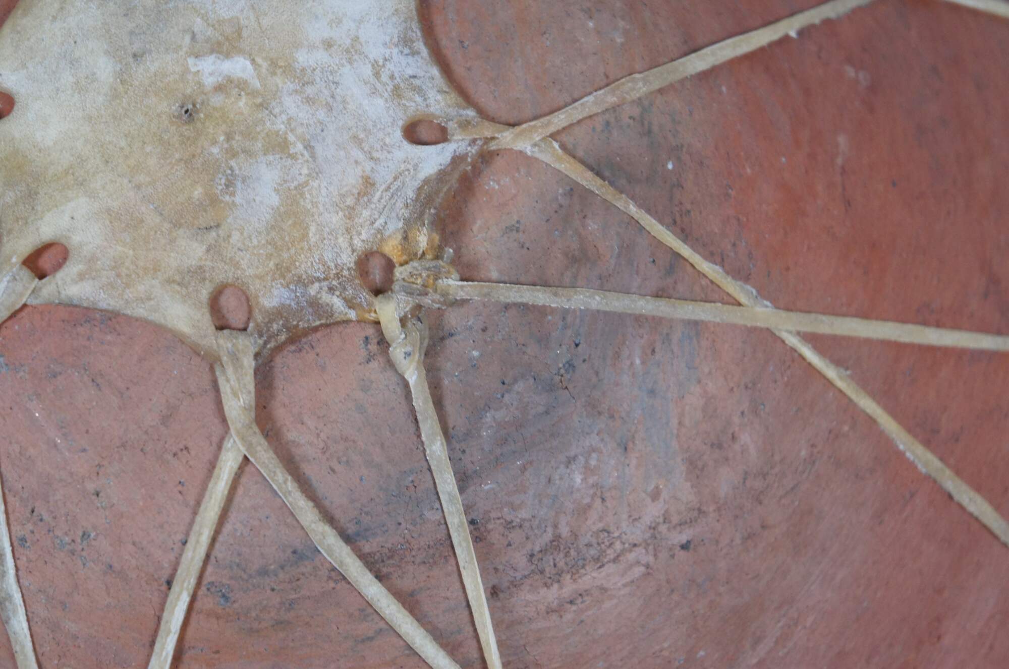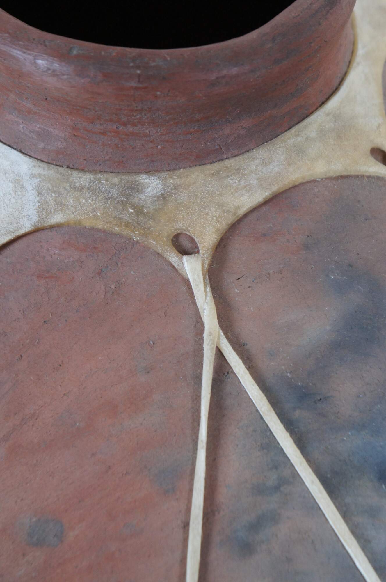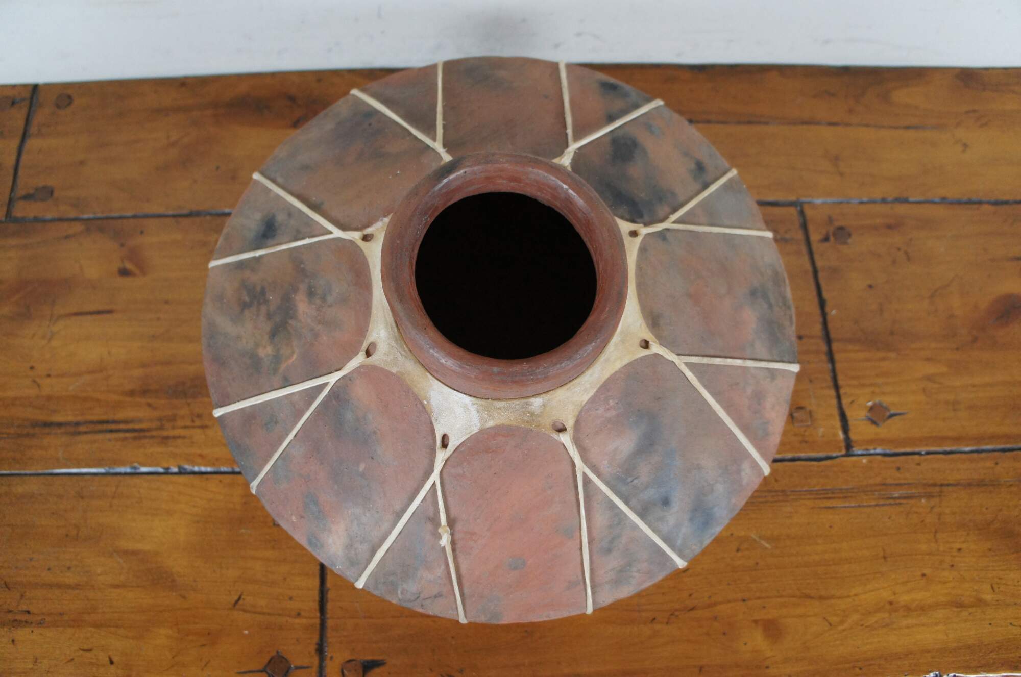 Vintage 20th century Native Tarahumara Mexican / Southwestern olla / water pot. Made of red clay / terracotta by the indigenous tribal Indians, it features a round, saucer-like form with tapering triangular base and top, bound with stretched pieces of leather / sinew.
