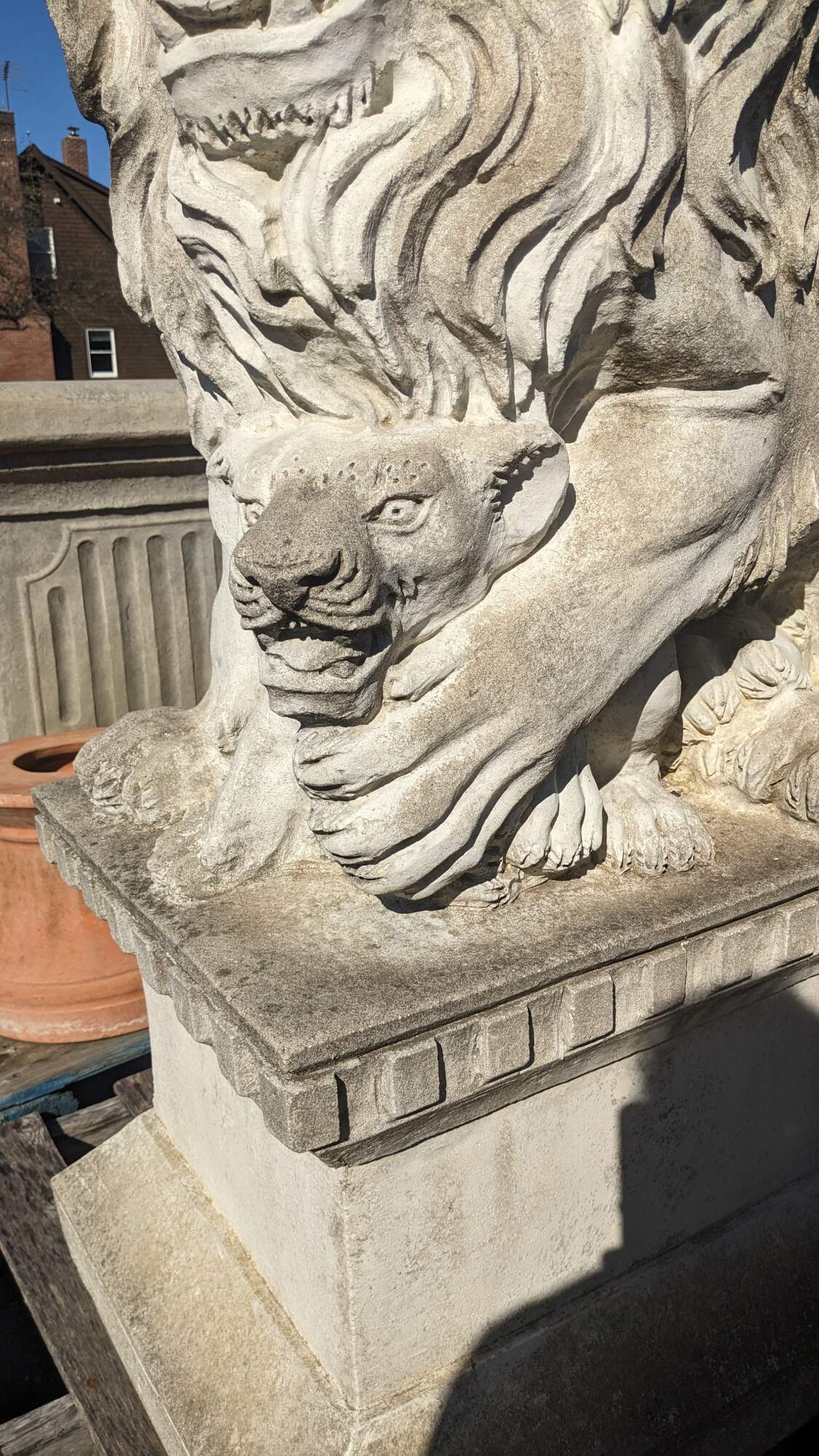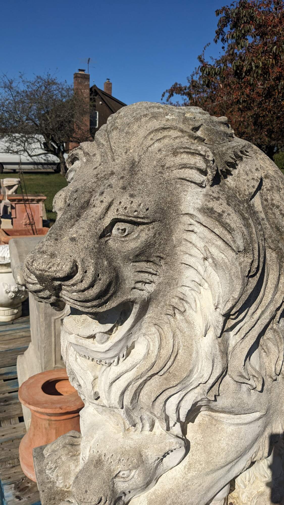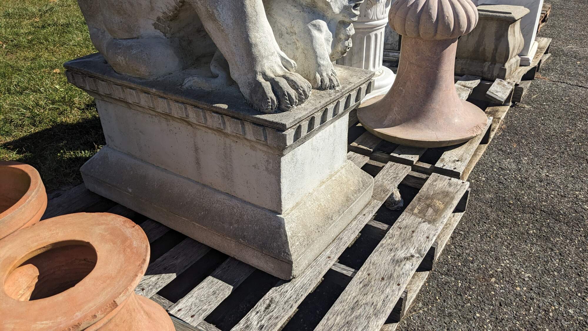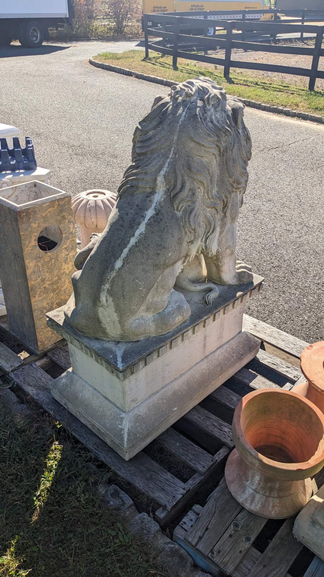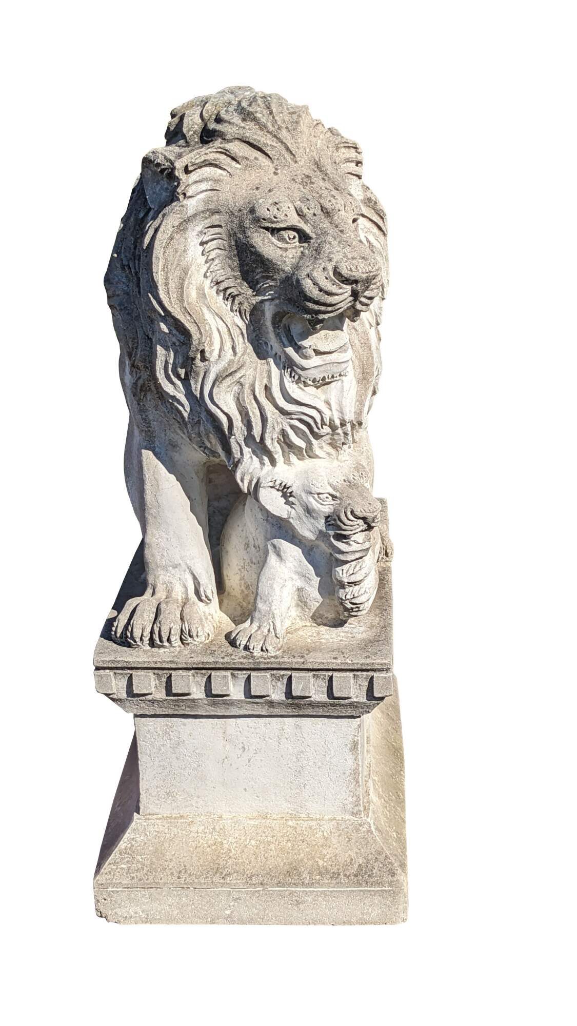 A large stone lion and cub statue over Grecian plinth base. The lion and cub are facing slightly right with open mouths. A nice detailed example for your garden or entry. Will require a Pallet jack to be moved