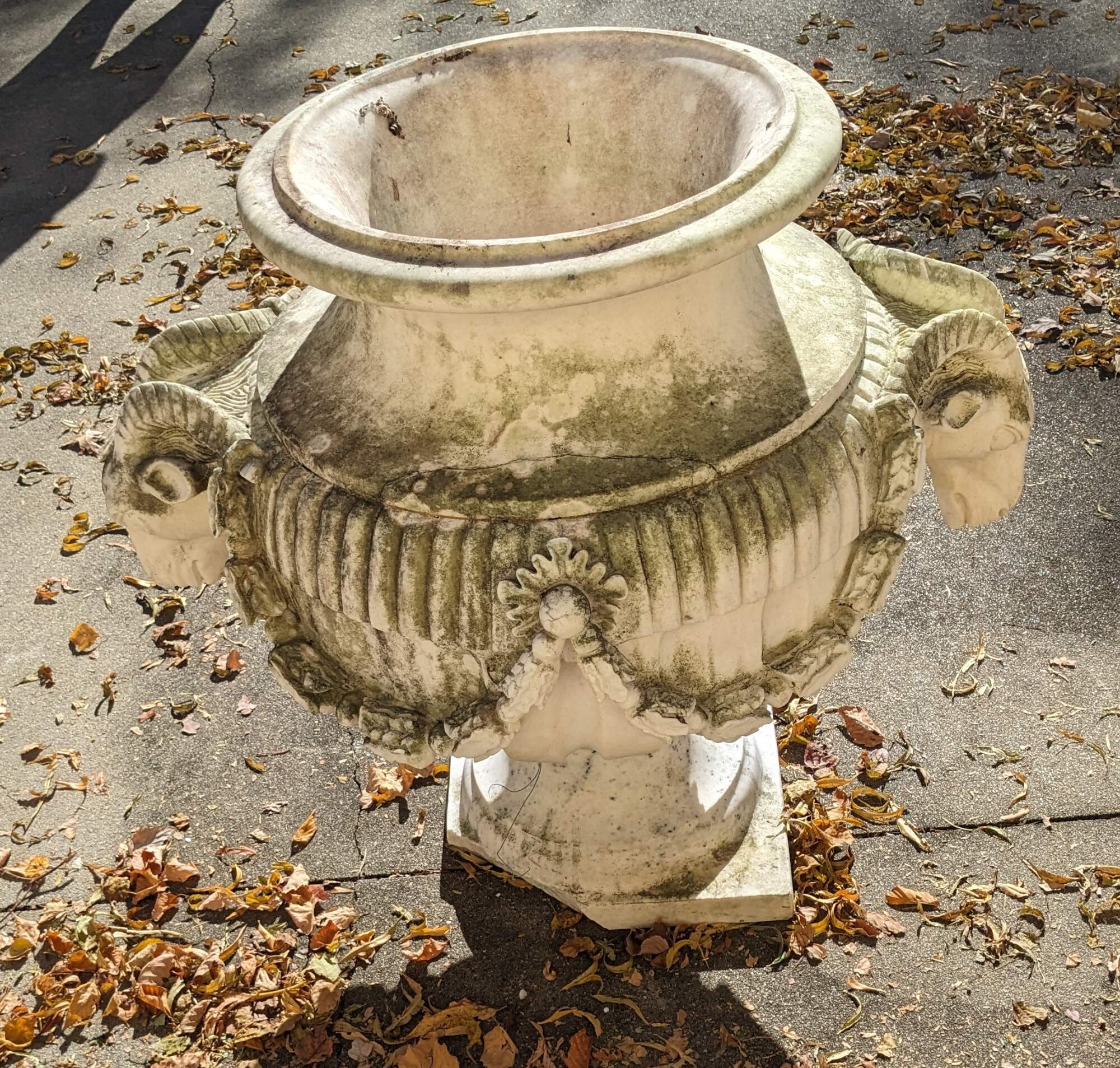 Stately pair or Figural Italian made Grecian style urn over stands. Each is beautifully crafted from marble with Ram / Goat heads at each side. Features a foliate drapery motif connecting each ram head and fluted / reeded exteriors.