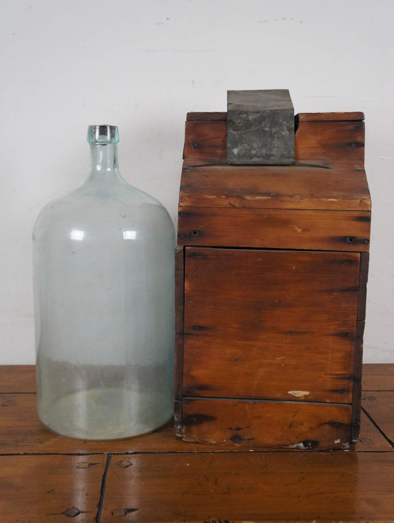 Late 19th century antique demijohn - an overzied wine bottle in pale blue glass with cork stopper - and hardwood tantalus style wine box / storage crate with lockable metal flap on top. Stamped on front G.W. Banker of New York. Circa 1880s.