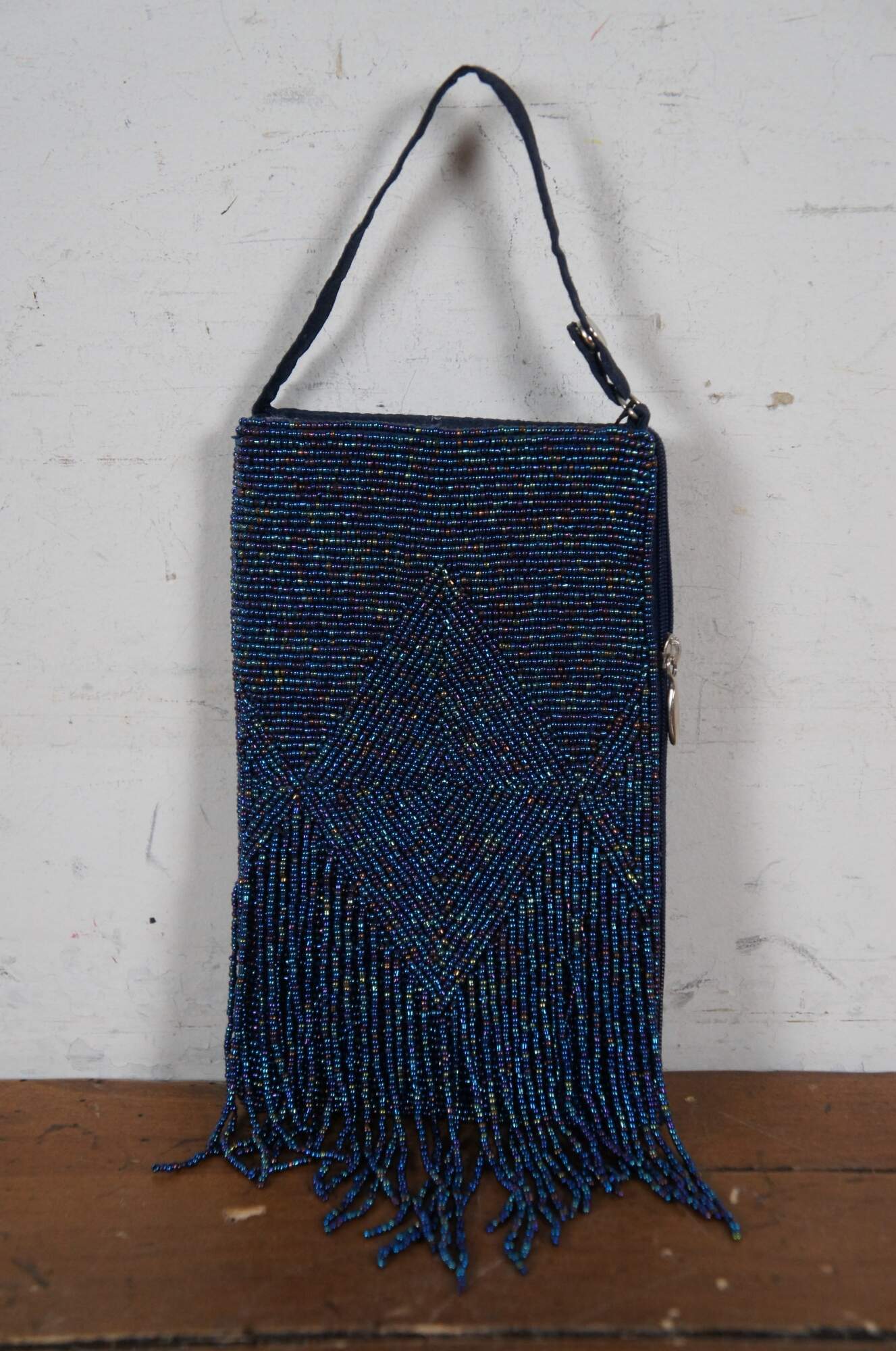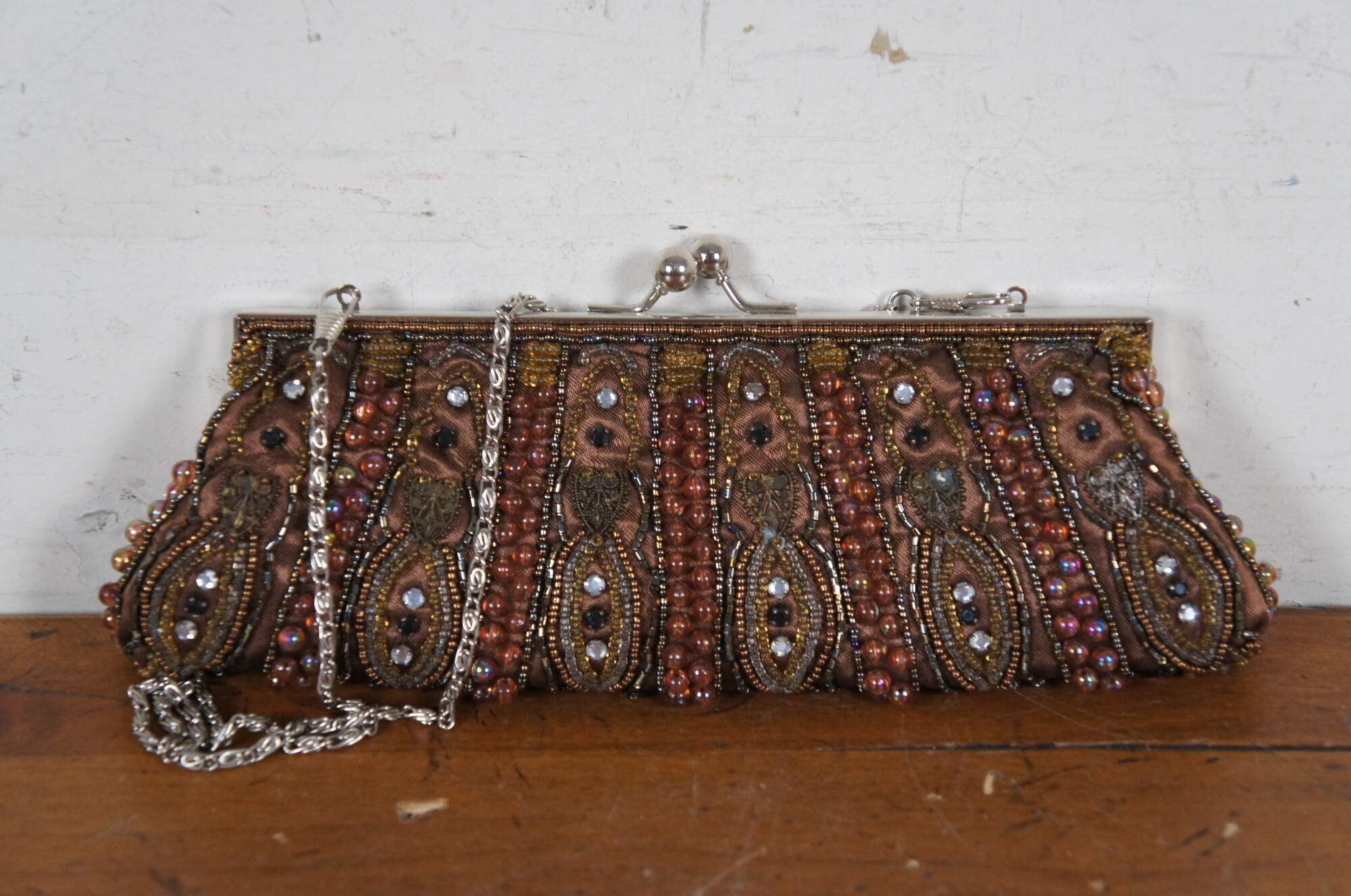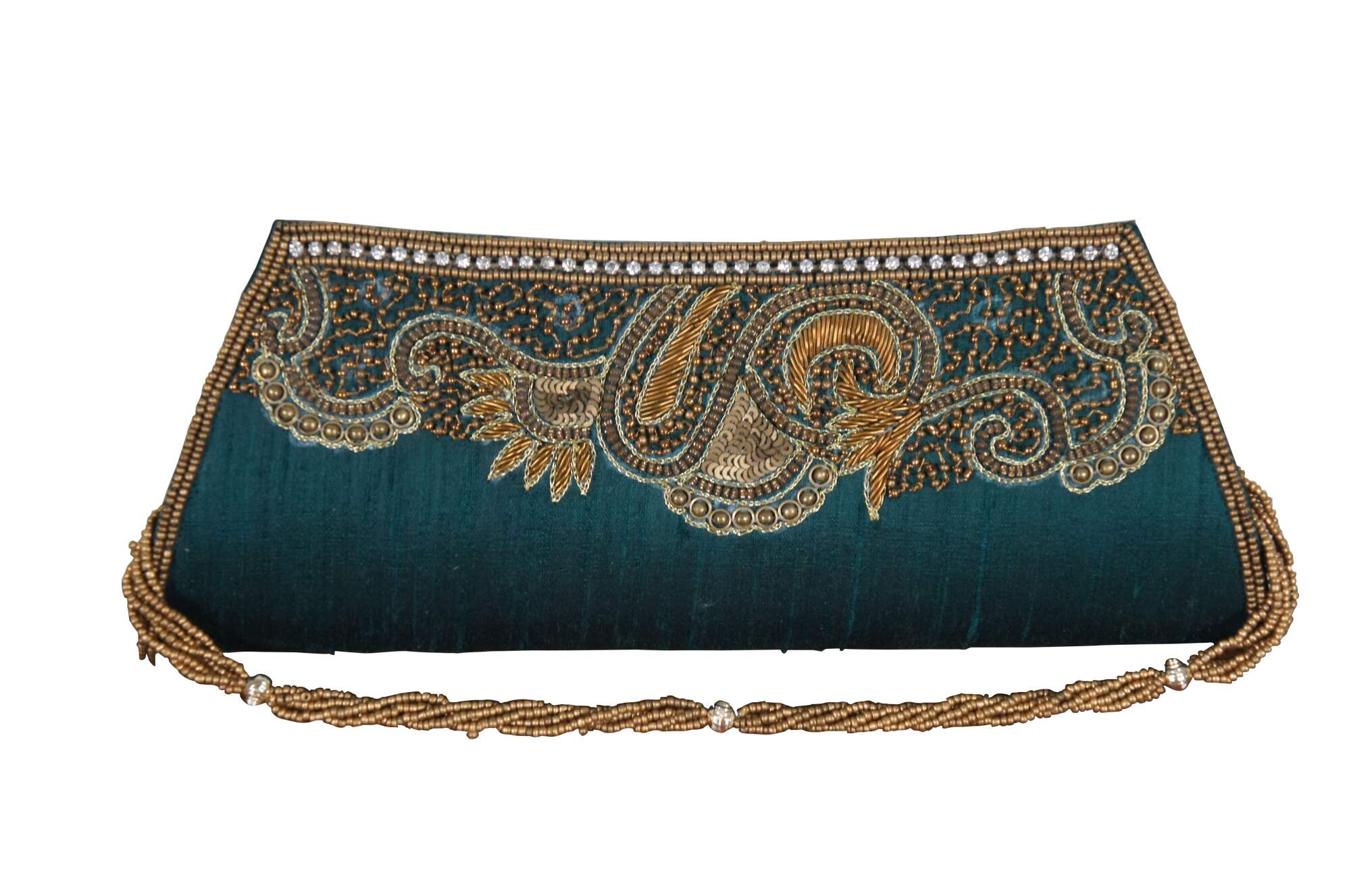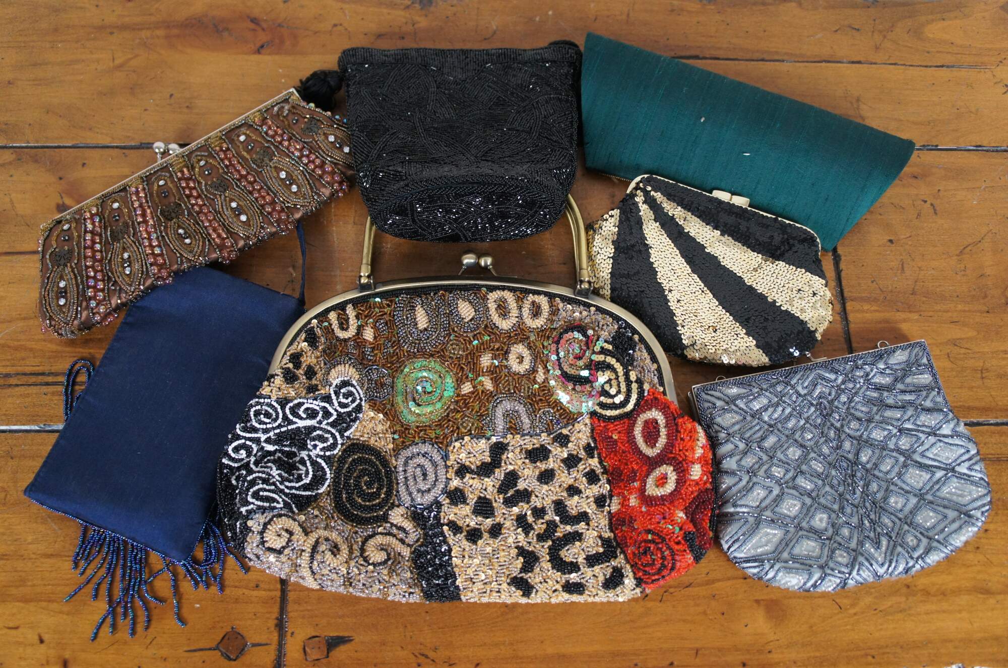 Lot of 7 late 20th century art deco style beaded and sequined hand bags / purses in a variety of colors and patterns which include: Chicos electric geometric patchwork, Lindsey Blake black art deco, Bamboo Trading Company blue and purple, La Regale silver art deco, La Regale black and gold stripe, rust and bronze bohemian, and peacock green silk with gold paisley.