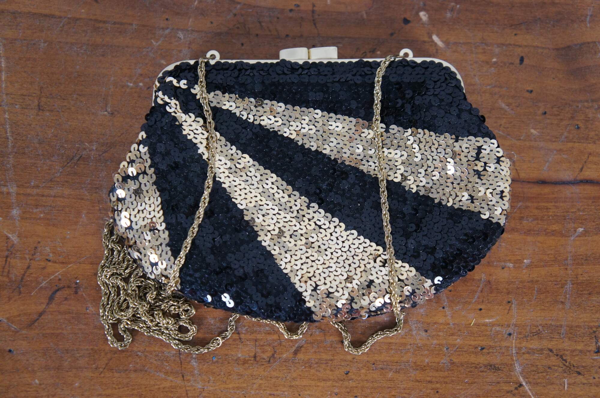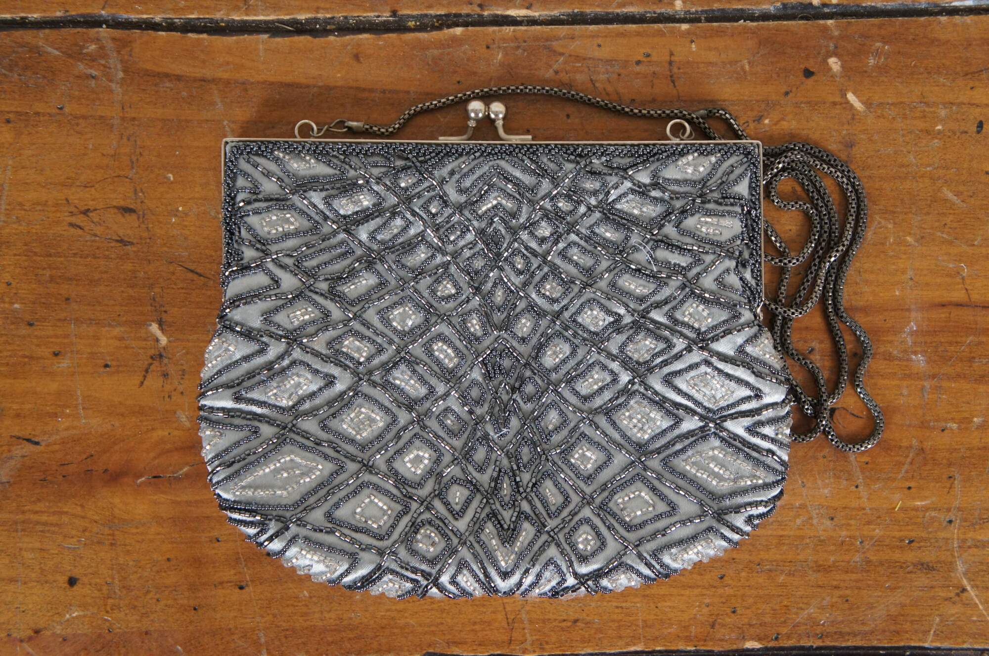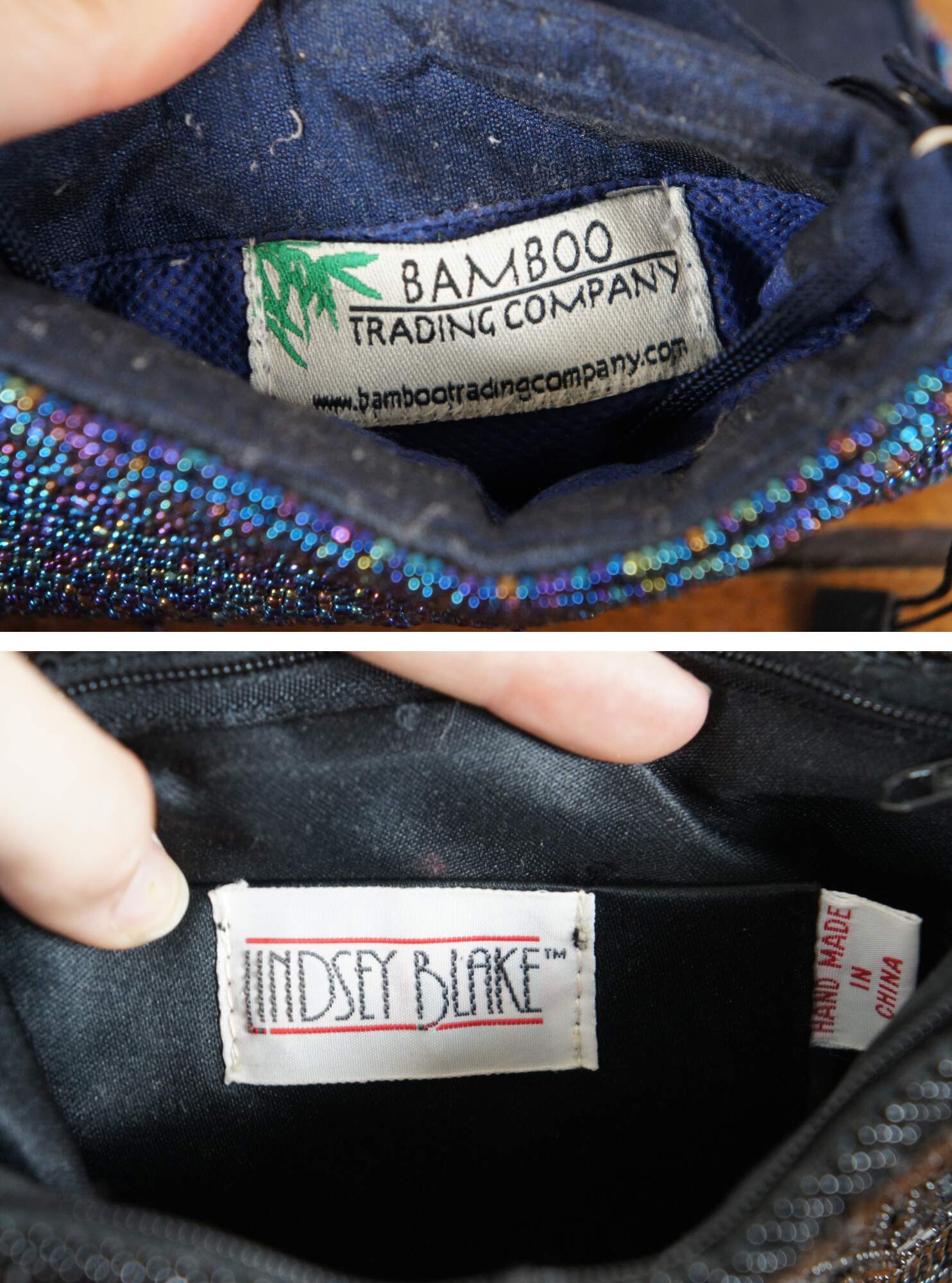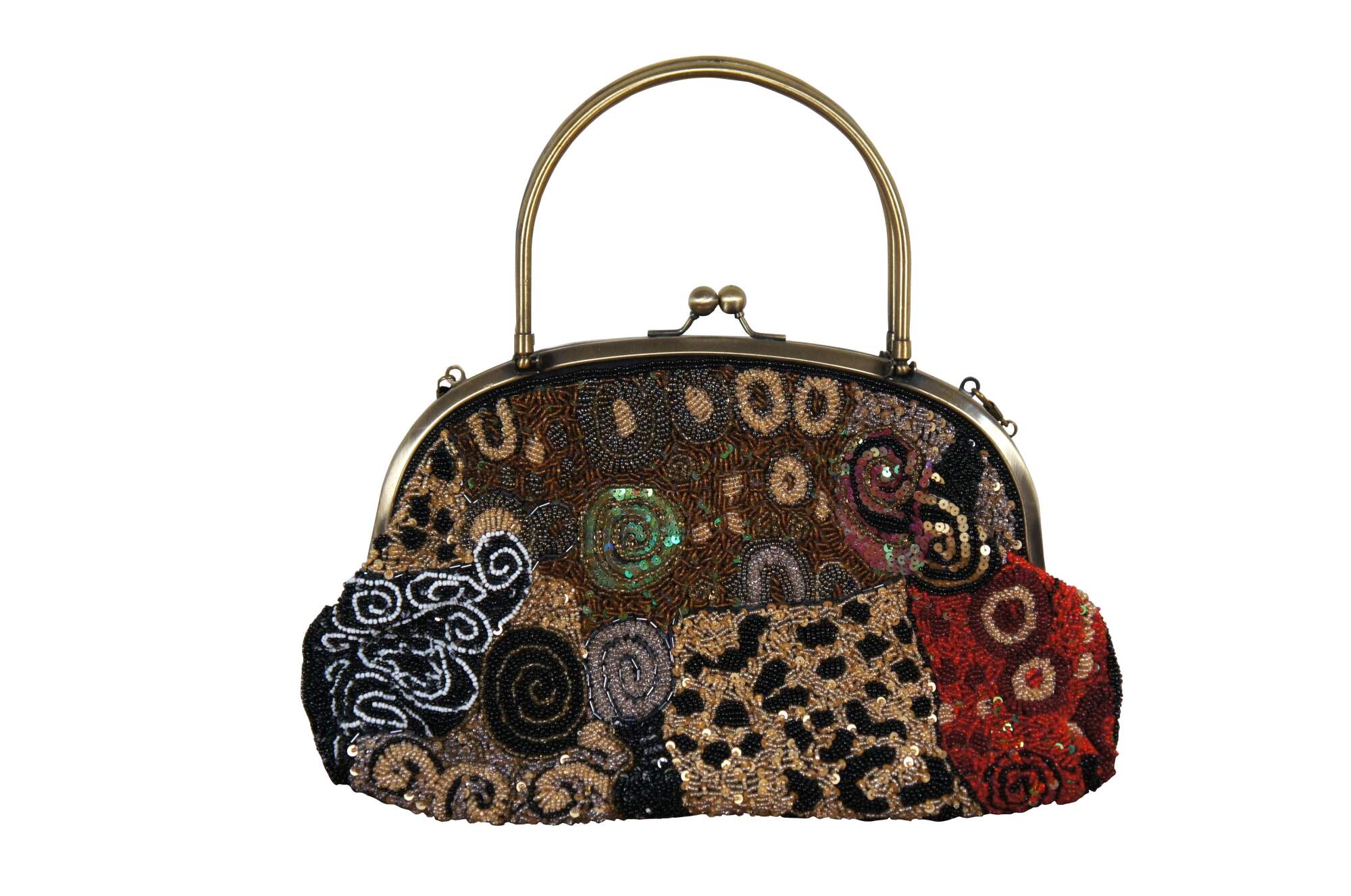Lot of 7 late 20th century art deco style beaded and sequined hand bags / purses in a variety of colors and patterns which include: Chicos electric geometric patchwork, Lindsey Blake black art deco, Bamboo Trading Company blue and purple, La Regale silver art deco, La Regale black and gold stripe, rust and bronze bohemian, and peacock green silk with gold paisley.