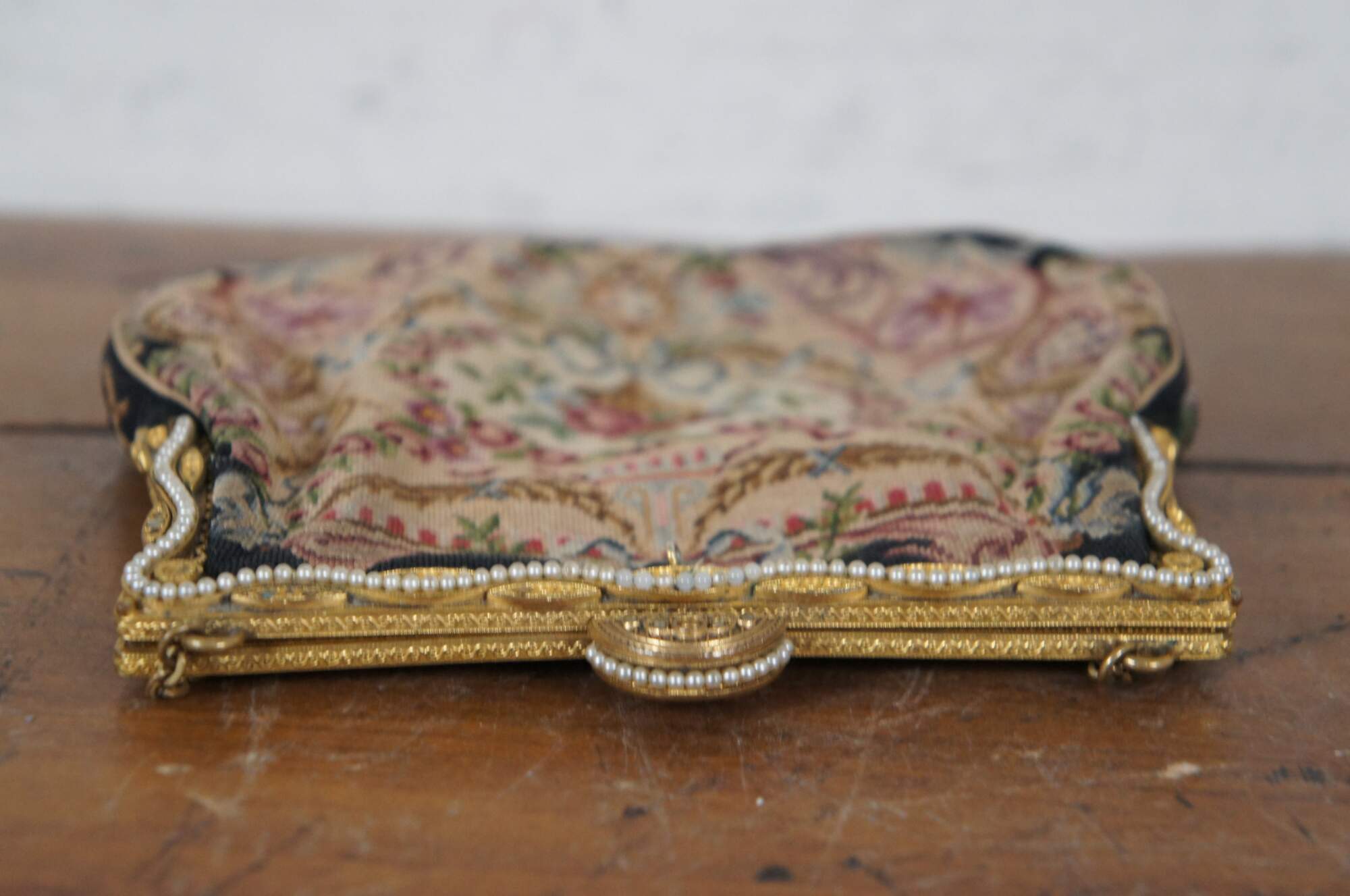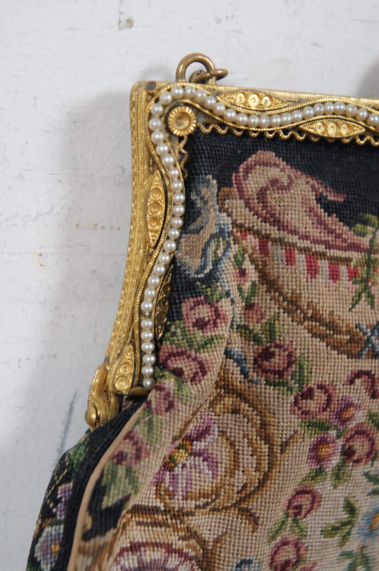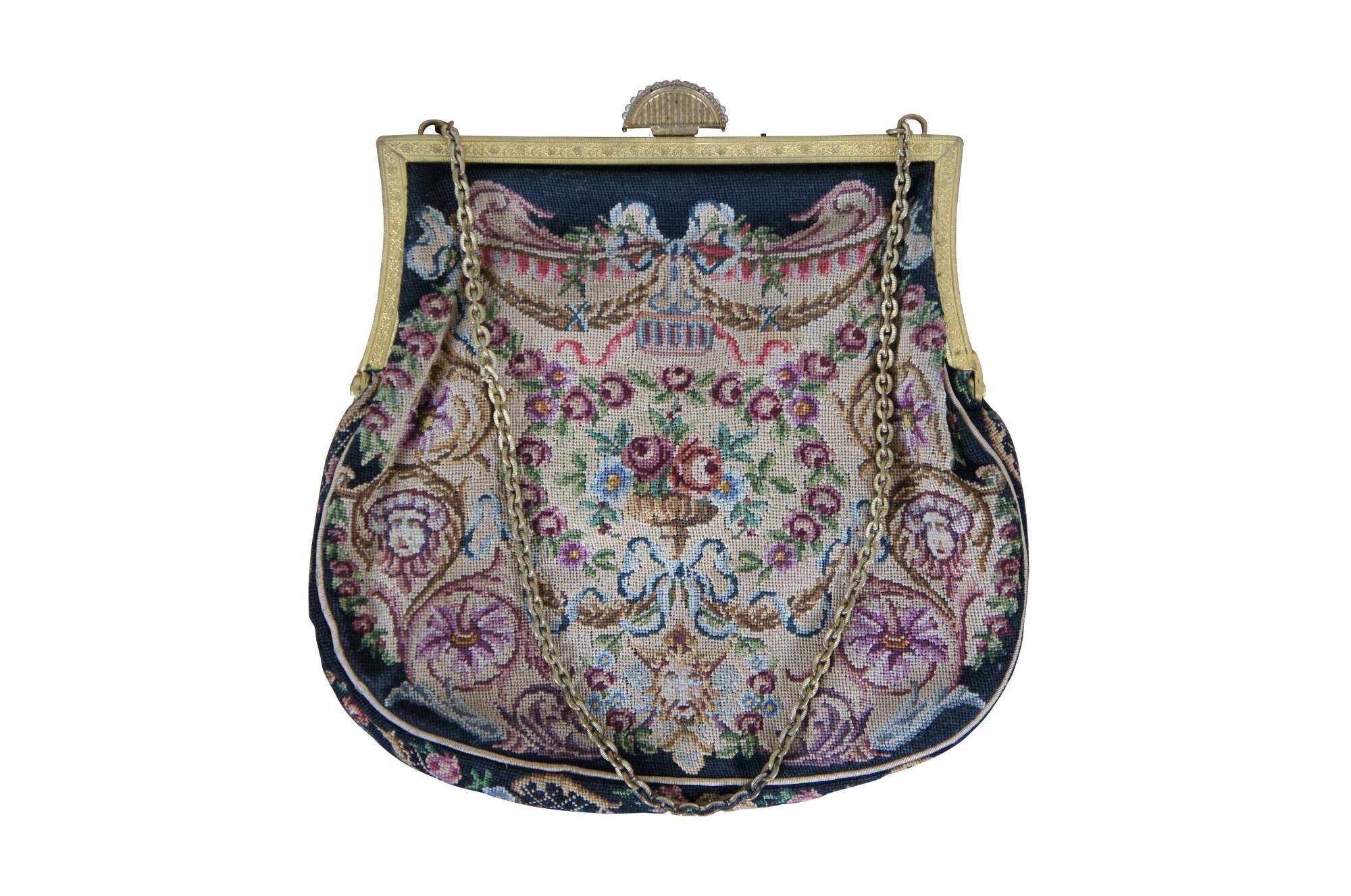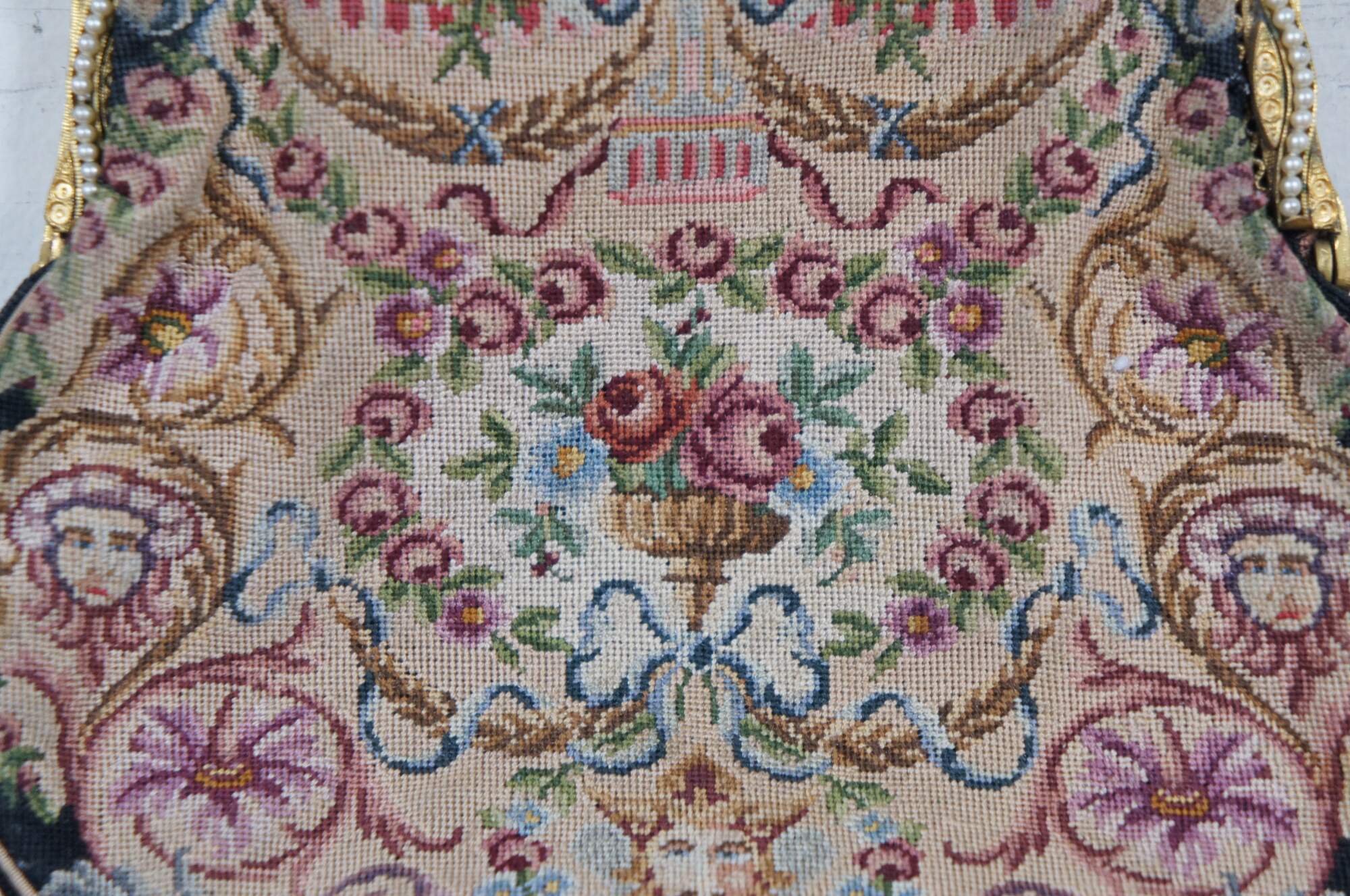 Early to mid 20th century petit point embroidered tapestry evening bag / purse, featuring an intricate design of flowers, foliates, and faces. Patterned gold tone clamshell clasp with fan shaped catch, decorated with rhinestones and faux seed pearls. Tan fabric interior with two slip pockets. Gold tone cable chain strap.