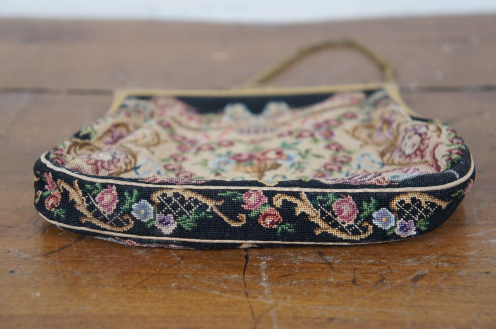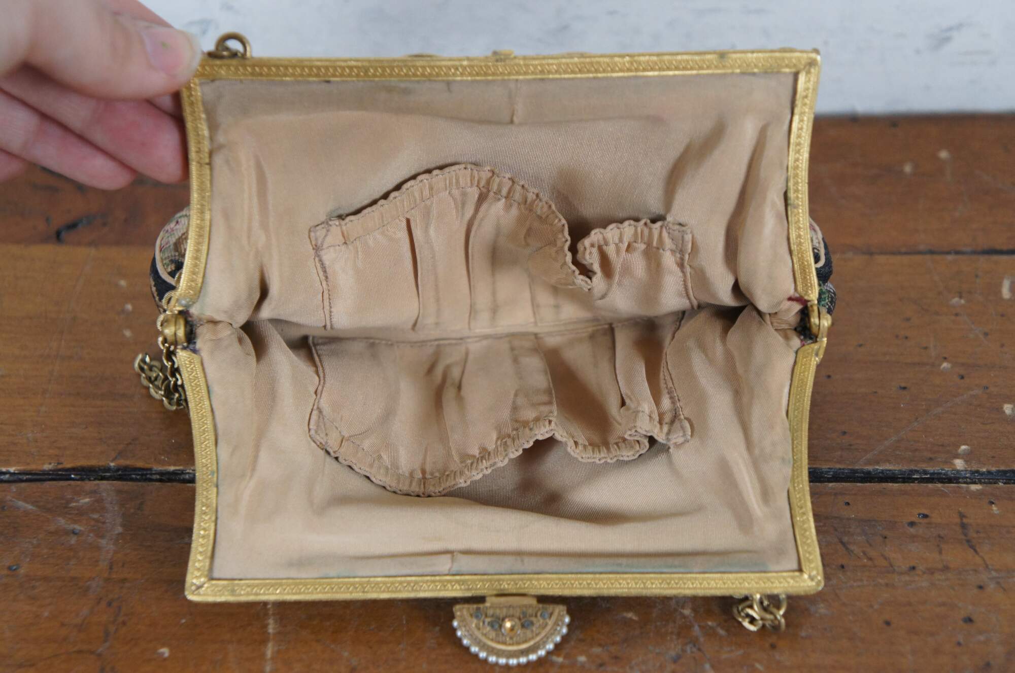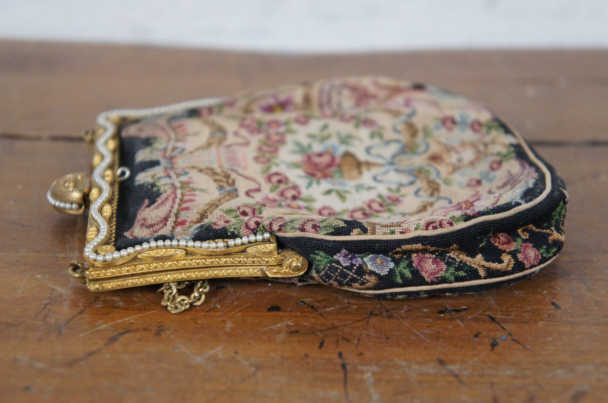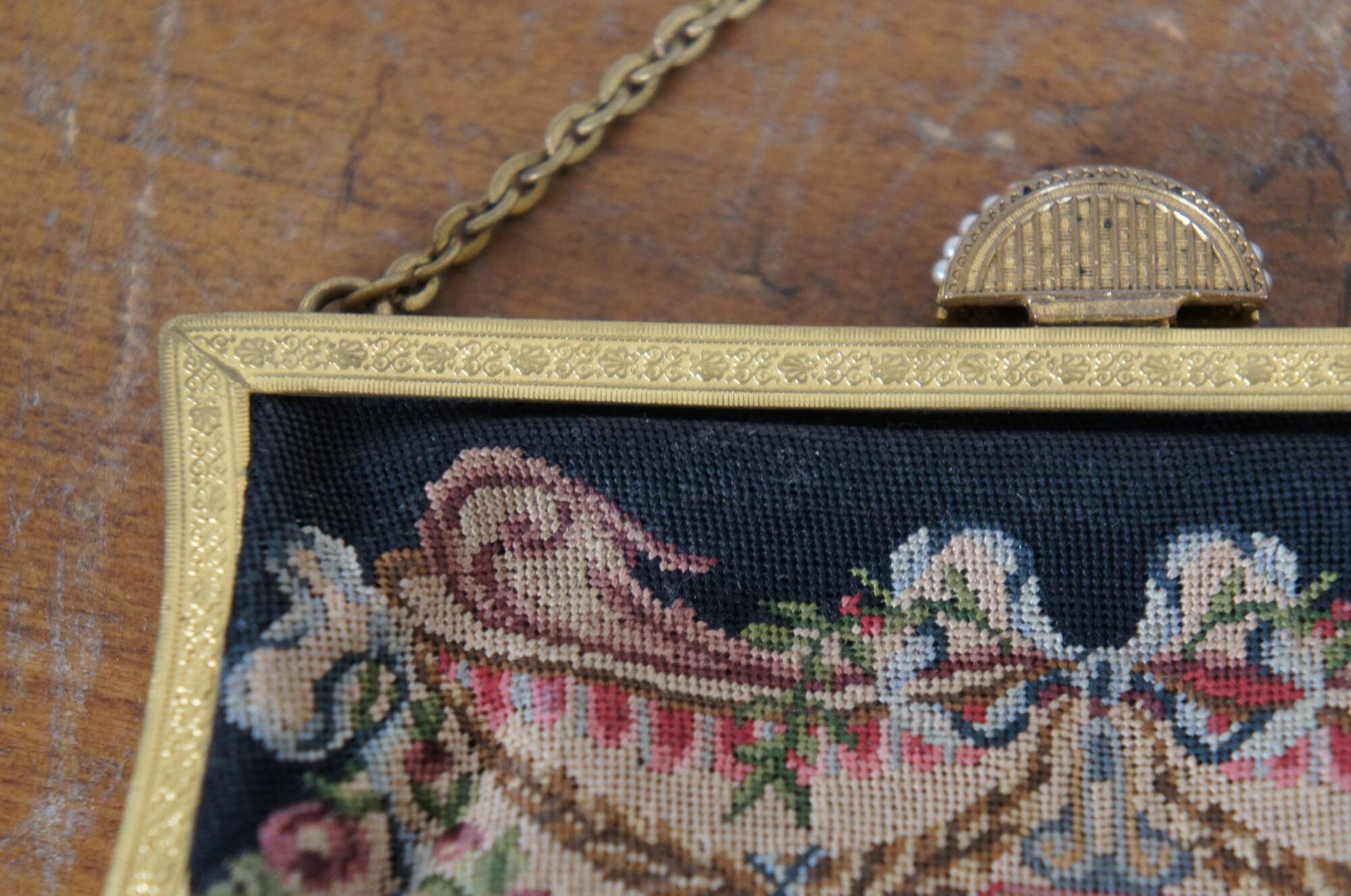 Early to mid 20th century petit point embroidered tapestry evening bag / purse, featuring an intricate design of flowers, foliates, and faces. Patterned gold tone clamshell clasp with fan shaped catch, decorated with rhinestones and faux seed pearls. Tan fabric interior with two slip pockets. Gold tone cable chain strap.