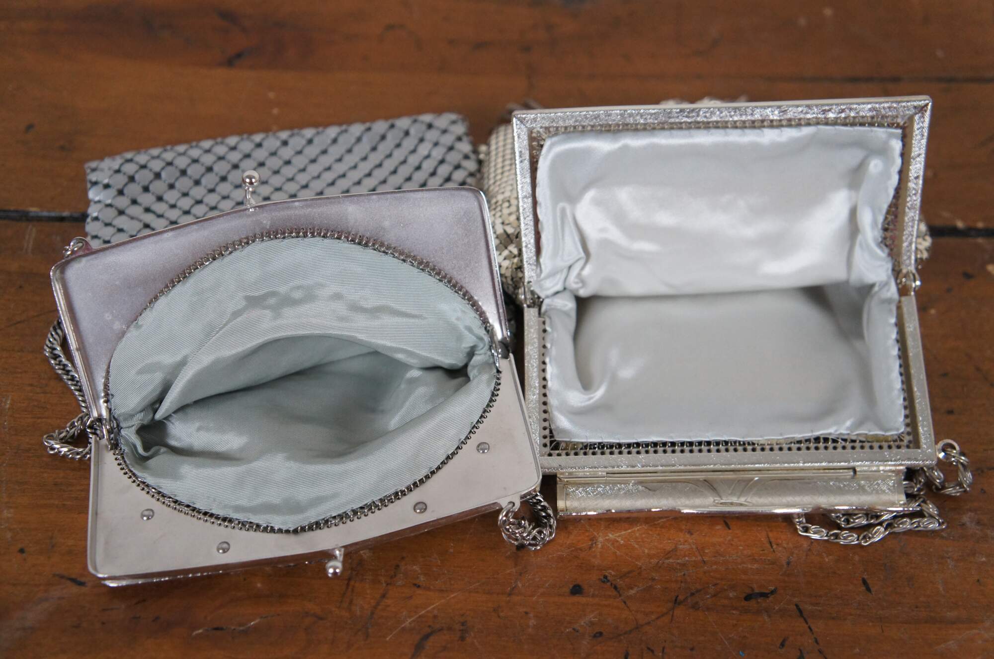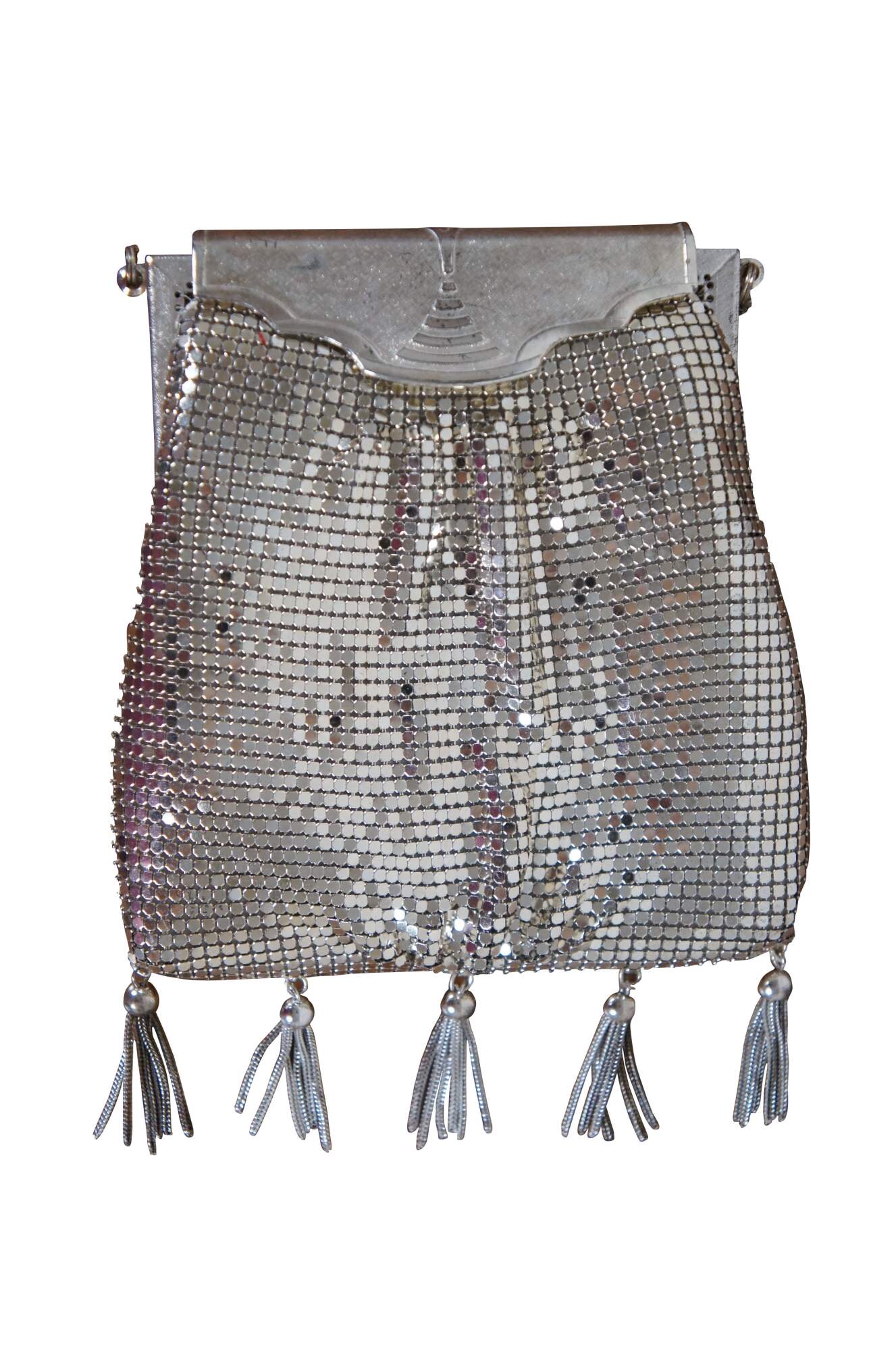 Pair of early to mid 20th century silver tone metal mesh purses / evening bags. One by Whiting & Davis features a bruched silver mesh with brightly polished clasp molded with an art nouveau motif of flowers and cherub; gray fabric lining; curb chain shoulder strap. The other (unmarked) features bright silver mesh with five metal tassels suspended from the base and an art deco flip top clasp; scroll/snail chain shoulder strap; gray satin lining.