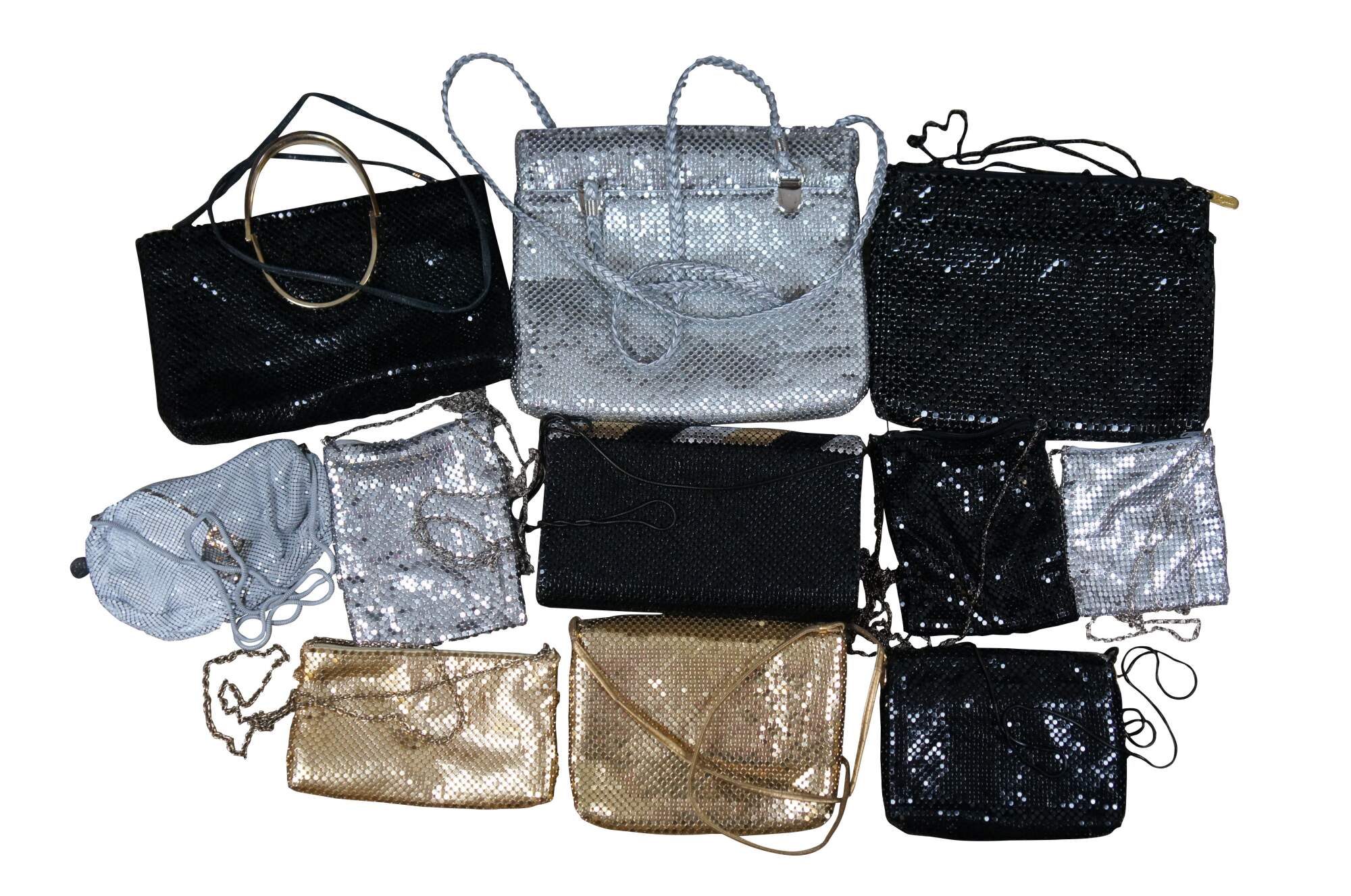 Lot of 11 late 20th century metal mesh evening bags. Four silver, two gold, three black, and two with black gold and silver flaps. Brands include: Y&S, Twilight Collection, La Regale Ltd, Style & Co. Made in China / Hong Kong / Taiwan.