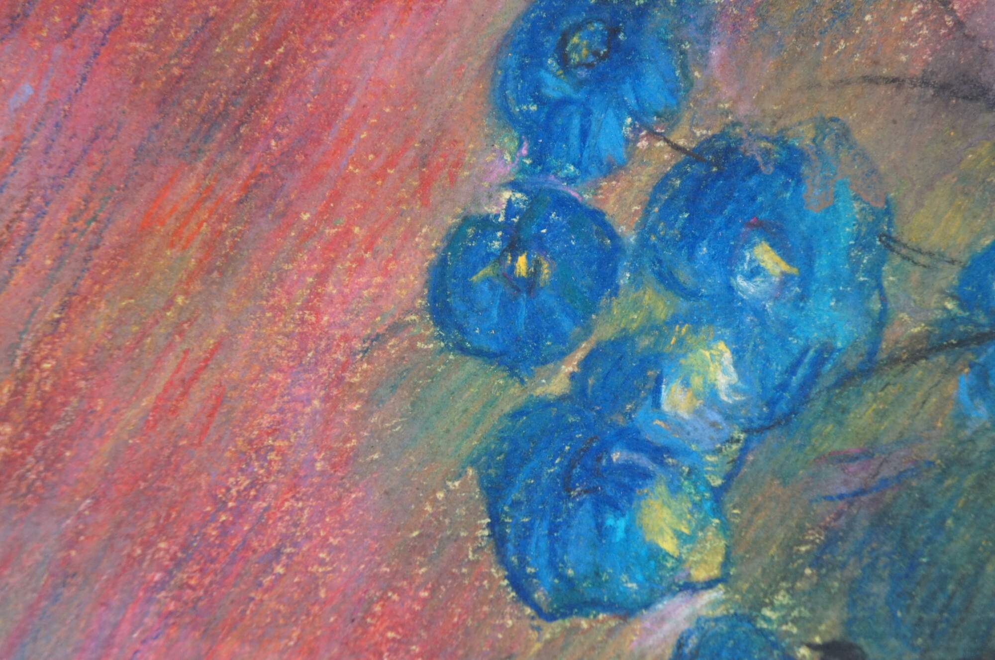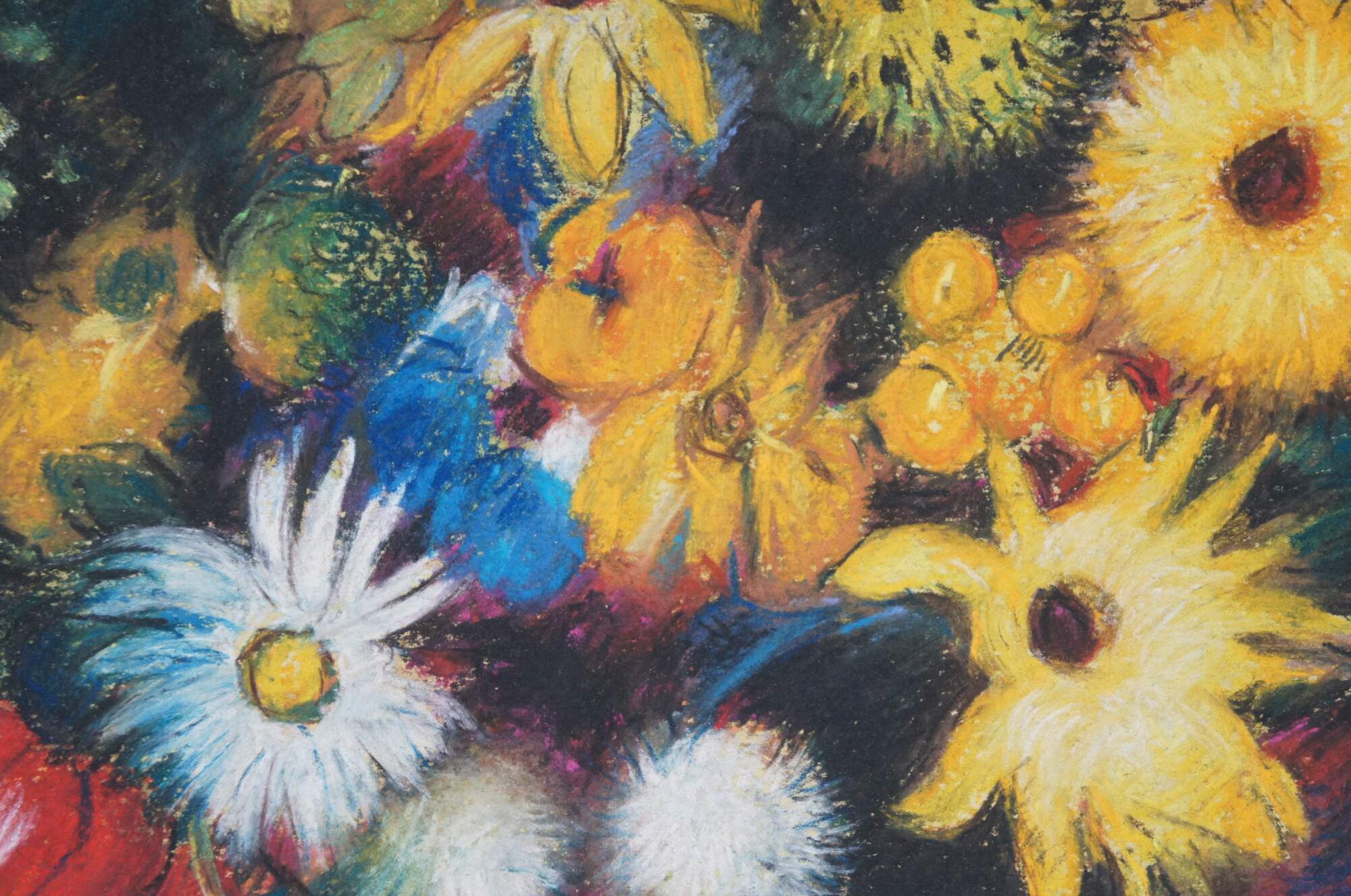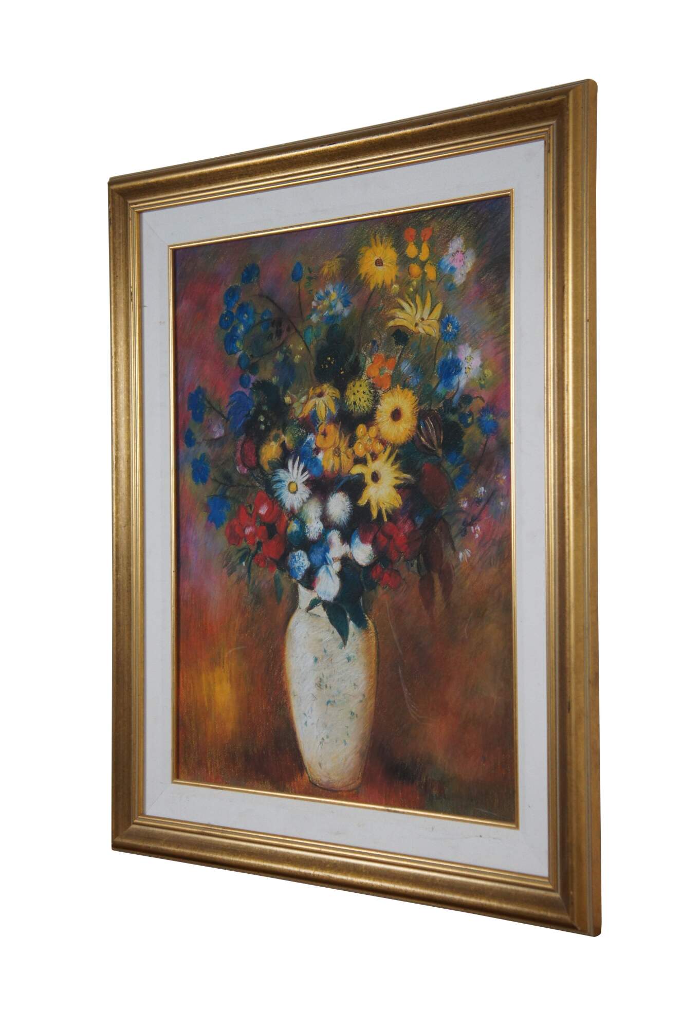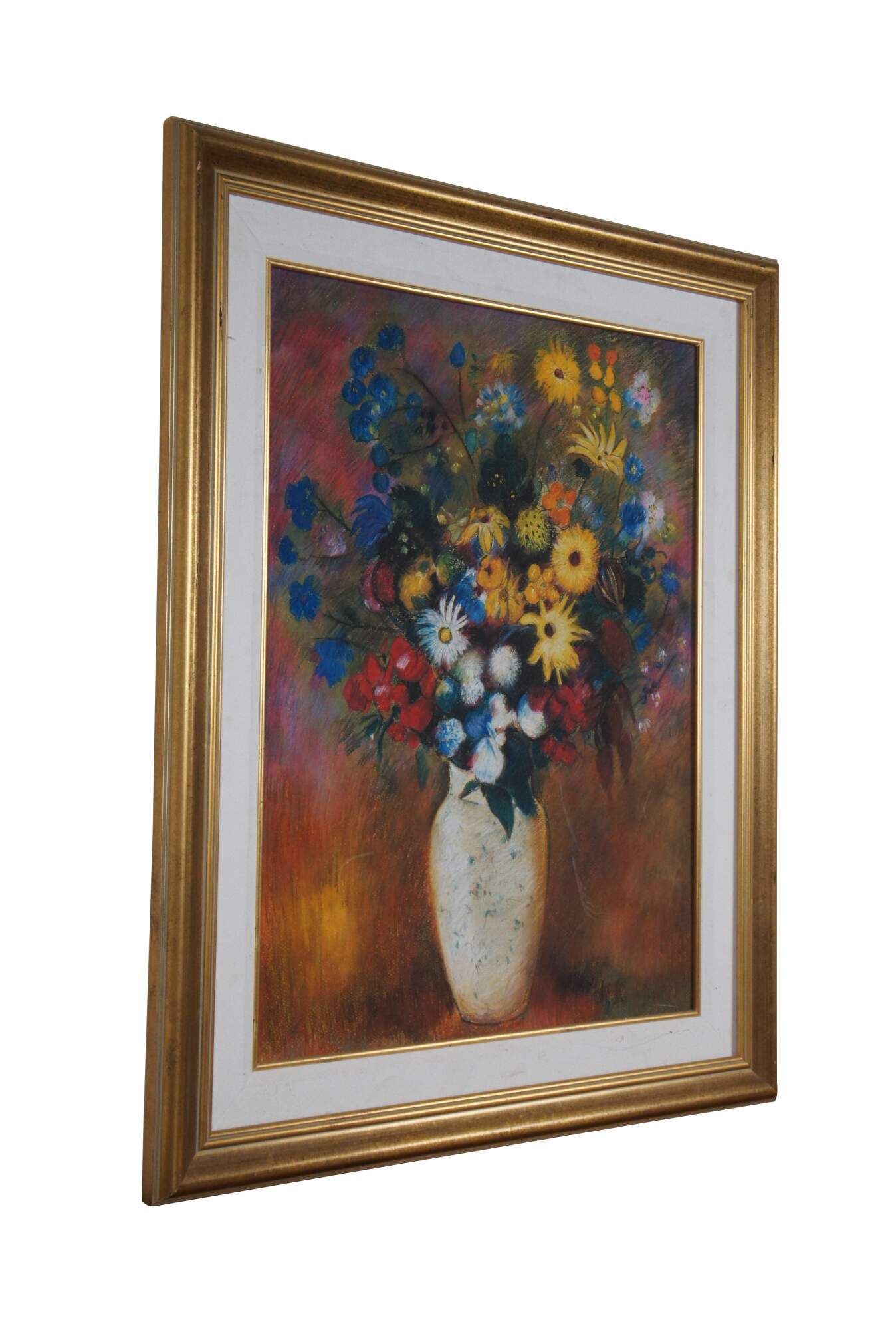 Late 20th century print on board after the pastel painting "Large Bouquet In A Japanese Vase" by Odilon Redon. Depicts a multicolored bouquet of flowers in a white vase on a mottled background. Gold beveled frame with white linen border.