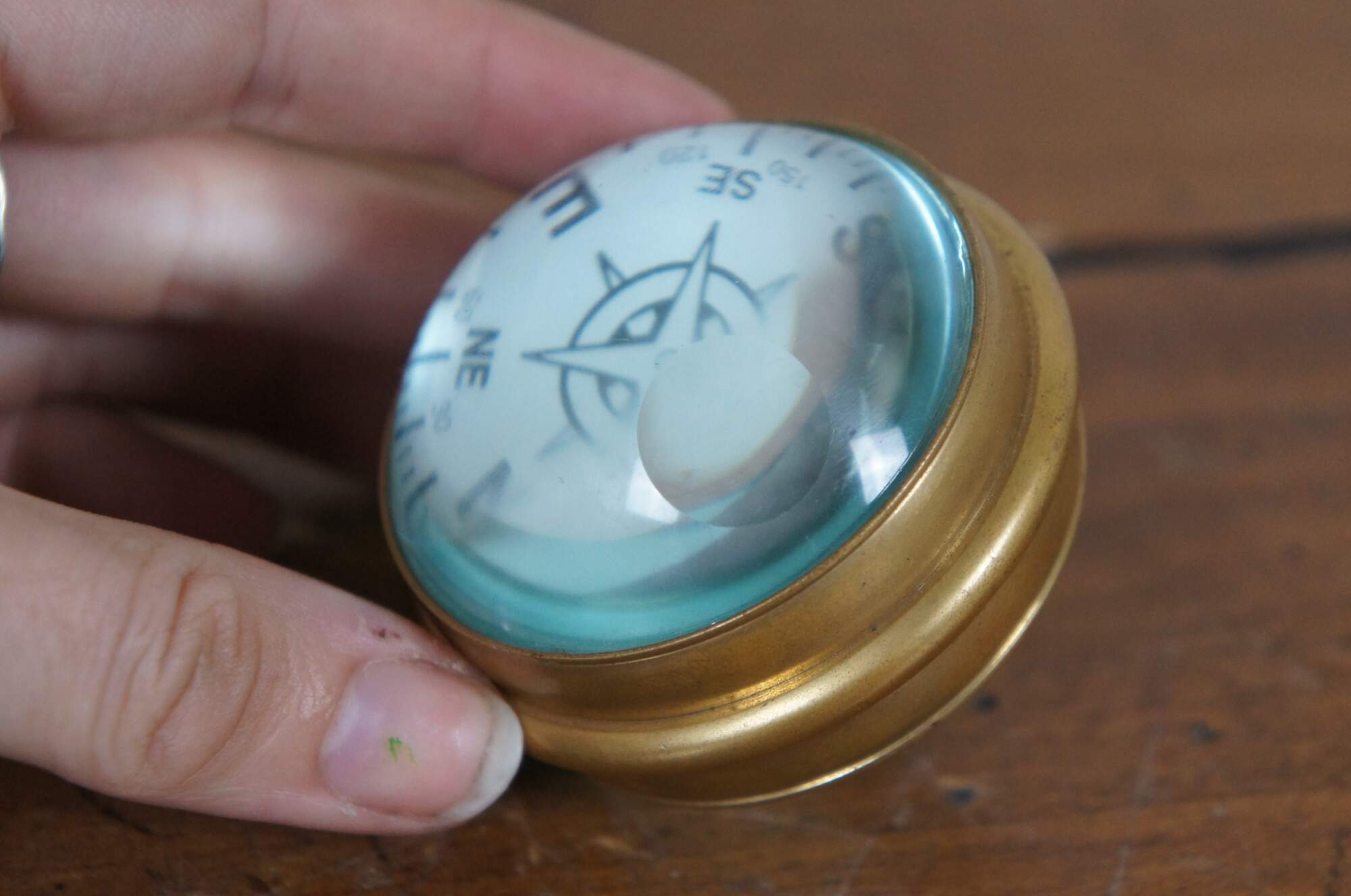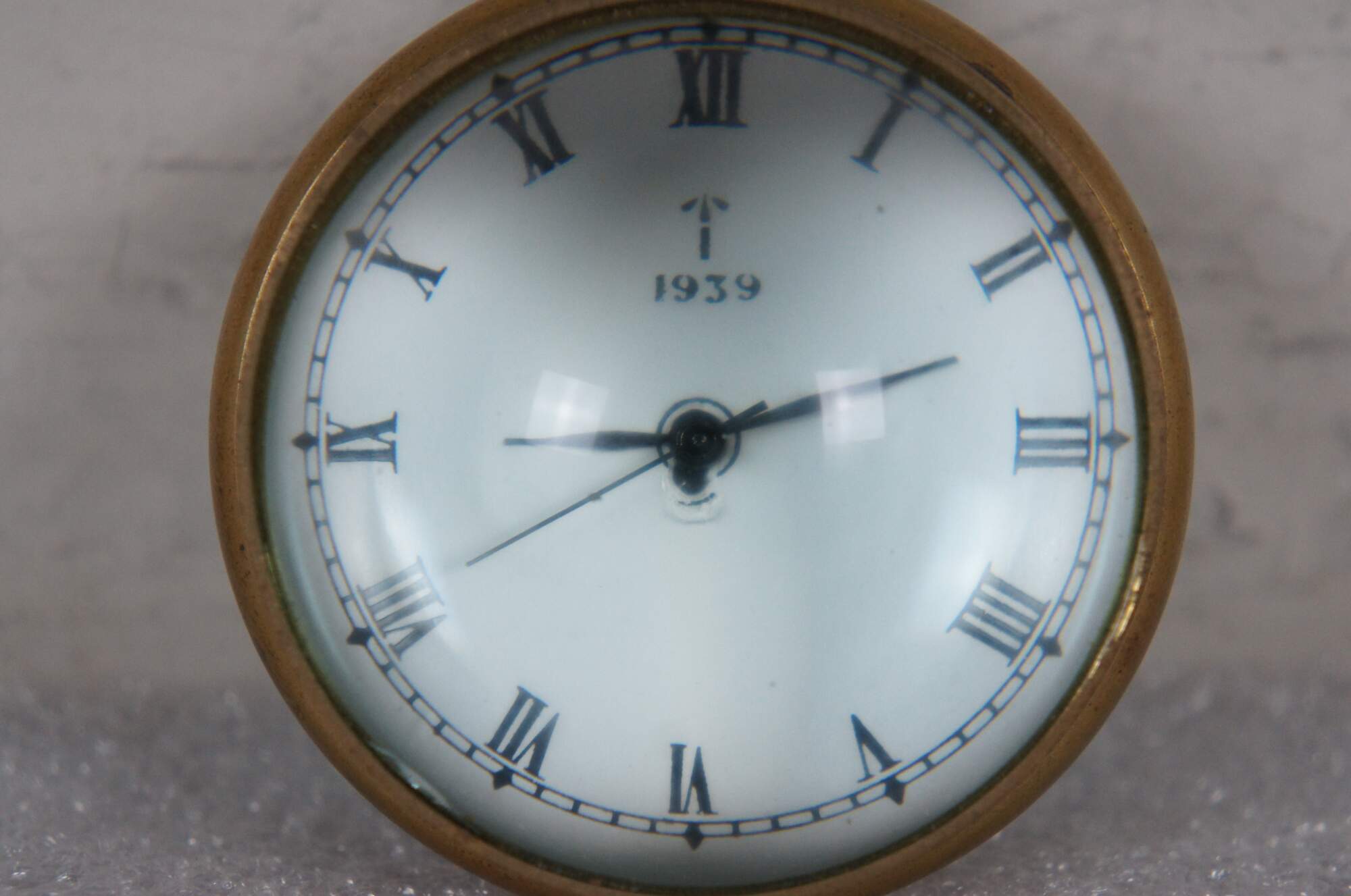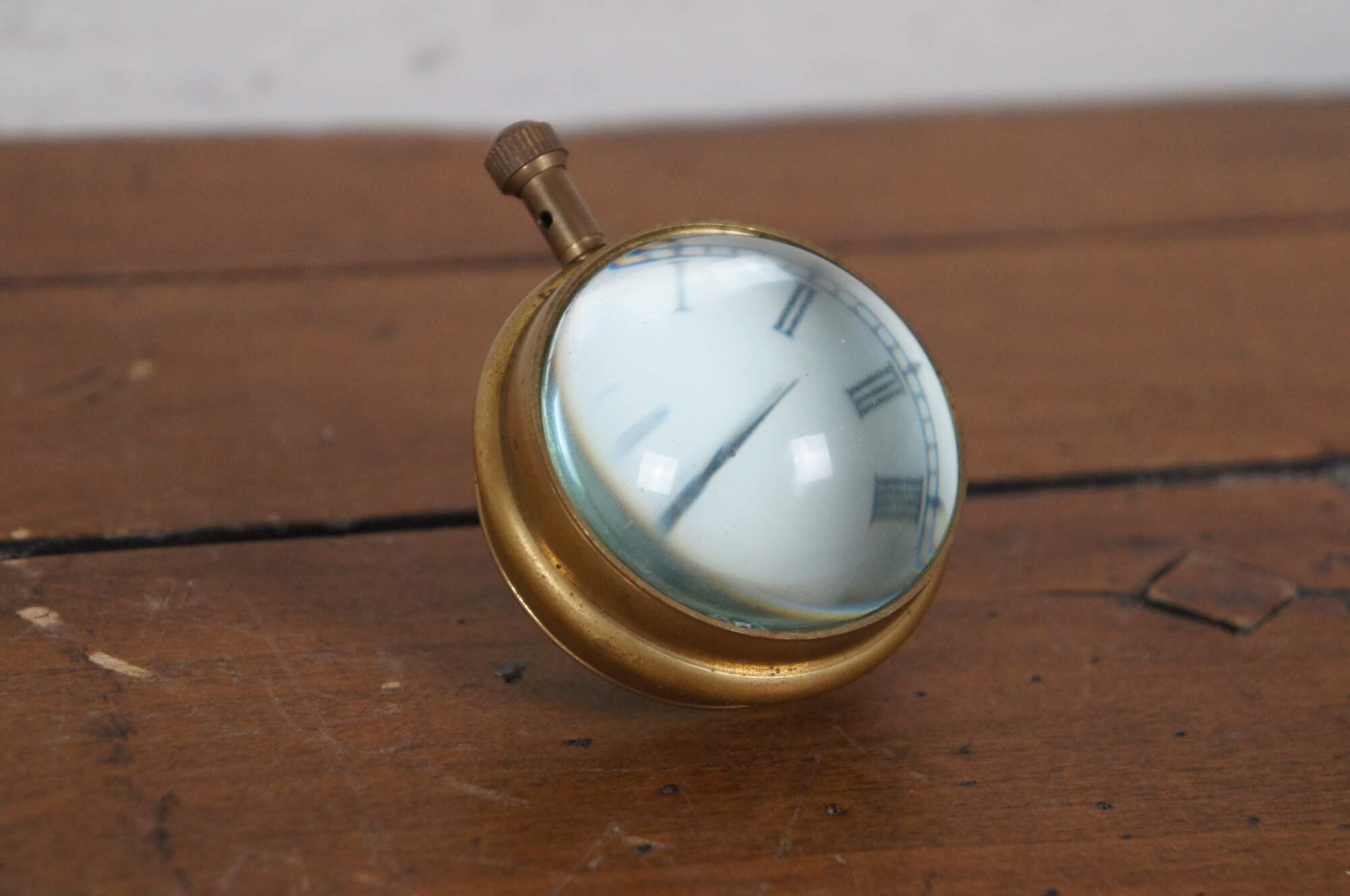 Late 20th century bubble glass desk clock - pocket watch shaped brass frame with orb shaped bubble glass front and back. White clock face with black Roman numerals and hand, marked 1939. Reverse is printed with a faux compass. Battery operated movement.