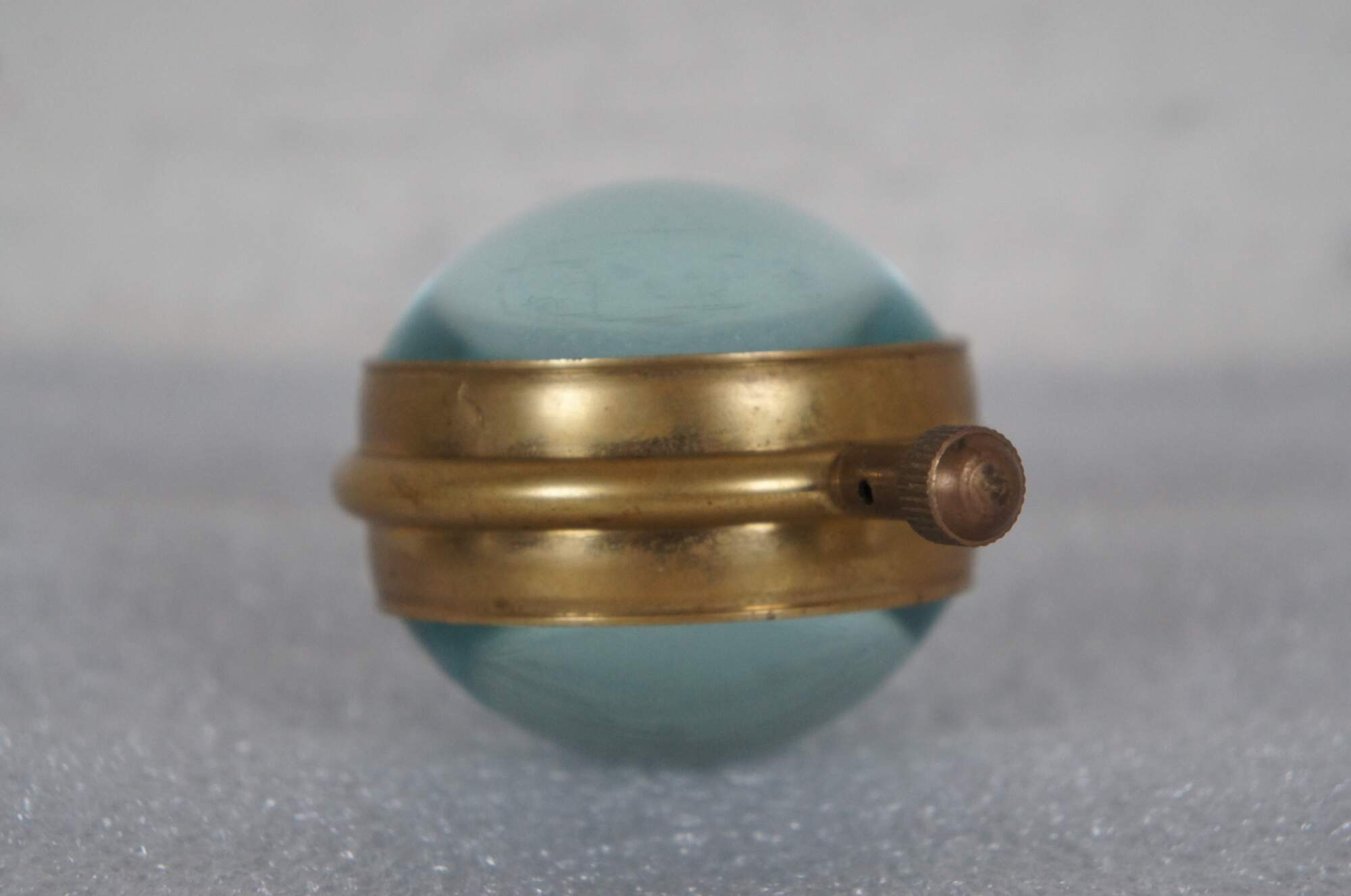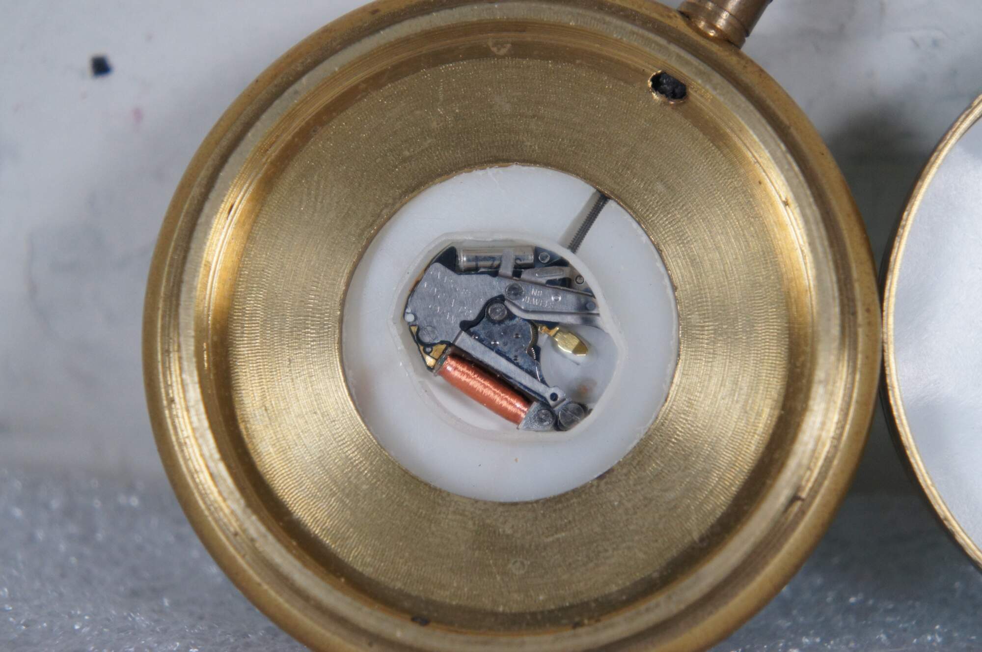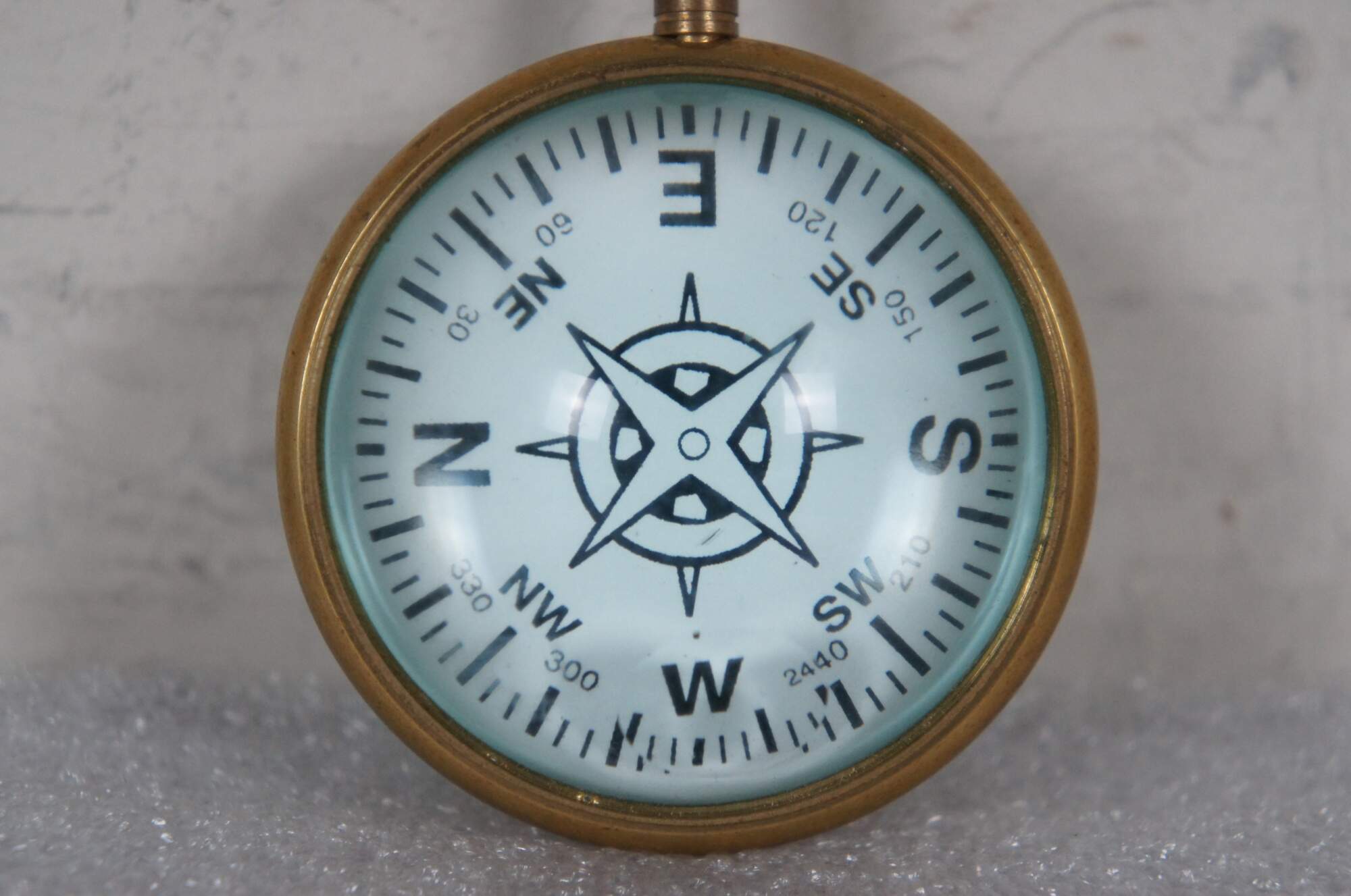 Late 20th century bubble glass desk clock - pocket watch shaped brass frame with orb shaped bubble glass front and back. White clock face with black Roman numerals and hand, marked 1939. Reverse is printed with a faux compass. Battery operated movement.