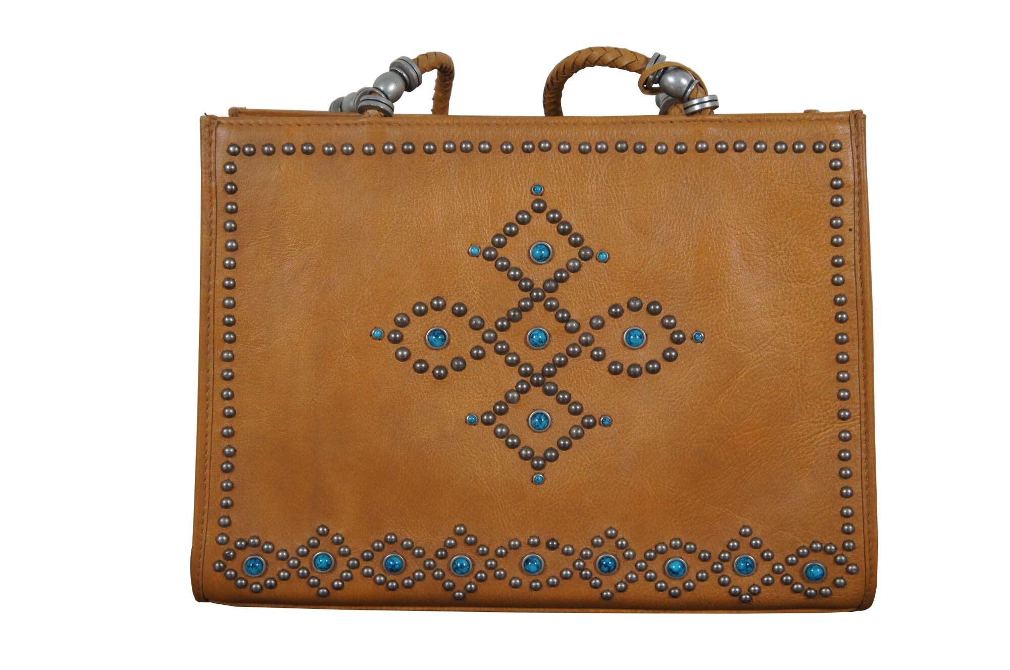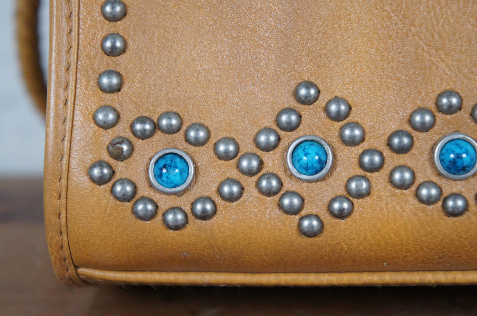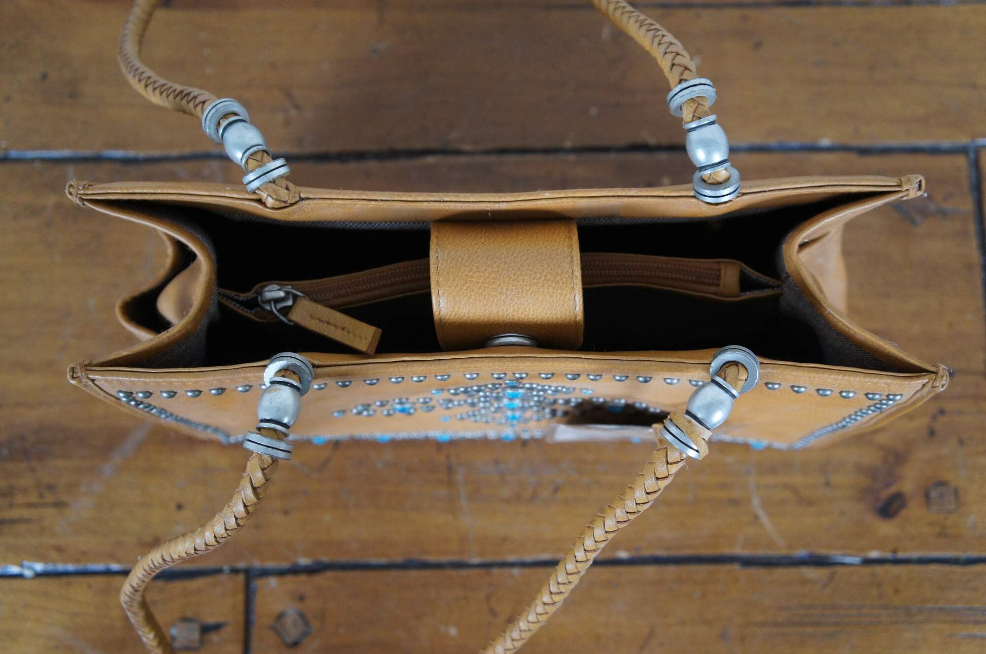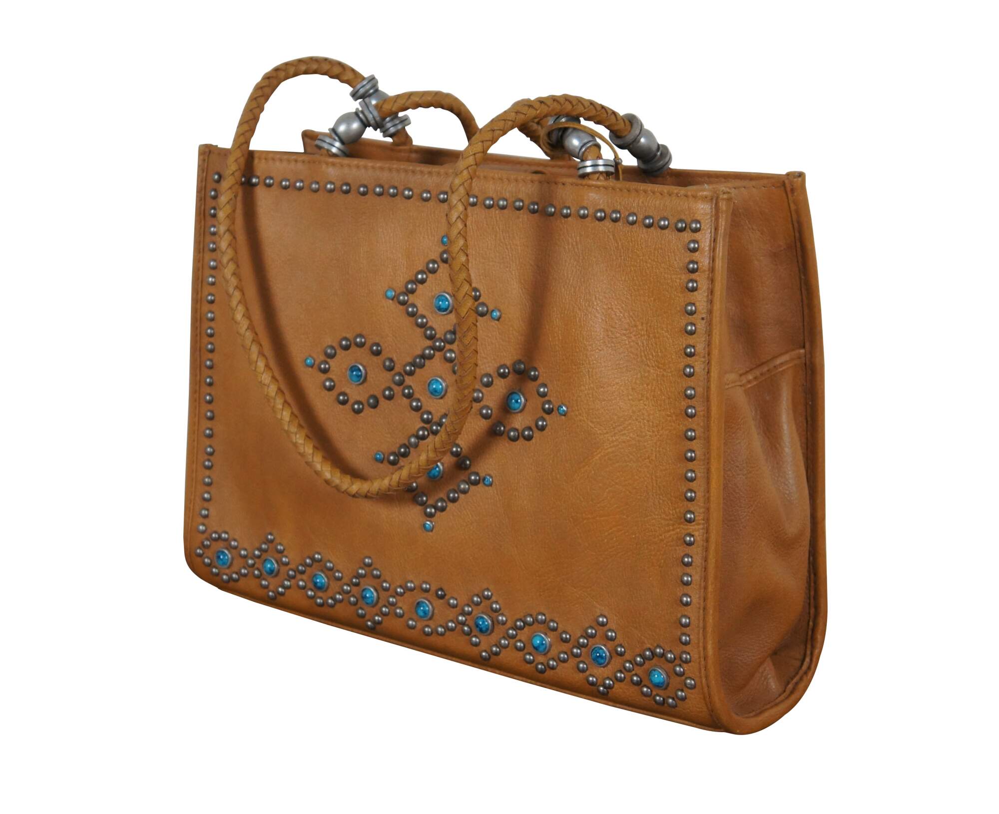 Late 20th century Scully shoulder bag / purse. Made of medium brown leather featuring a Southwestern design of silver studs and turquoise cabochons. Two exterior slip pockets. Double braided leather handles with silver bead accents. Magnetic snap closure. Black and white fabric lining; two open inner compartments divided by center zippered section; one zipper interior pocket and one interior slip pocket. Made in India. Includes original tag.