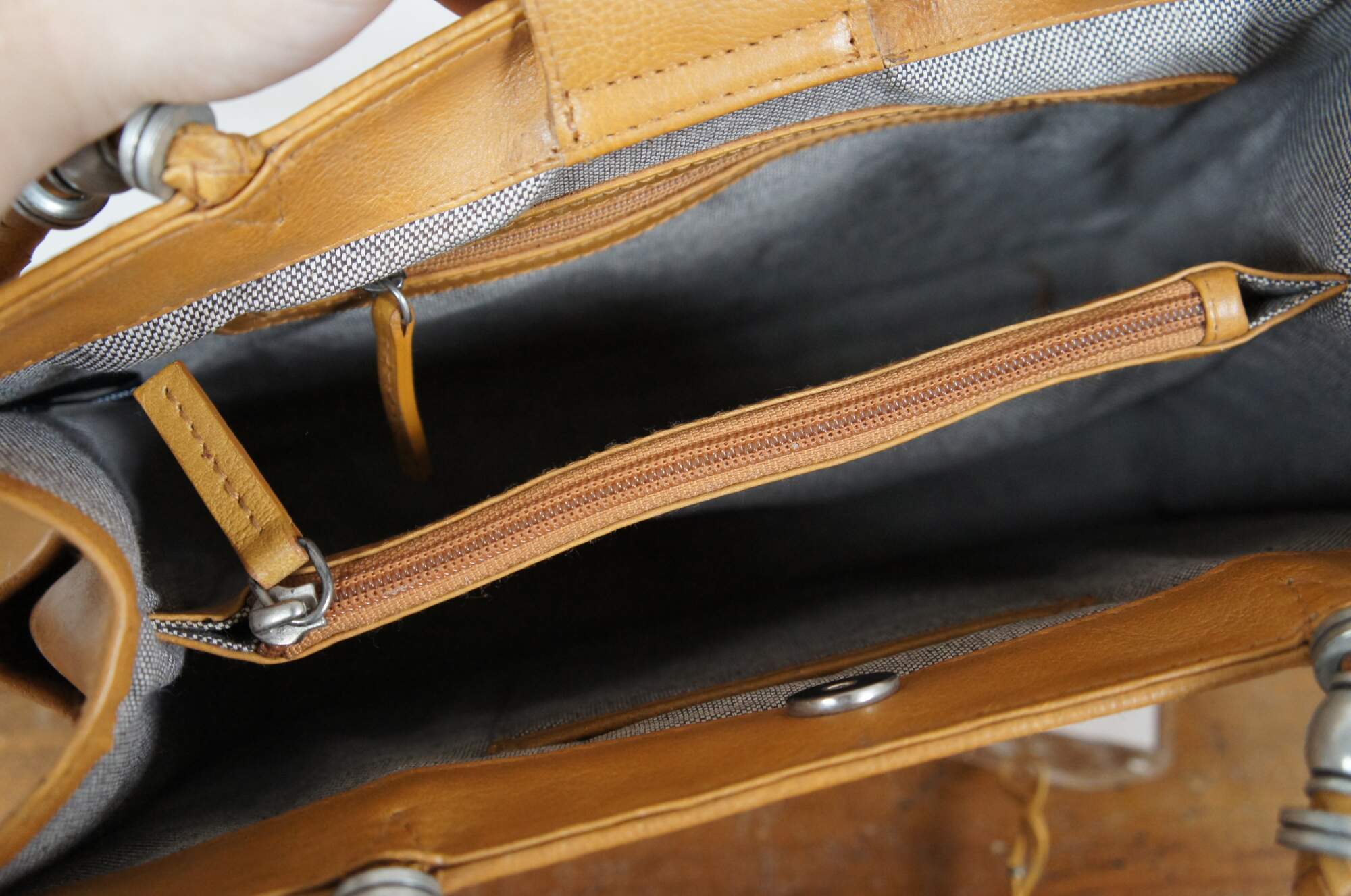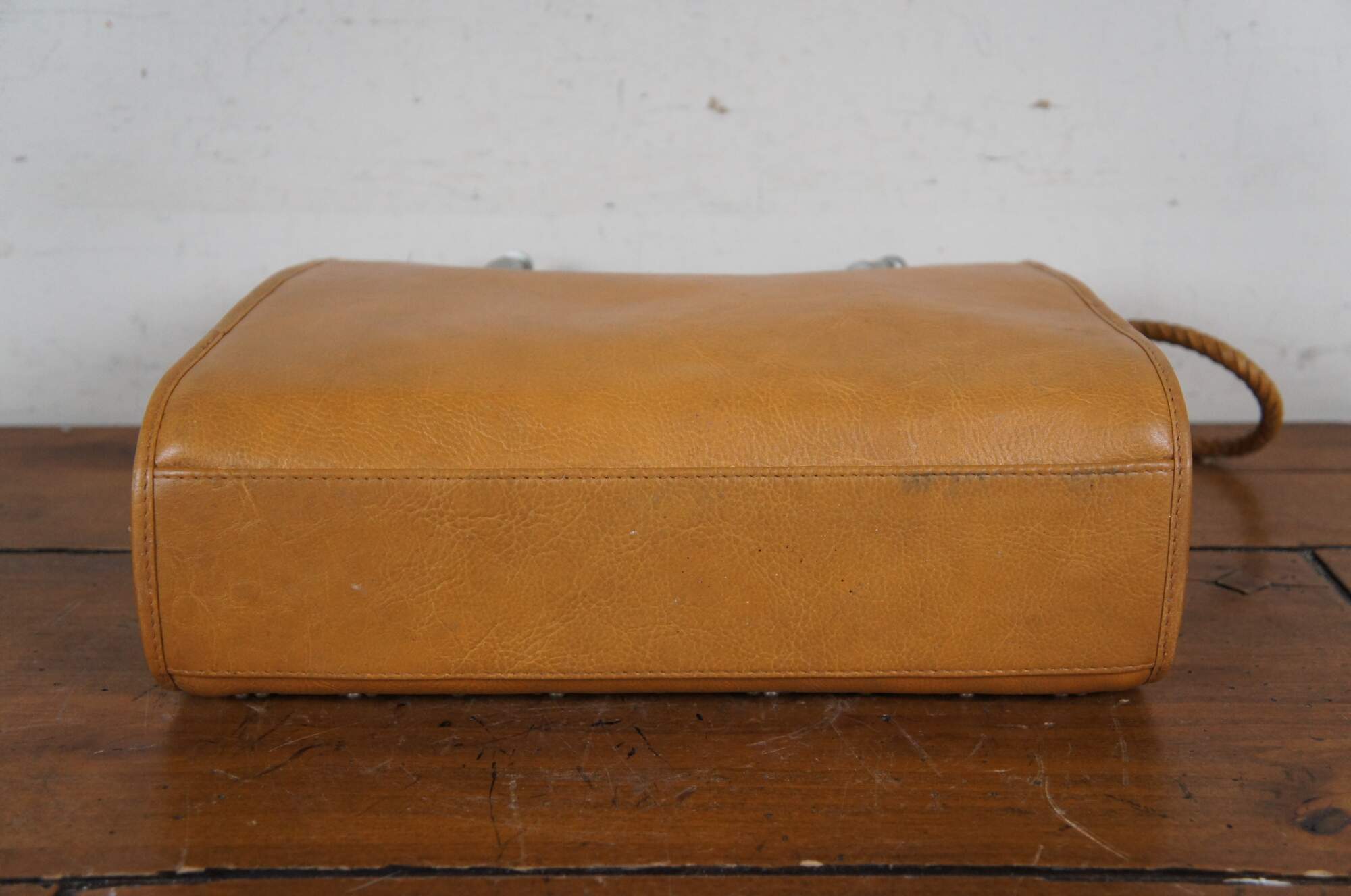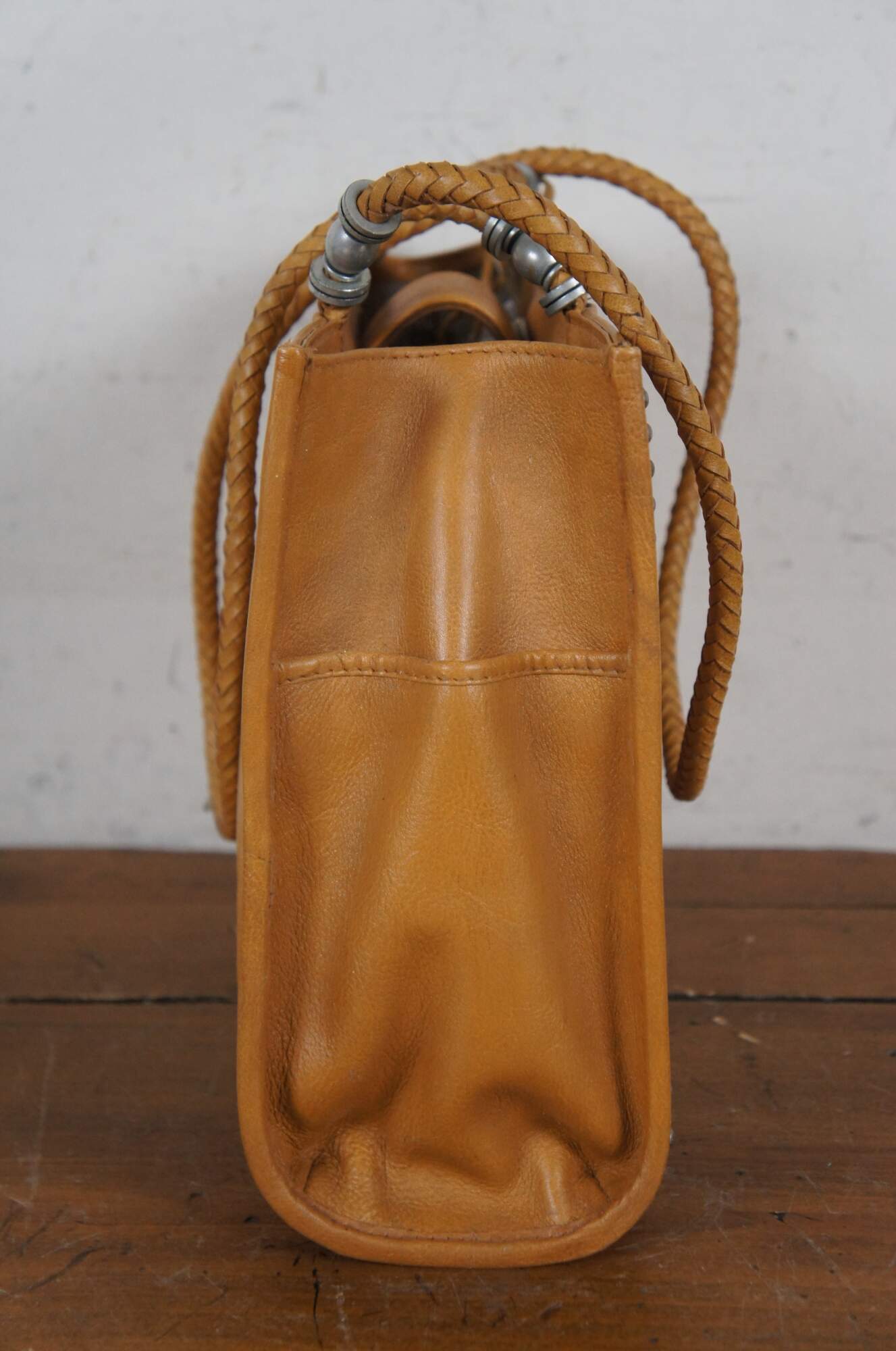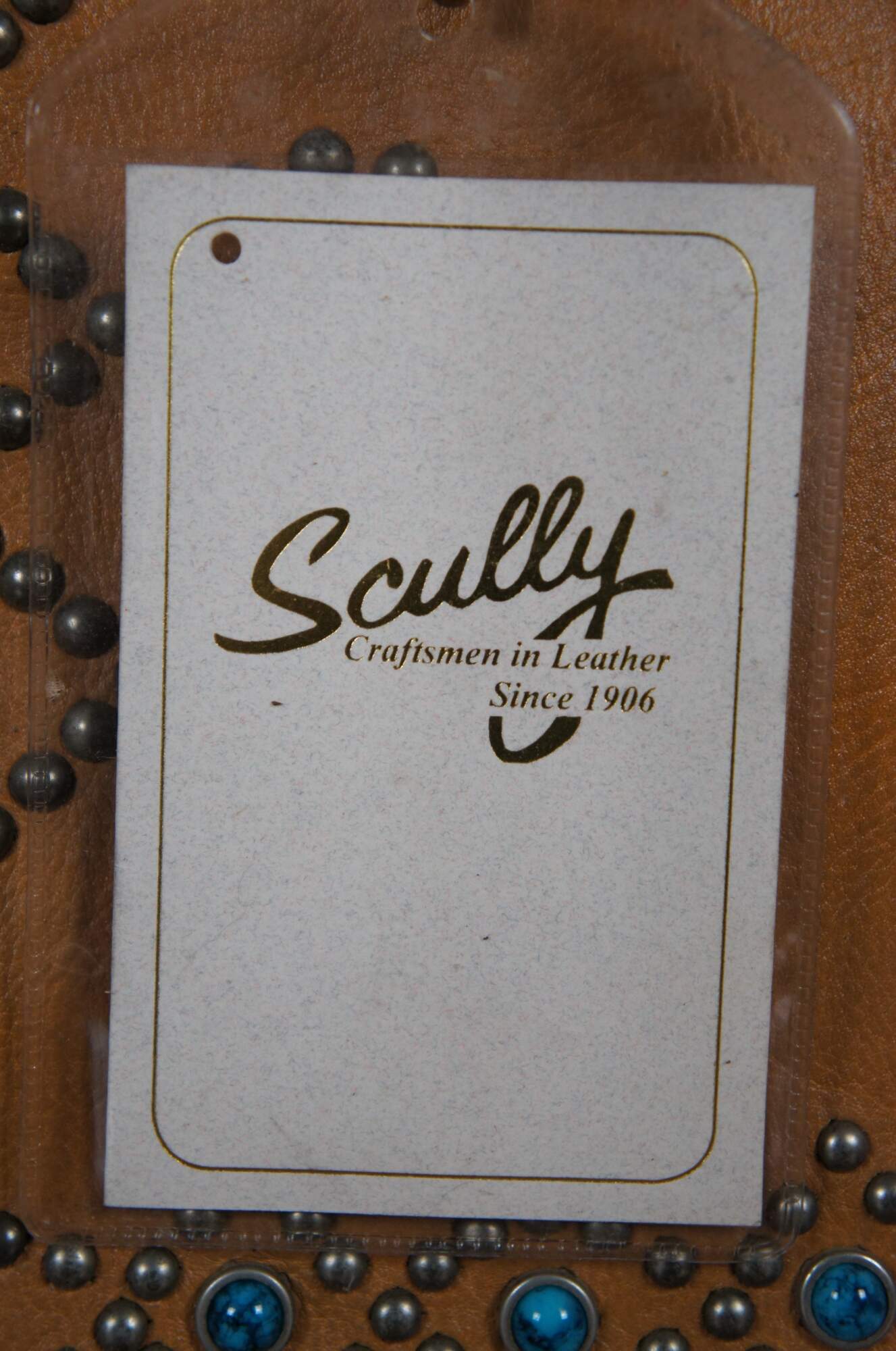 Late 20th century Scully shoulder bag / purse. Made of medium brown leather featuring a Southwestern design of silver studs and turquoise cabochons. Two exterior slip pockets. Double braided leather handles with silver bead accents. Magnetic snap closure. Black and white fabric lining; two open inner compartments divided by center zippered section; one zipper interior pocket and one interior slip pocket. Made in India. Includes original tag.
