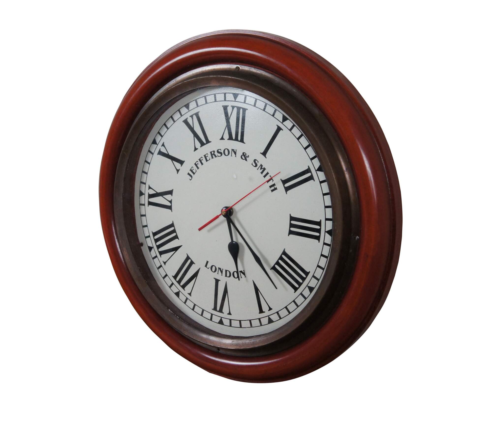 Late 20th century Jefferson & Smith London reproduction round schoolhouse style wall clock - wood and brass frame, white face with black Roman numerals and hands, red second hand. Made in India. Young Town Quartz battery operated movement.