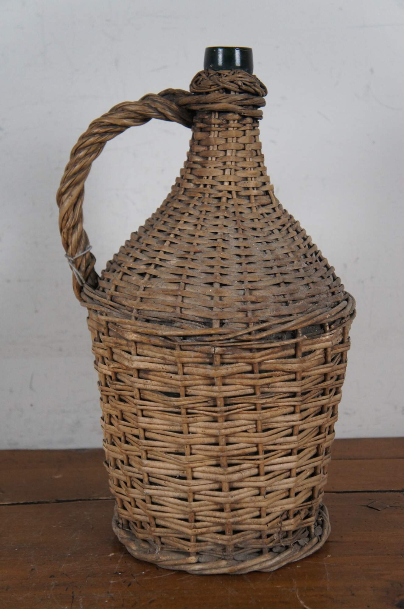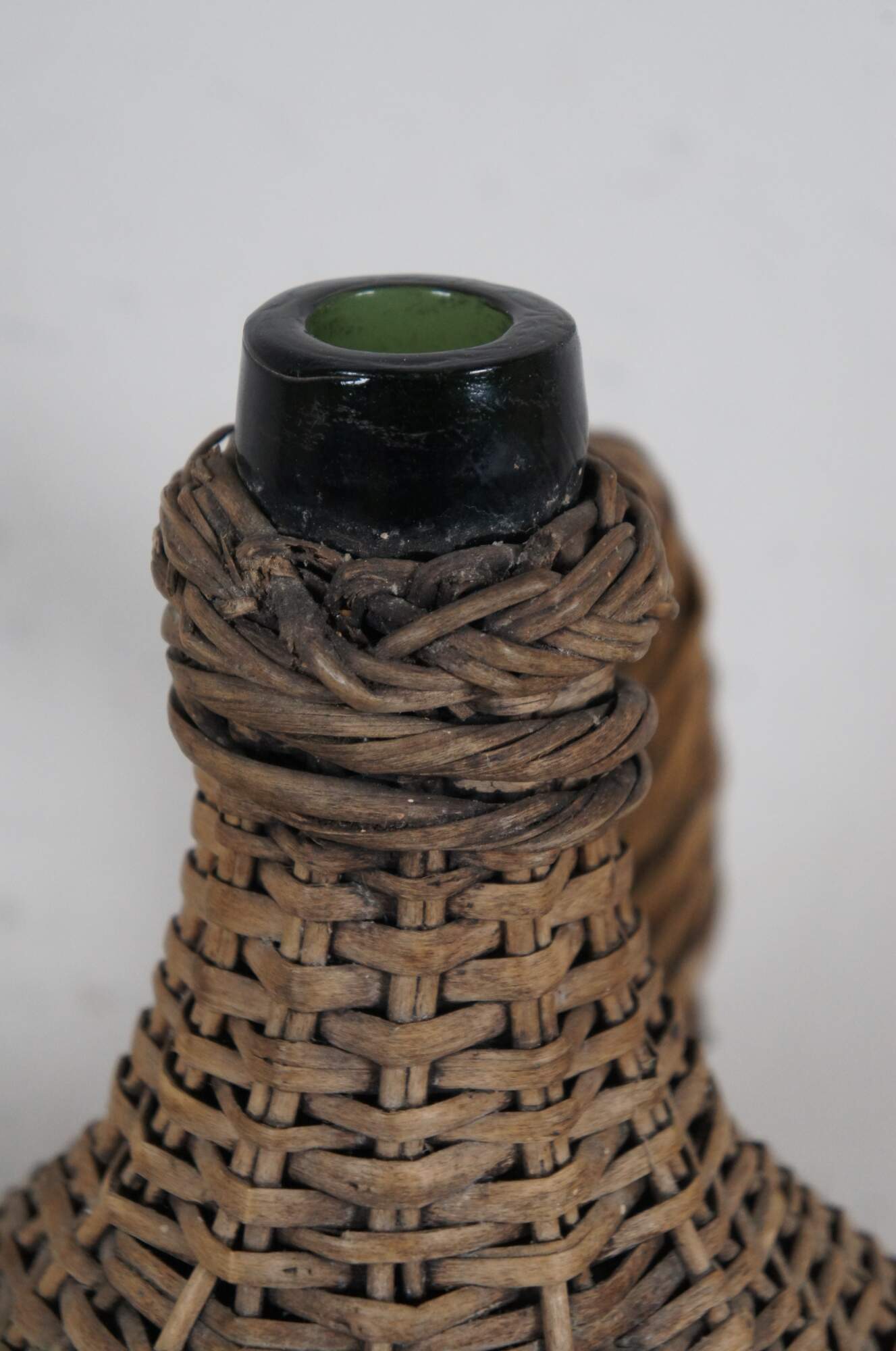 Circa 1920s green glass wine bottle / demijohn, fully wrapped in woven wicker with twisted handle. No cork.
