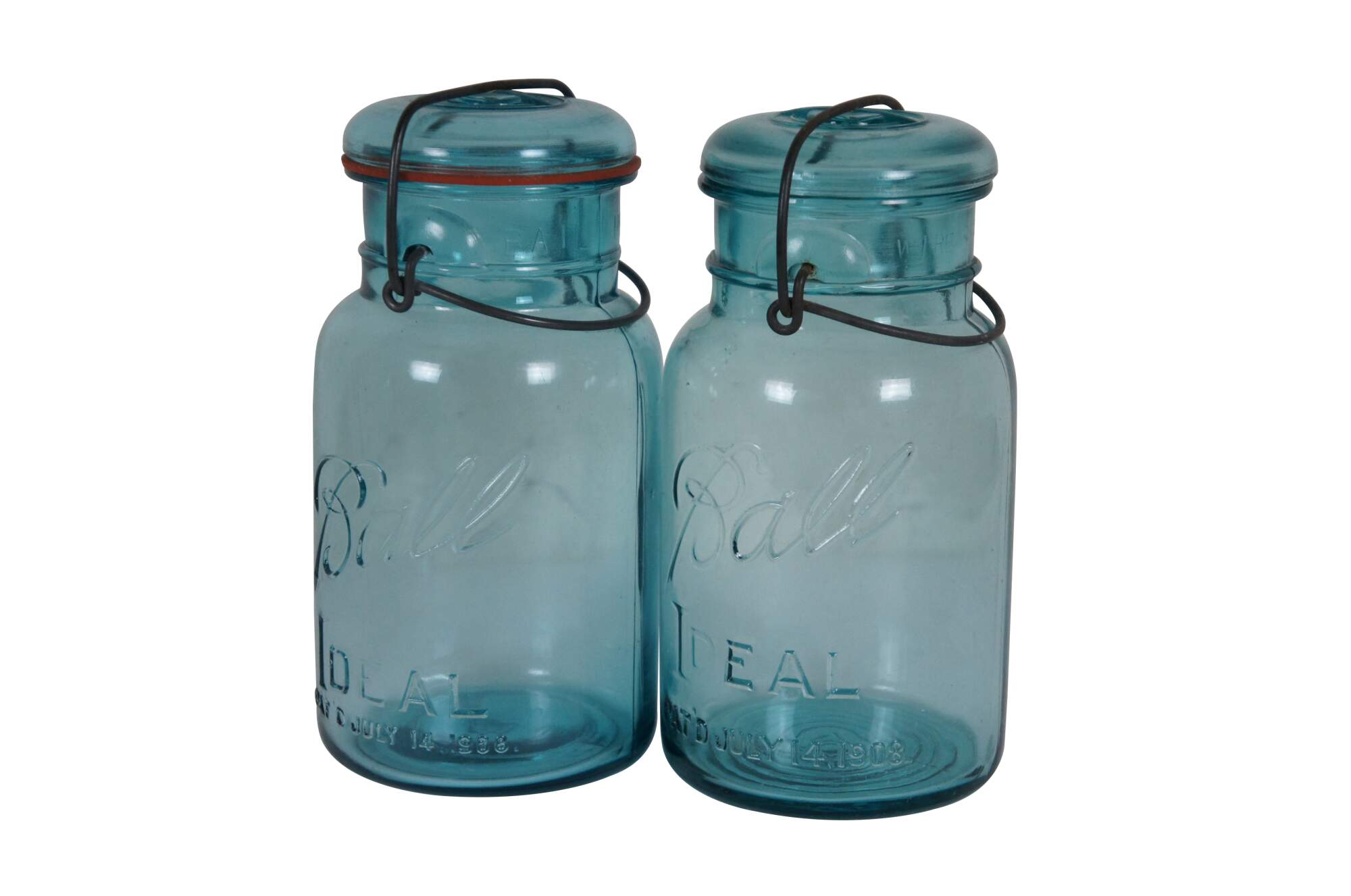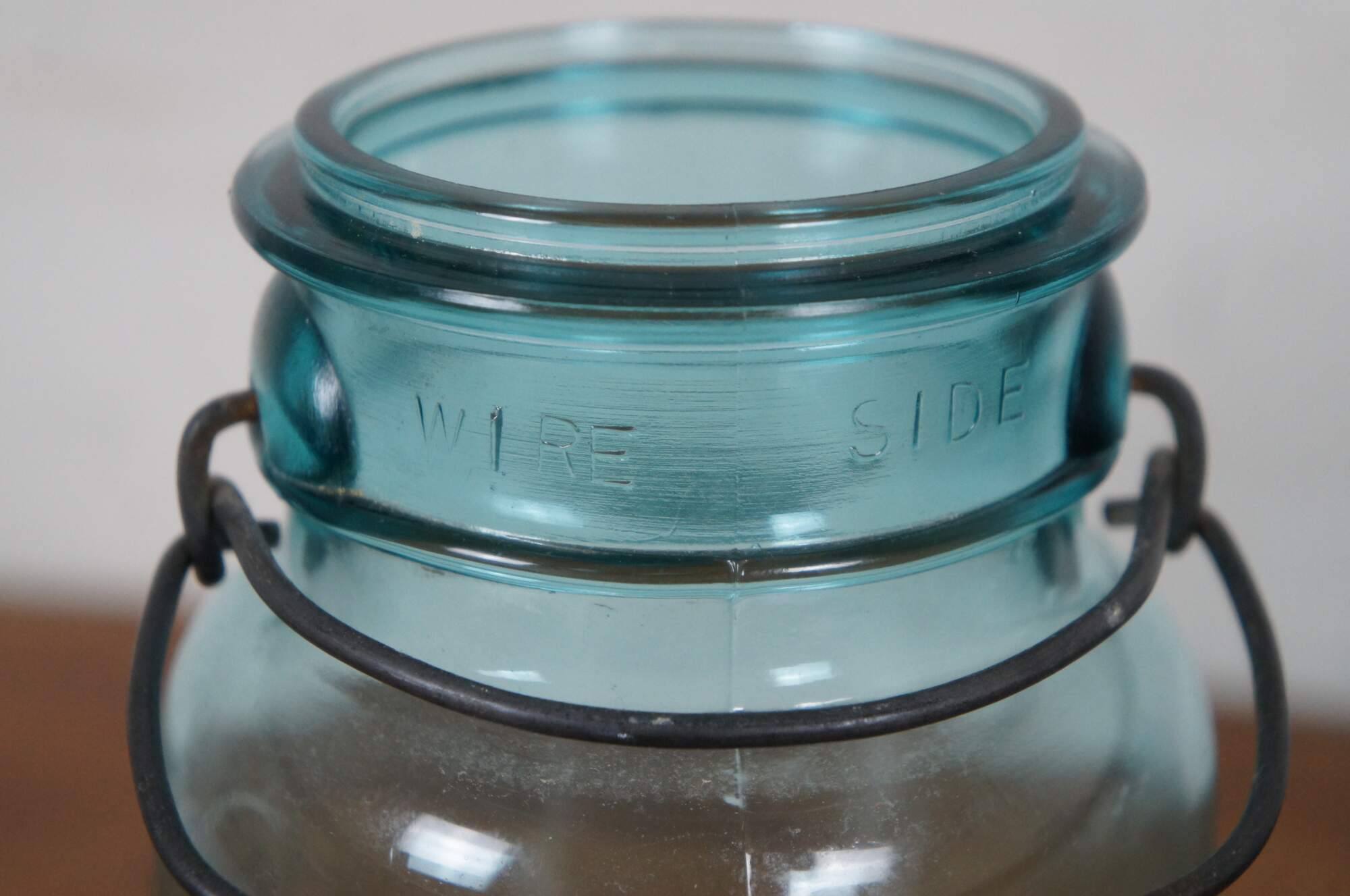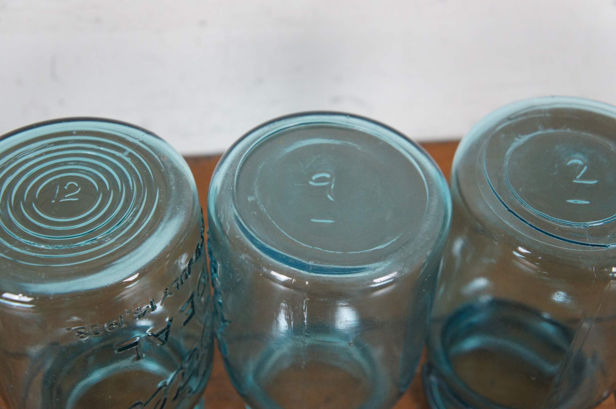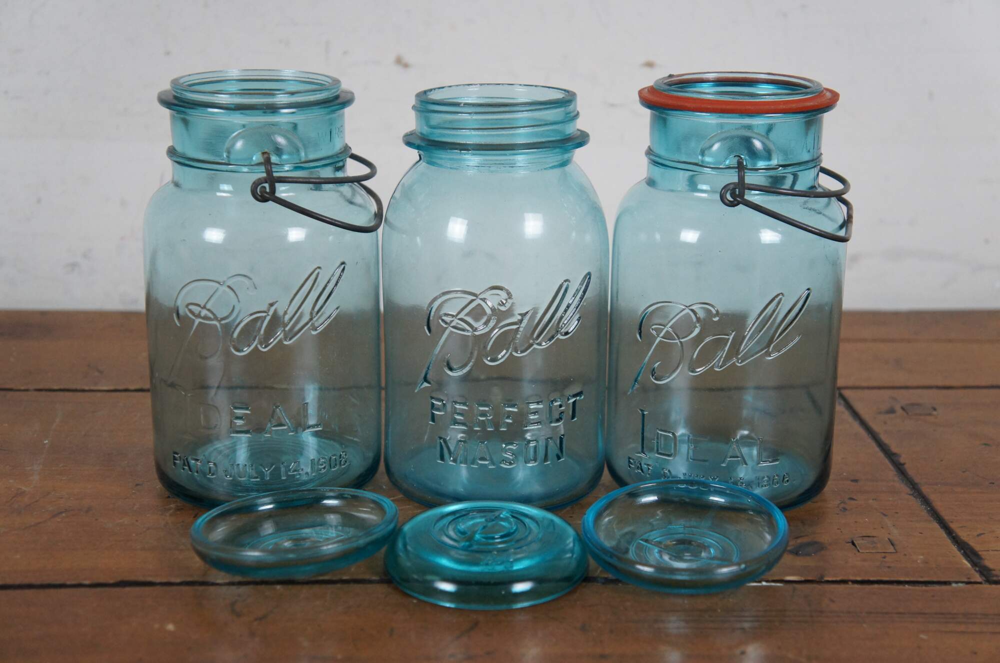 Set of 3 early 20th century Ball Perfect Mason and Ideal blue glass canning jars with wire bail closure on two, screw top on one, & three glass lids. Approximately pint and a half or 32 oz capacity. Bases labeled 12, 9 and 2 underneath. Mark used from 1923-1933.