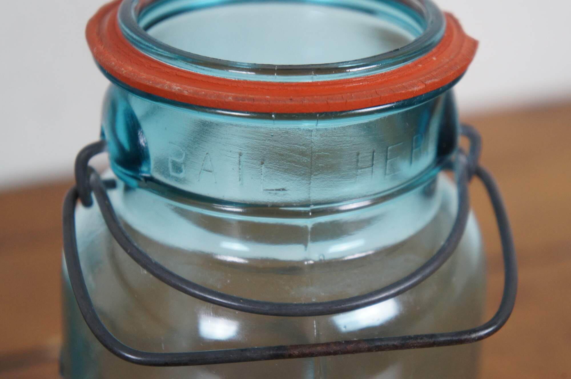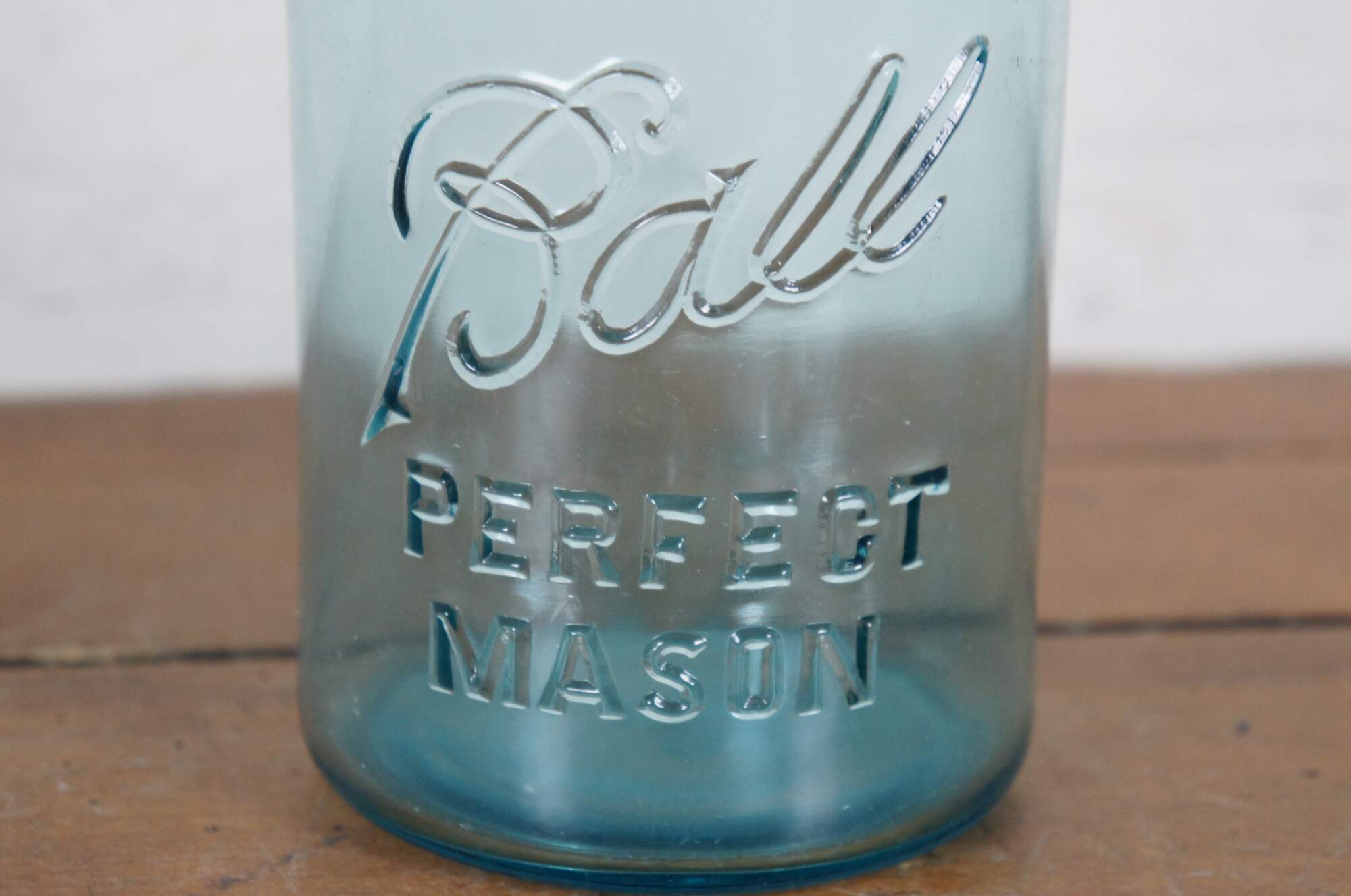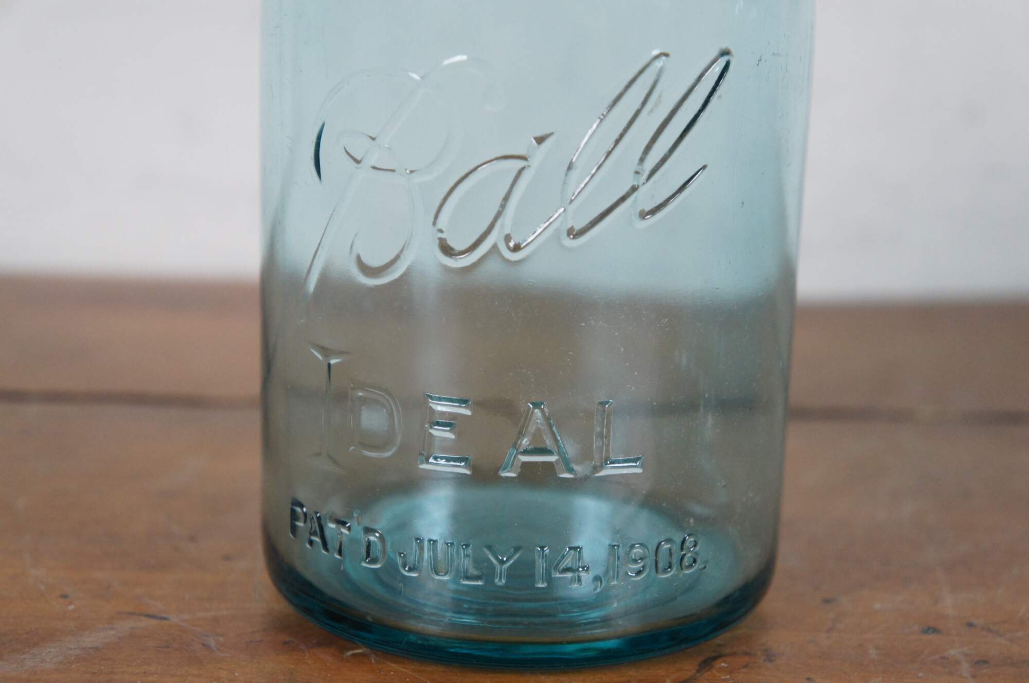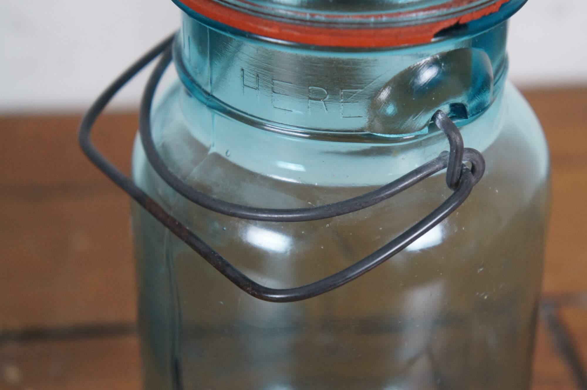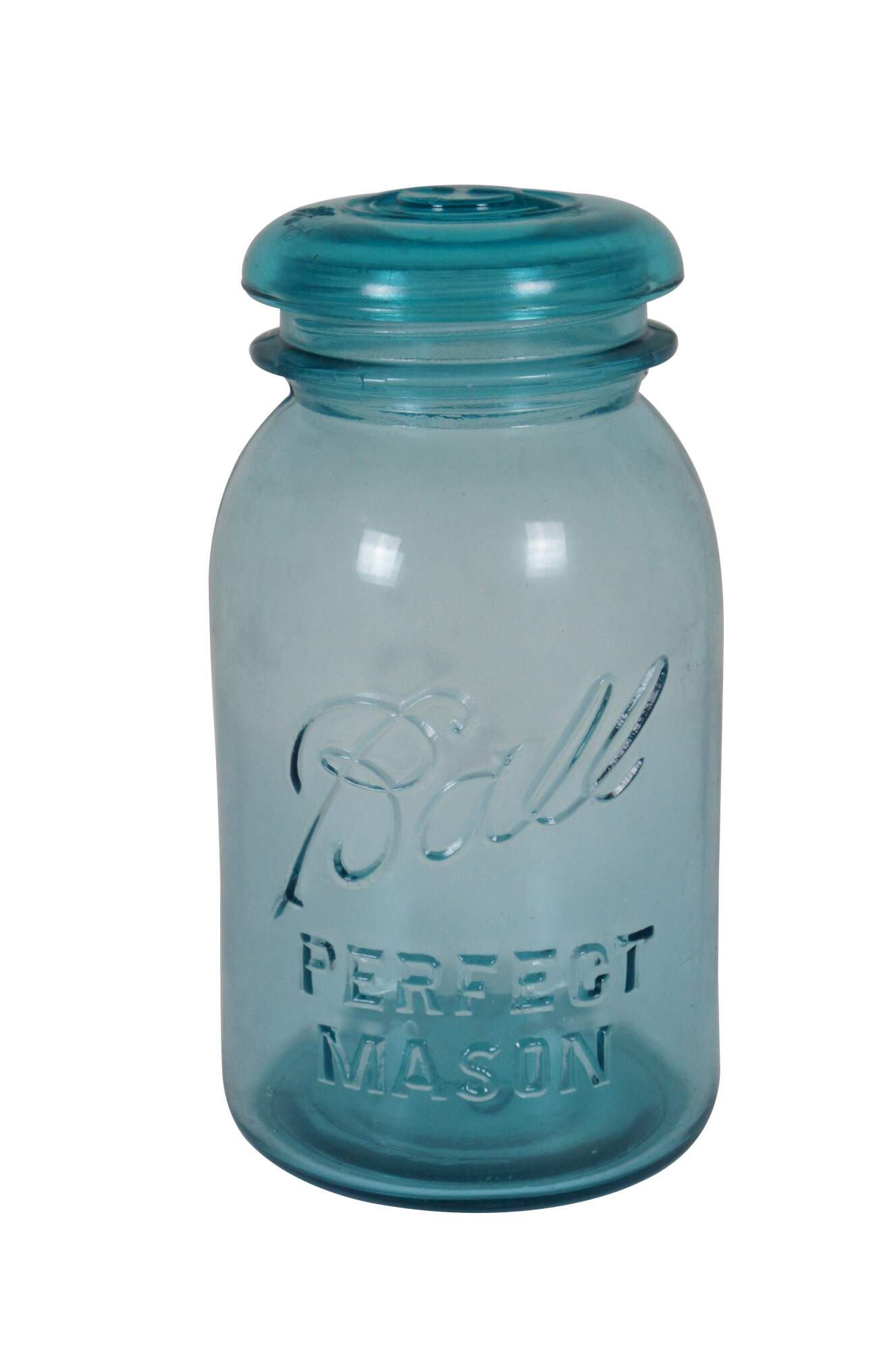Set of 3 early 20th century Ball Perfect Mason and Ideal blue glass canning jars with wire bail closure on two, screw top on one, & three glass lids. Approximately pint and a half or 32 oz capacity. Bases labeled 12, 9 and 2 underneath. Mark used from 1923-1933.