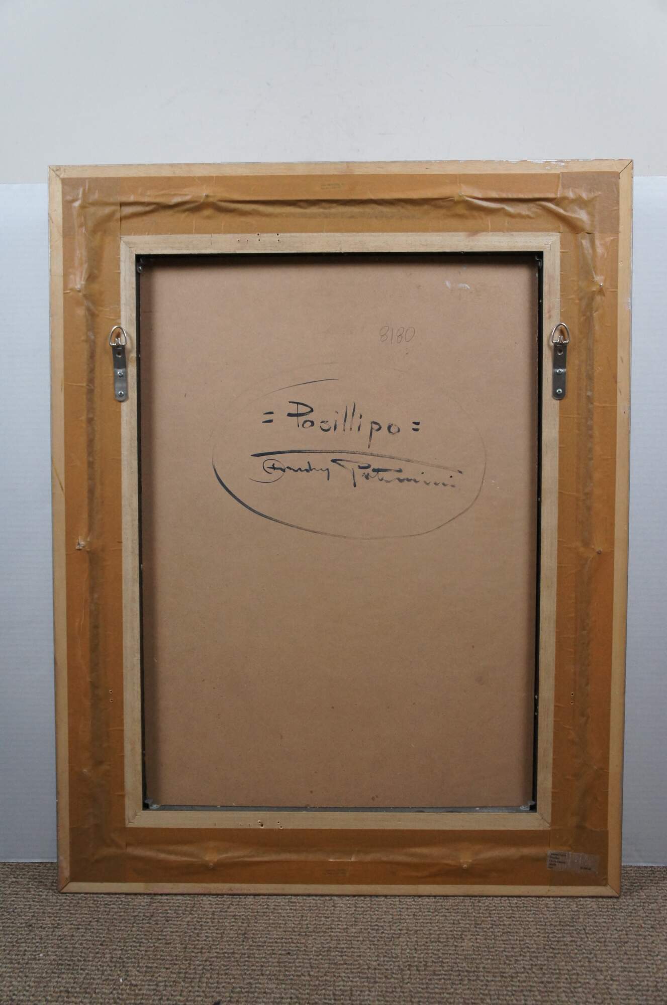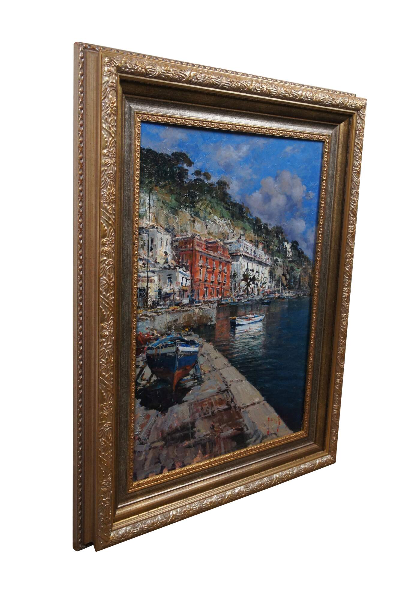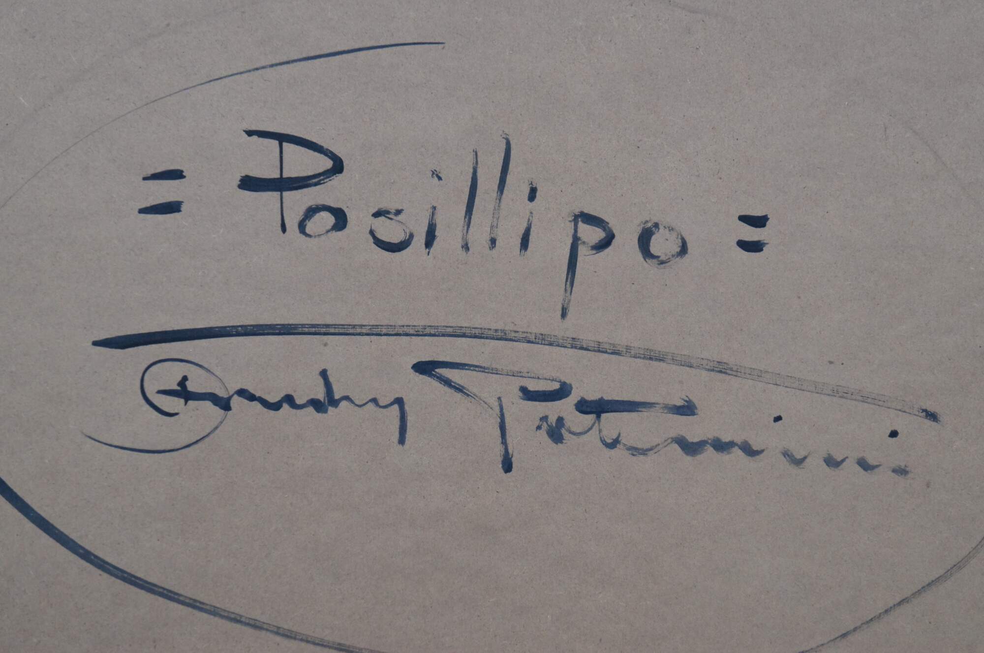 Late 20th century Italian seascape oil painting on board titled Posillipo by Andrea Patrisi, depicting a harbour view of the residential area of Posillipo on the Gulf of Naples. Signed in lower right corner. Signed and titled on reverse. Beveled gold frame.