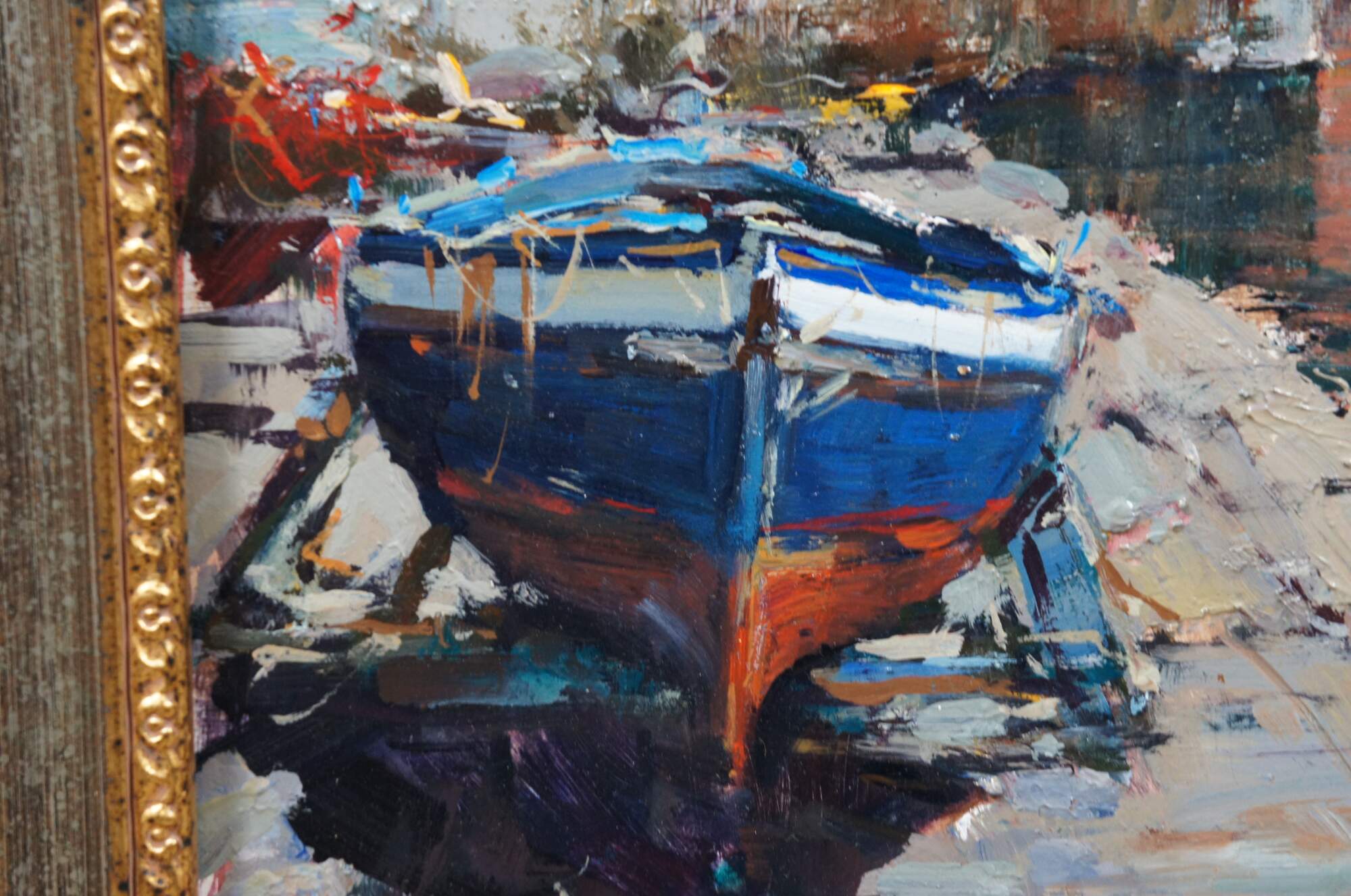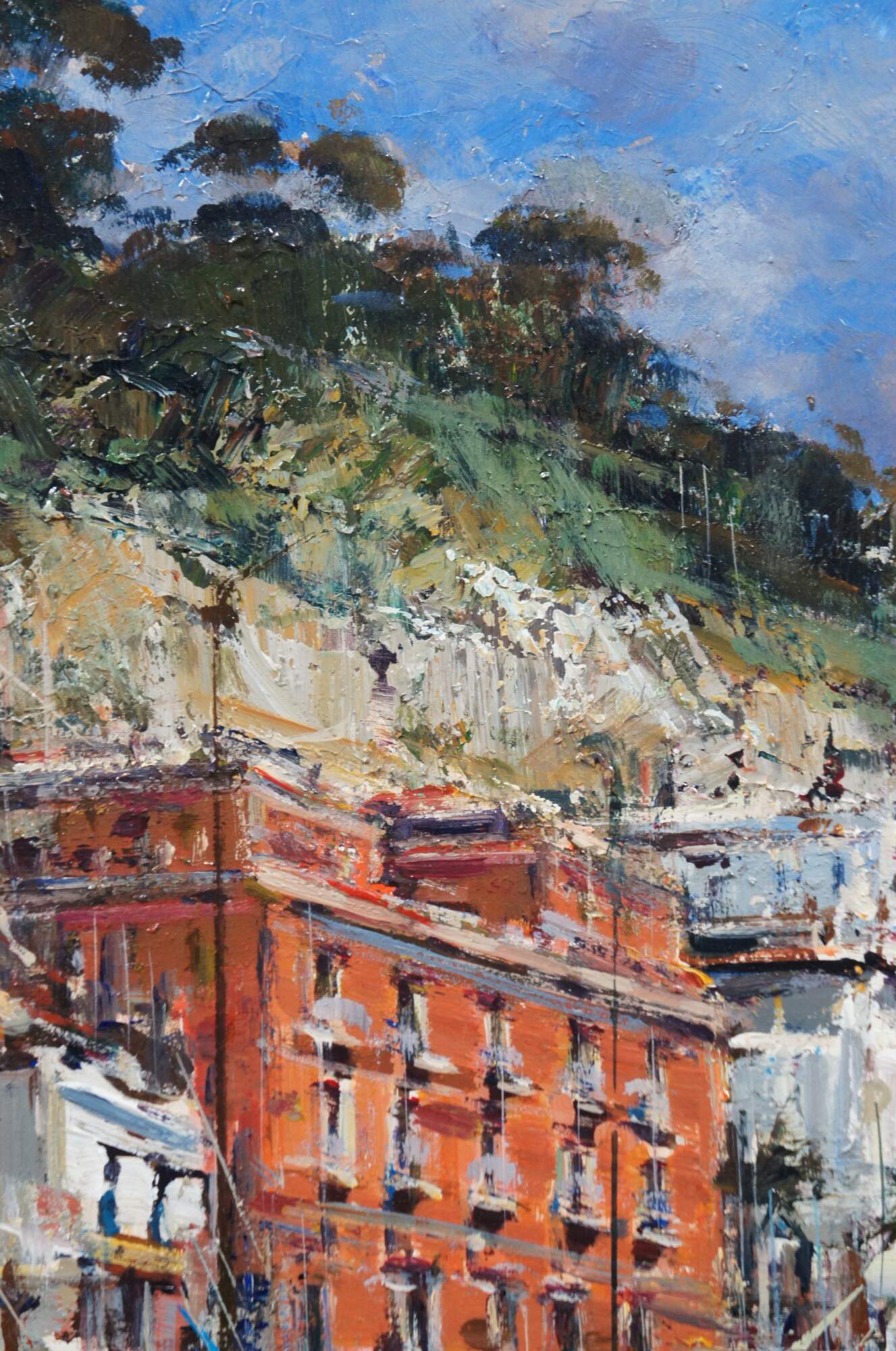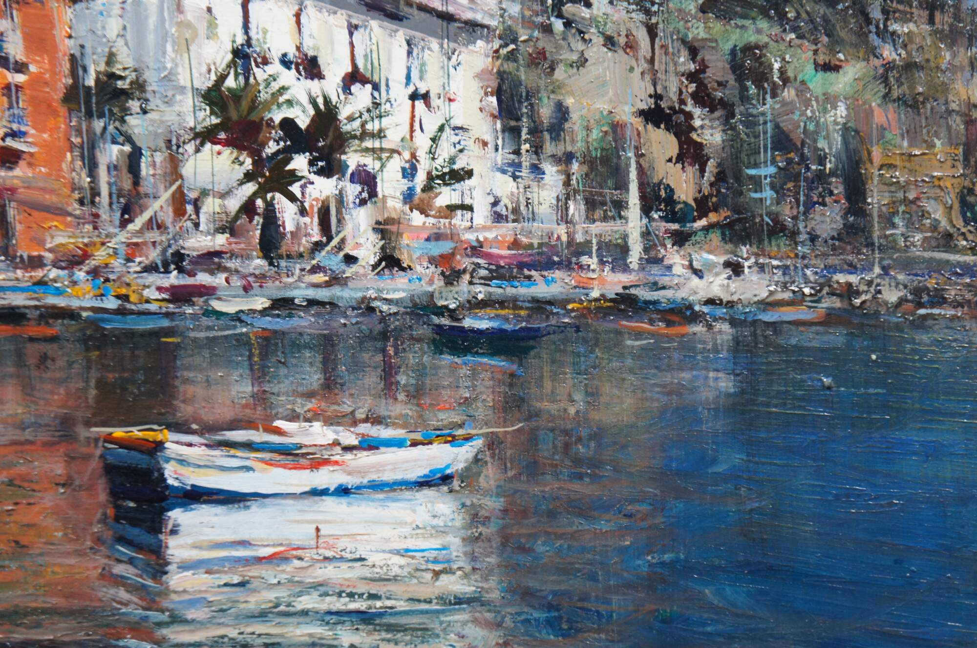 Late 20th century Italian seascape oil painting on board titled Posillipo by Andrea Patrisi, depicting a harbour view of the residential area of Posillipo on the Gulf of Naples. Signed in lower right corner. Signed and titled on reverse. Beveled gold frame.