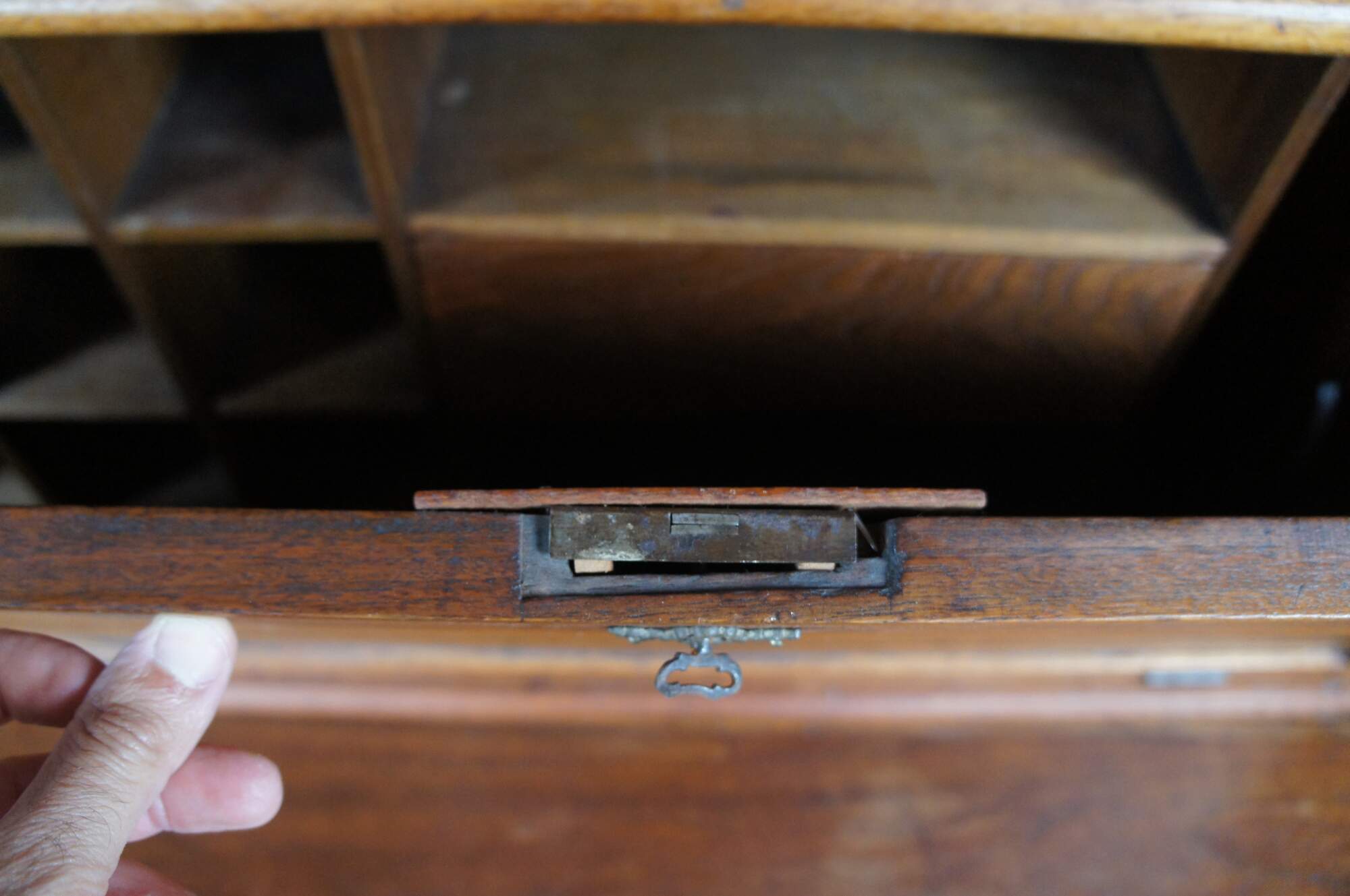 Plantation desk were prodominately seen in the 19th century and used on Southern plantations to manage the day-to-day operations of the farm. It is a variation of the secretary style drop front desk, with a deeper bottom part that supports the fall front. The desk's work surface can be raised to close off the drawers and pigeonholes in front.