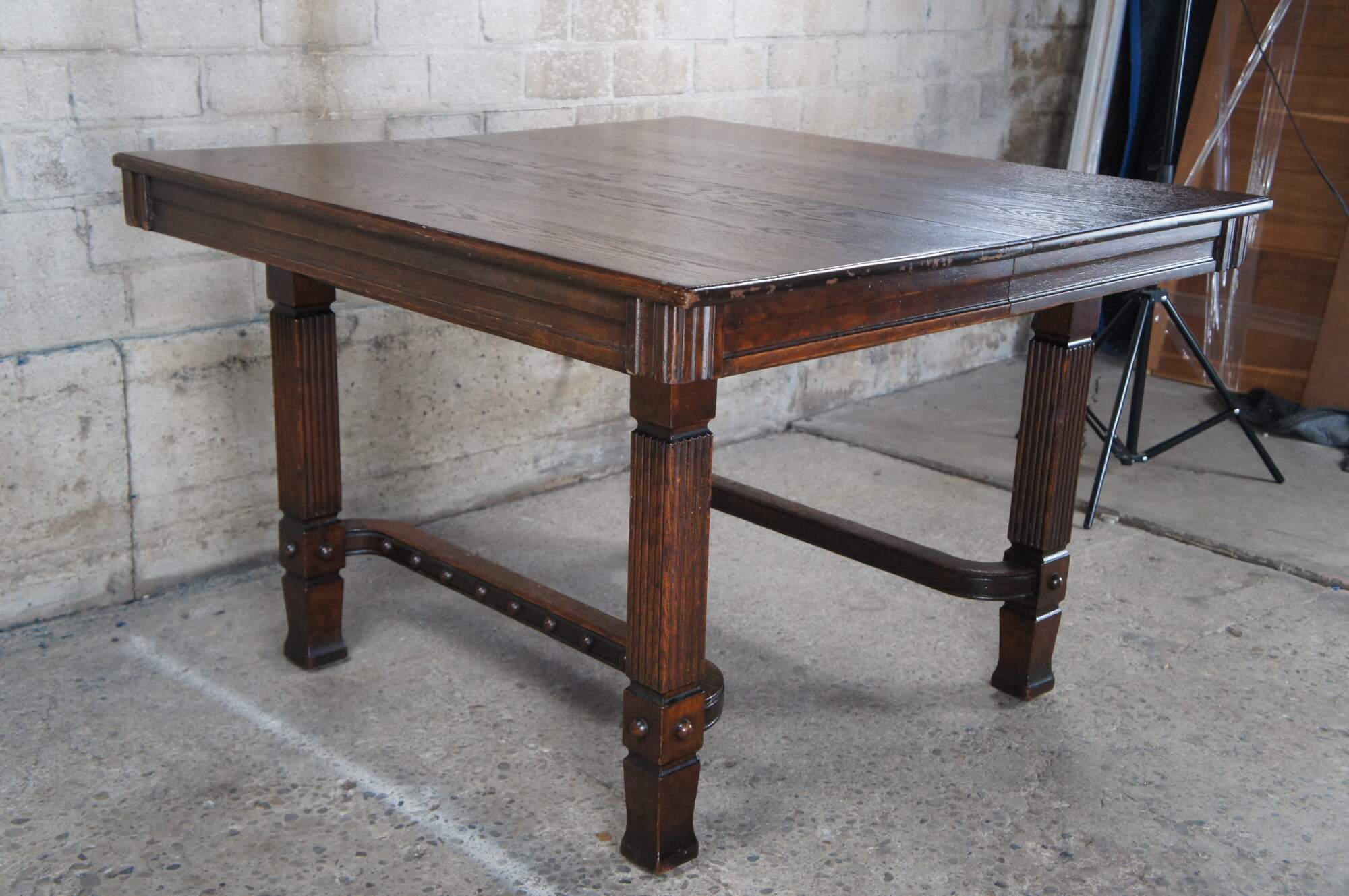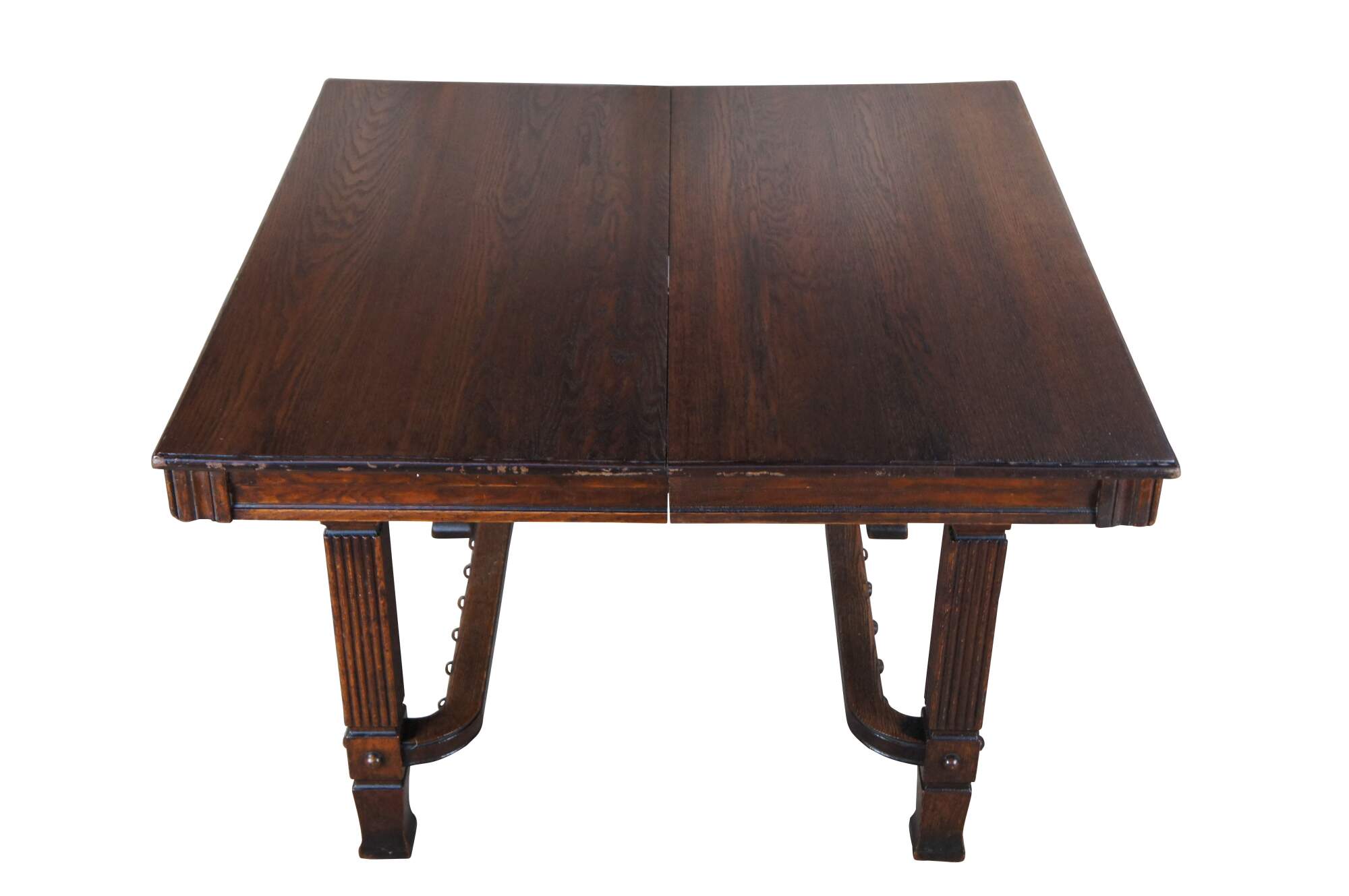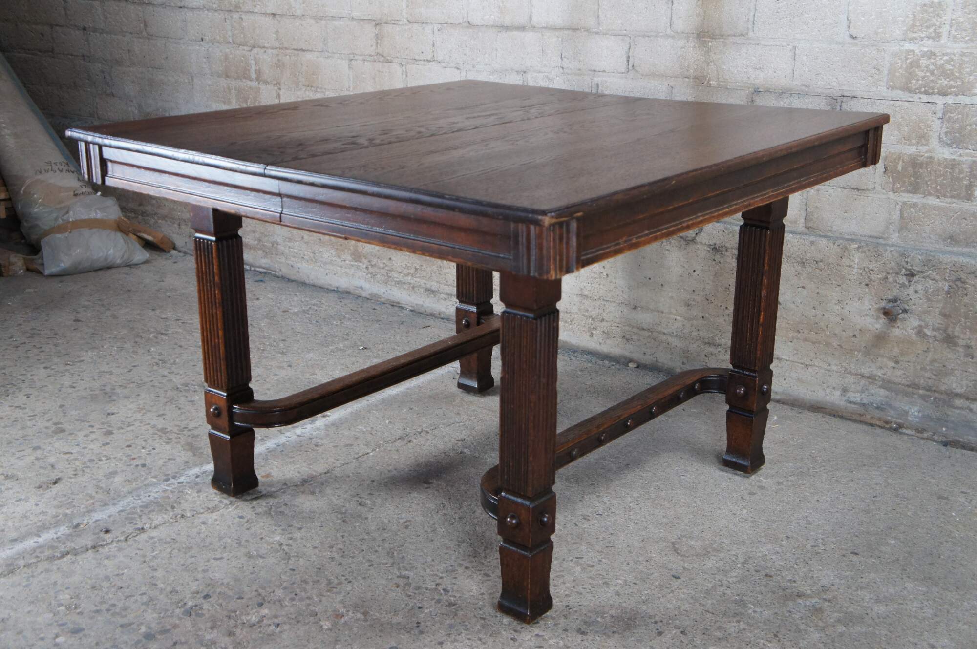 Late Victorian extendable Oak Dining / Breakfast table. Features oak construction with thick square fluted legs connected by contoured stretchers with convex orbs. The table extends with two leaves and has a central pedestal leg that can be removed when not in use.