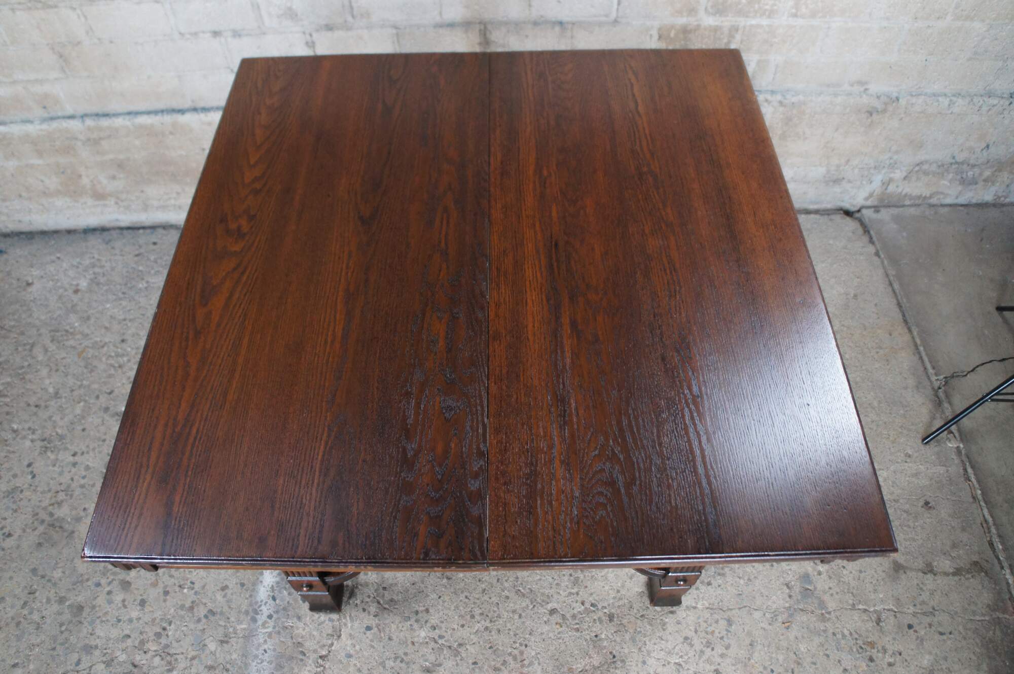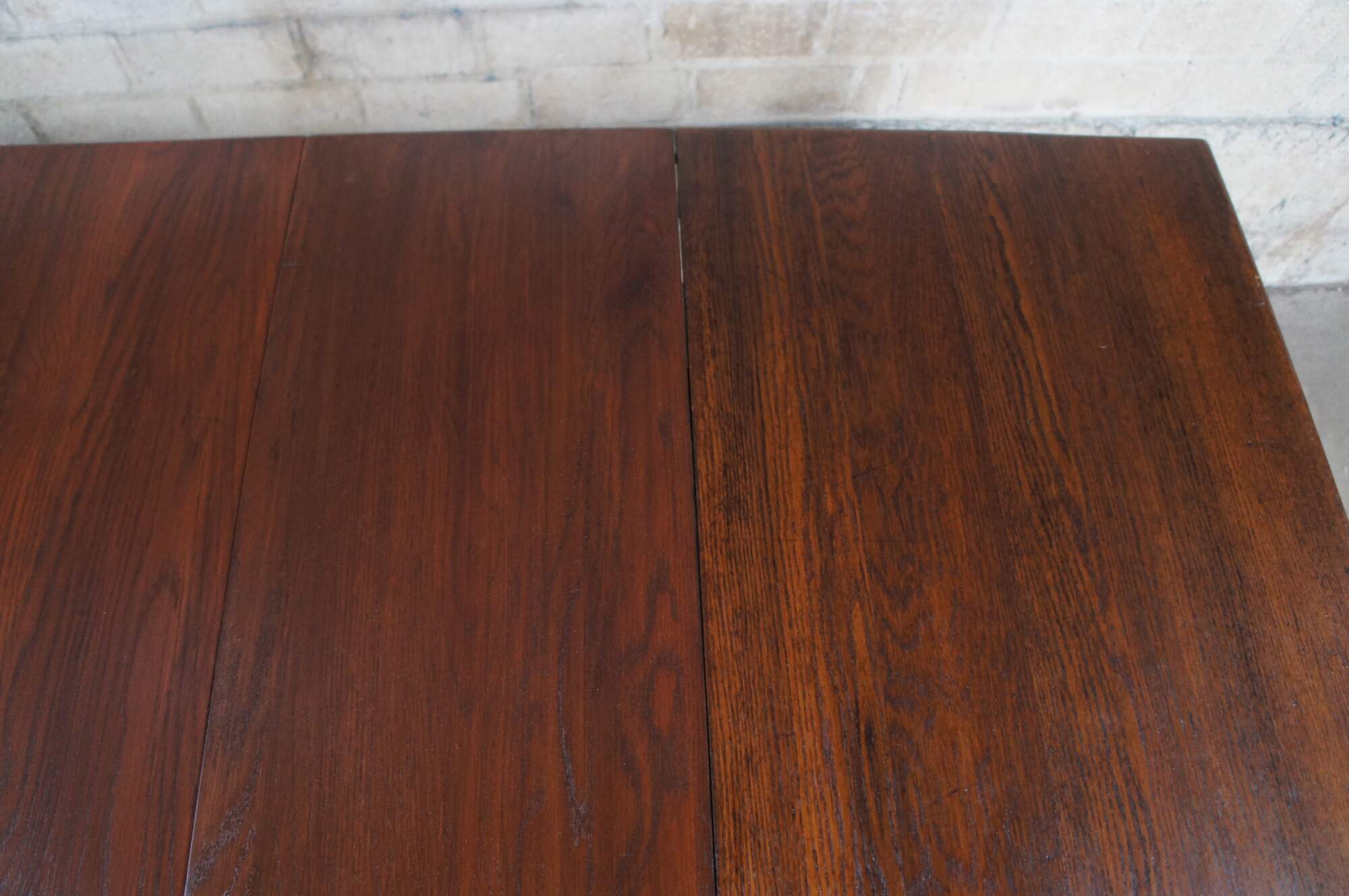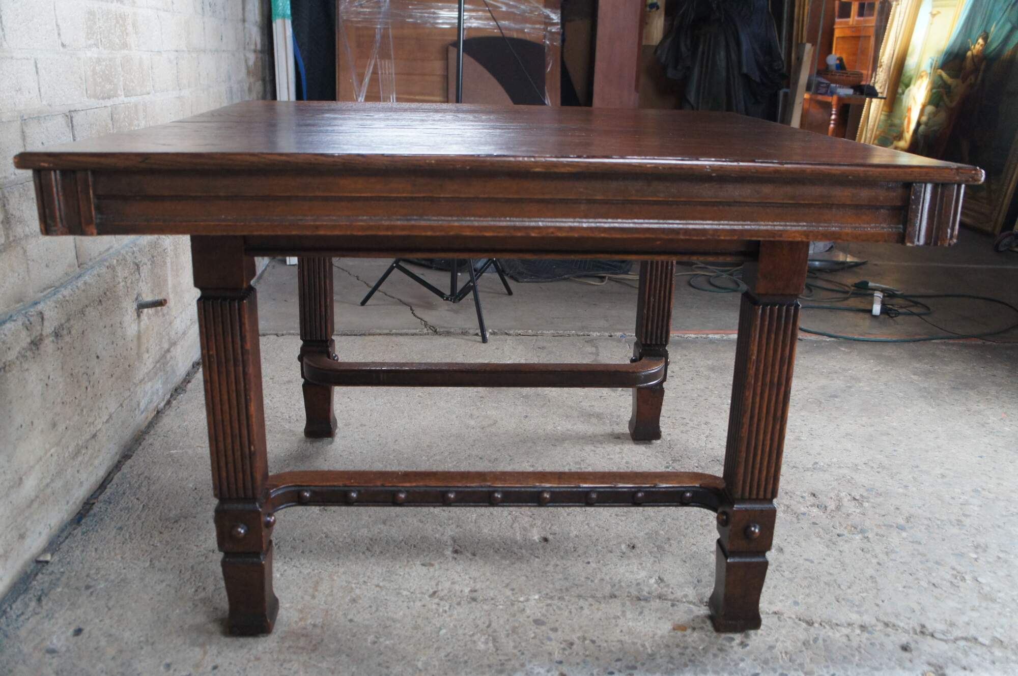 Late Victorian extendable Oak Dining / Breakfast table. Features oak construction with thick square fluted legs connected by contoured stretchers with convex orbs. The table extends with two leaves and has a central pedestal leg that can be removed when not in use.